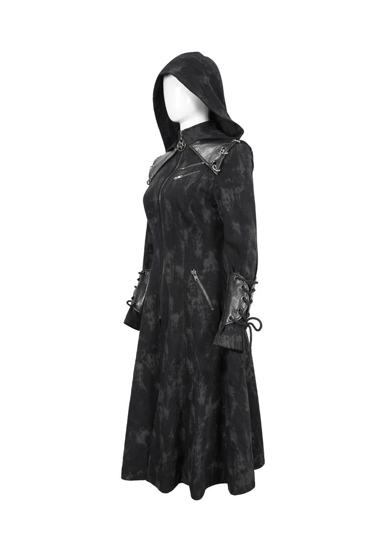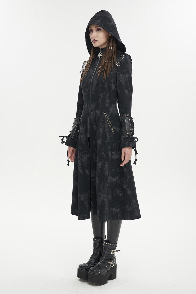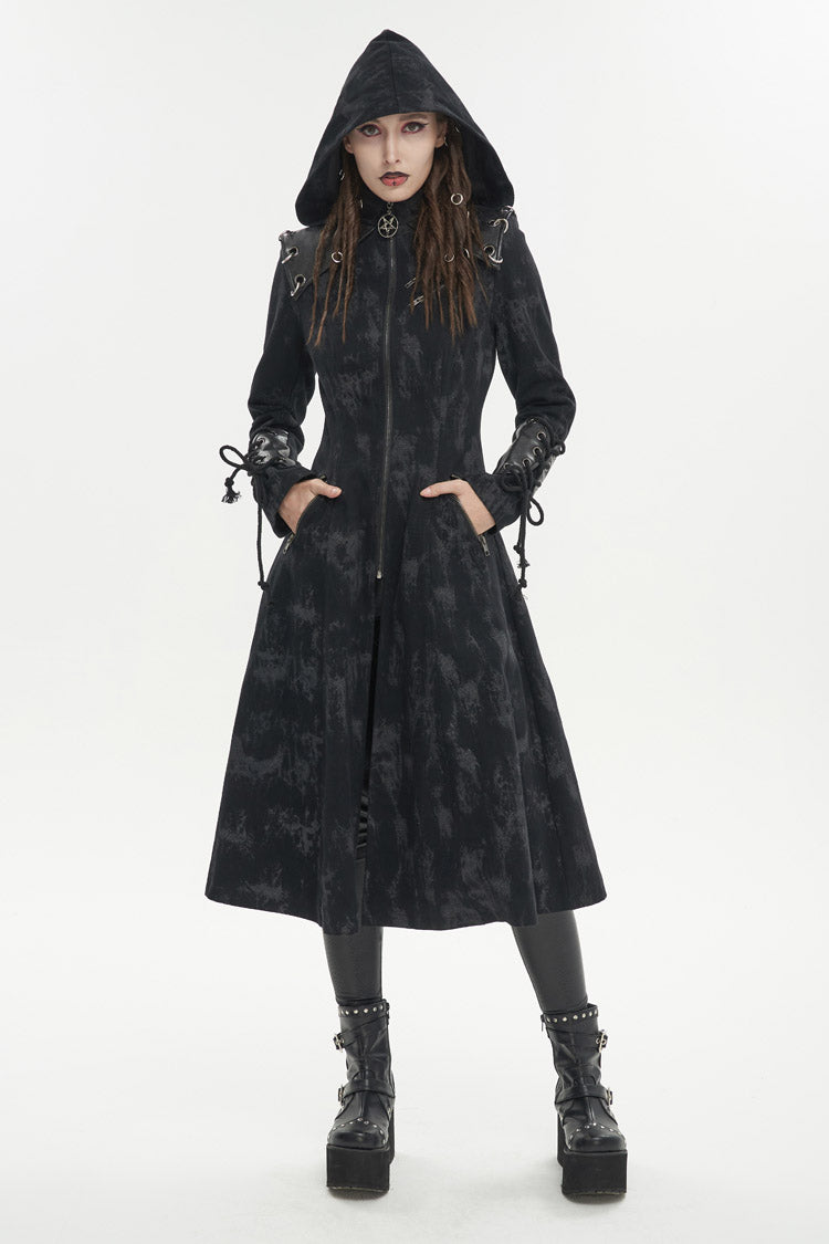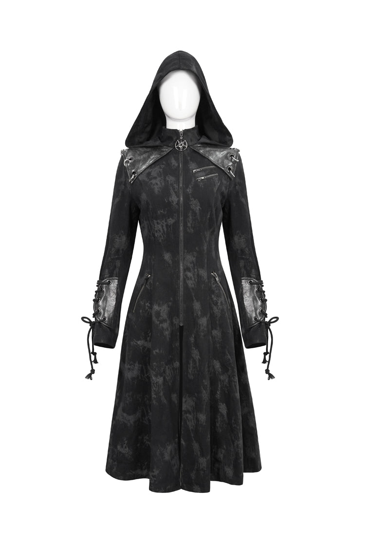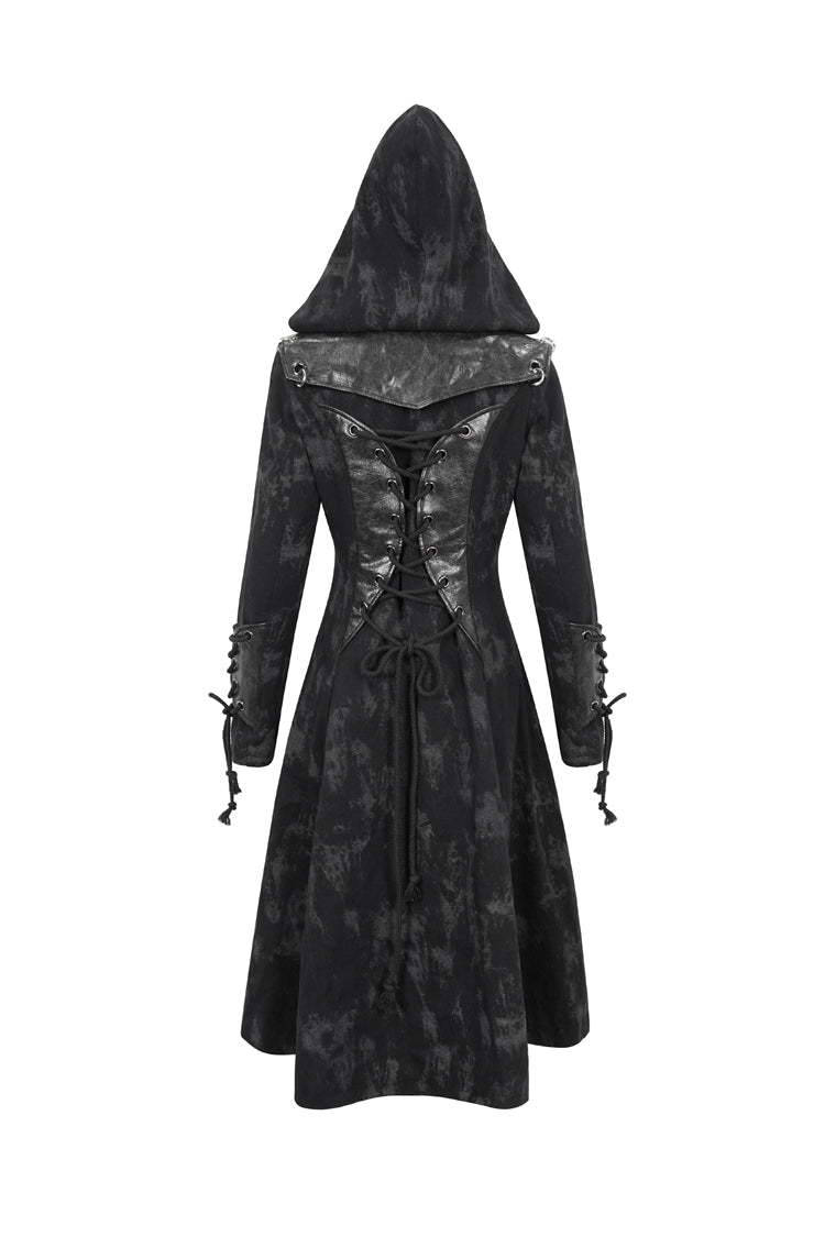 Le tissu sergé imprimé de manière irrégulière est cousu avec du cuir à grain rugueux, avec des cornes sur les épaules et des anneaux métalliques suspendus pour la décoration.