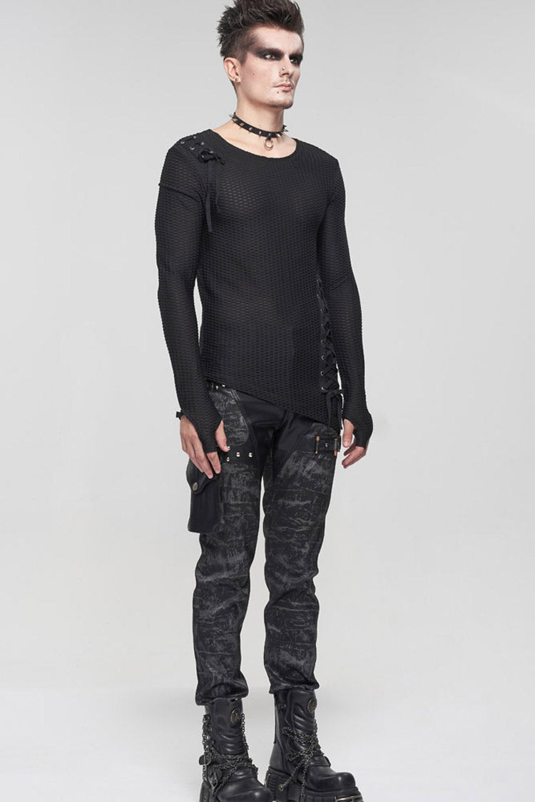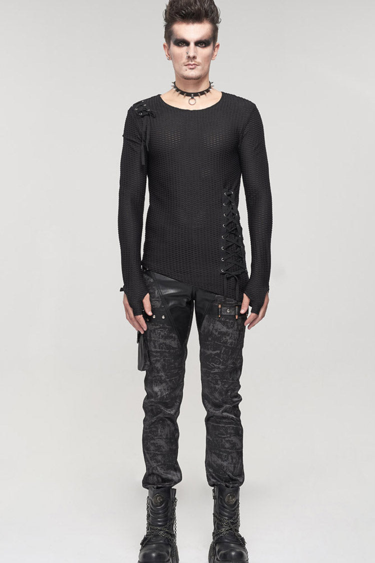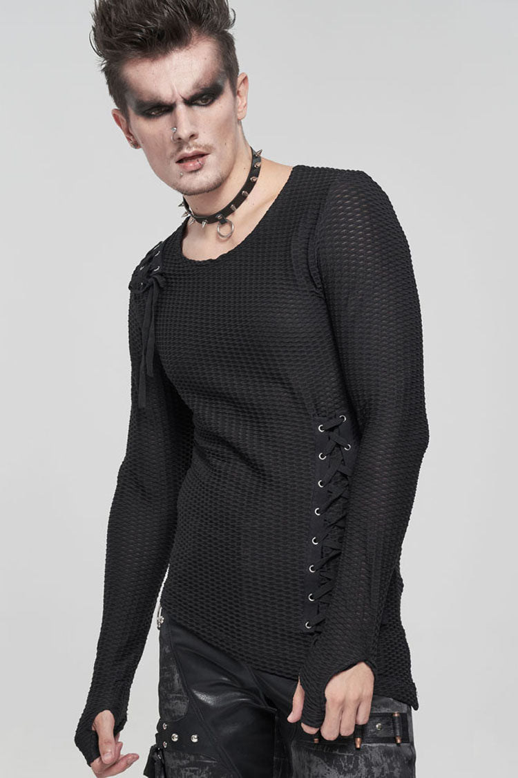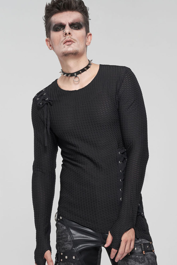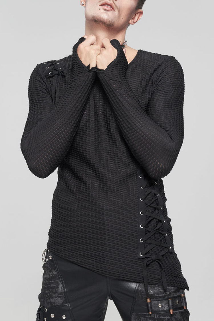 L'ensemble de la pièce est fabriqué en tissu à mailles grossières avec une bonne élasticité. L'épaule et la taille sont en sangle de voiture asymétrique avec œillets et cordons de serrage. L'ourlet biseauté et les poignets peuvent être couverts avec les doigts. Convient pour un usage quotidien.