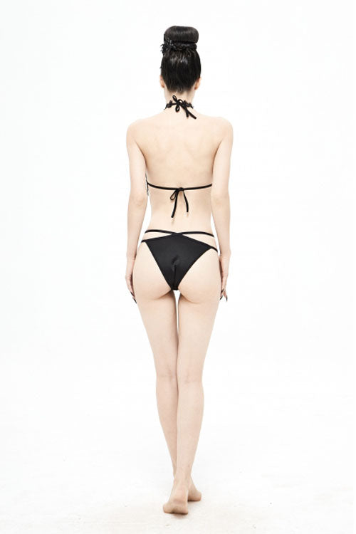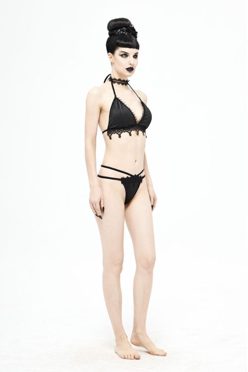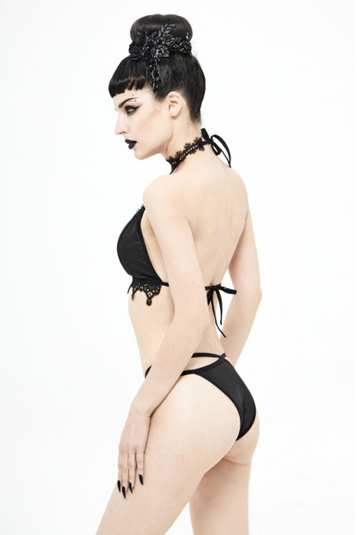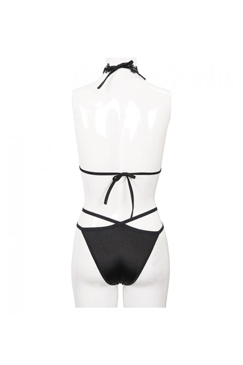 Le tissu principal est composé de tissu de maillot de bain super-élastique noir, avec de la dentelle gothique, la dentelle autour du cou est attachée à l'arrière, le lien arrière peut être ajusté, le coton de la poitrine peut être retiré, et les bretelles du maillot de bain sont faites d'élastique. Tous les travaux et fils sont dédiés aux maillots de bain pour obtenir une plus grande élasticité et améliorer le confort.