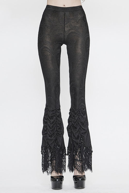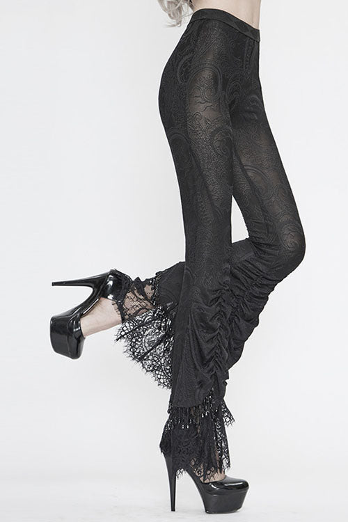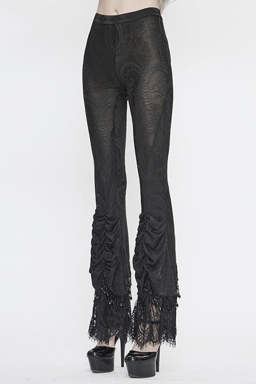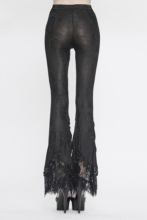 L'ensemble de la pièce est en matière jacquard tricotée, l'ourlet est séparé par une frange en cils, et l'ouverture de la jambe est plissée et décorée de galon perlé.