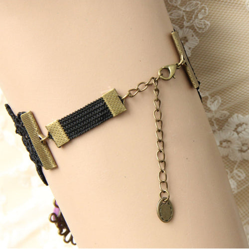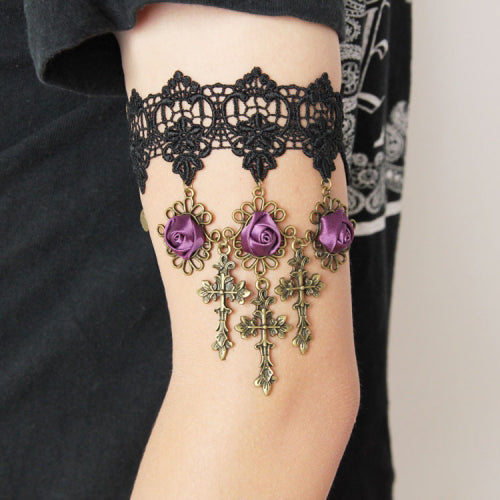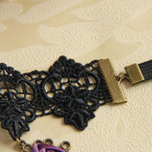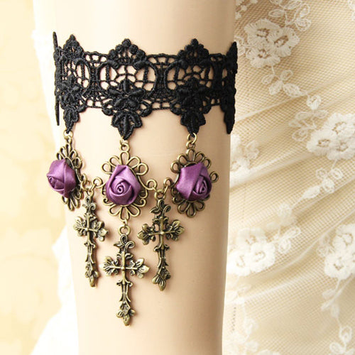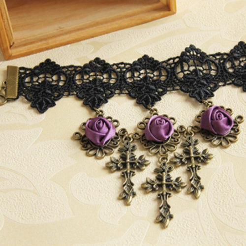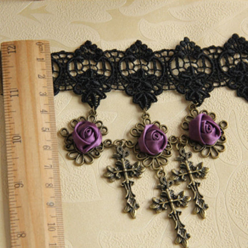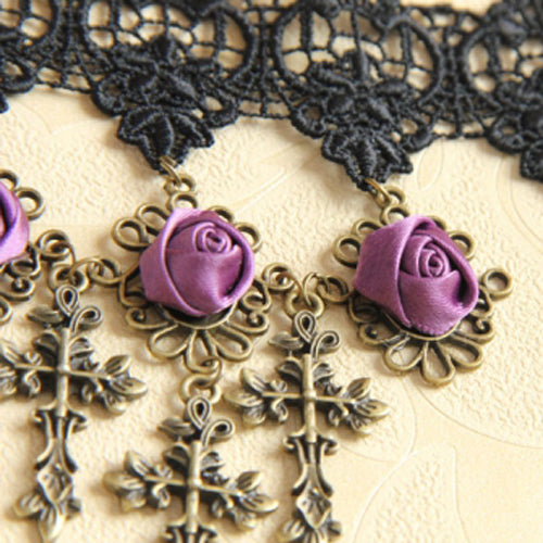 Matériaux: Dentelle Noire, Fleur en Ruban, Accessoires en Alliage de Bronze, Croix en Bronze, Bande Élastique