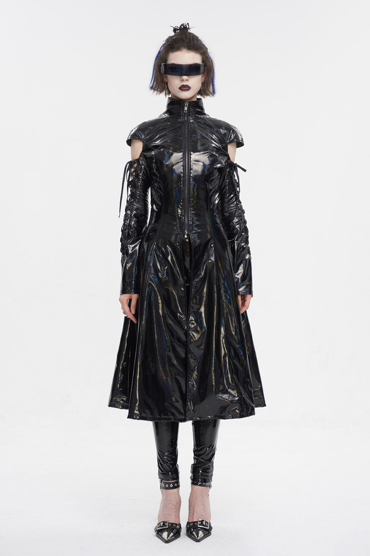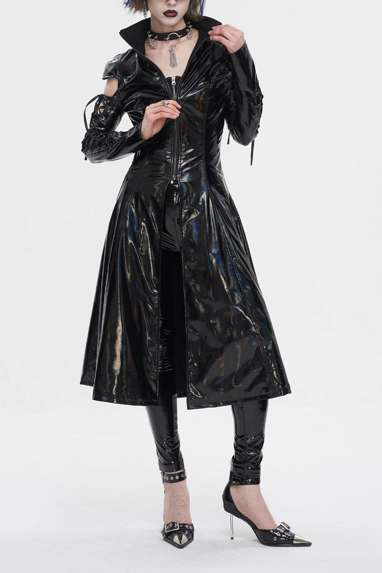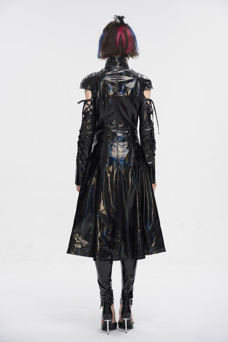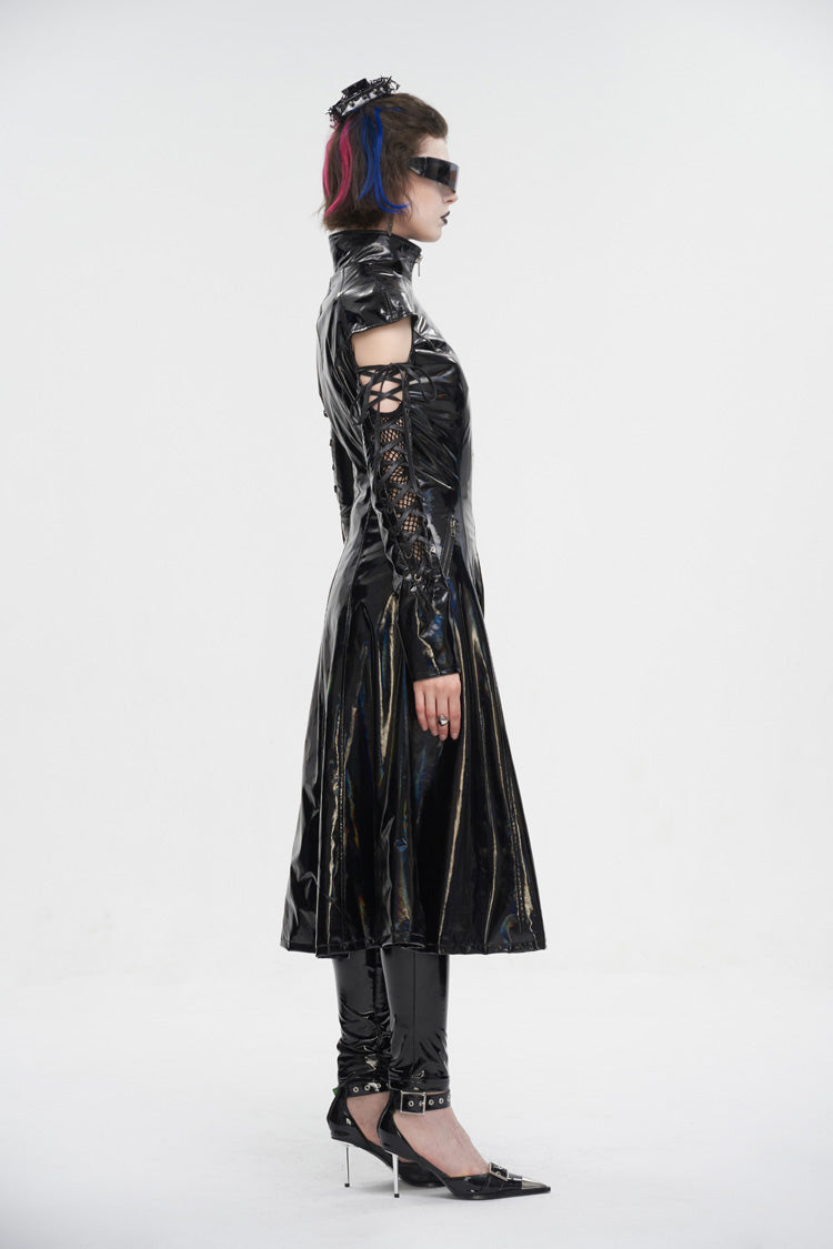 Le manteau punk est fabriqué en tissu de cuir verni et possède un col montant. Les manches sont ajourées et lacées. Fermeture éclair pour mettre et enlever. Silhouette en ligne A.