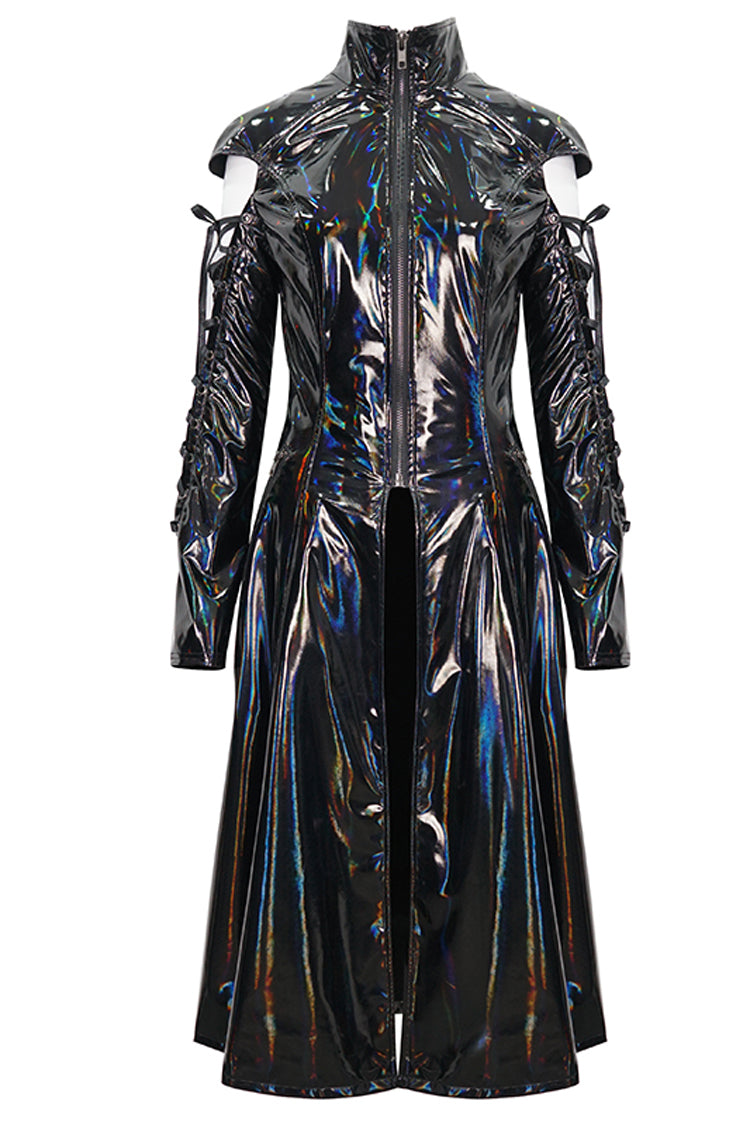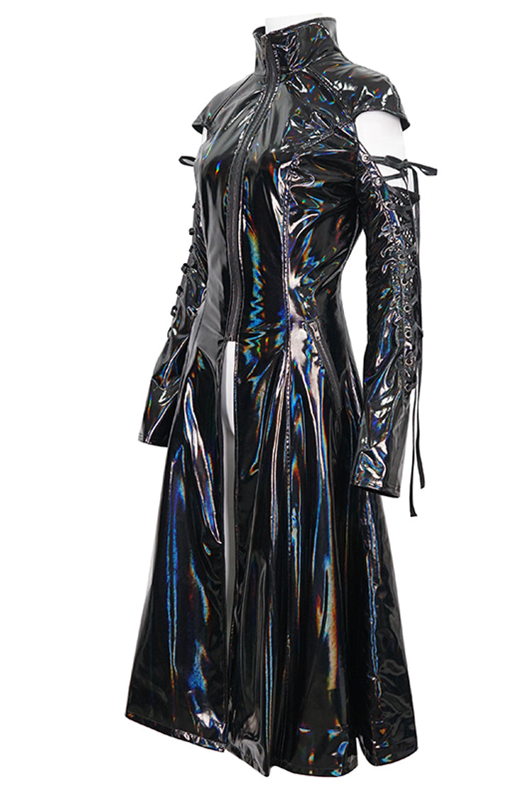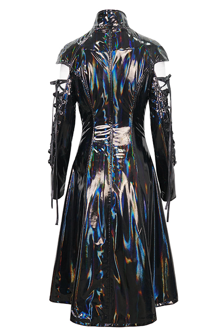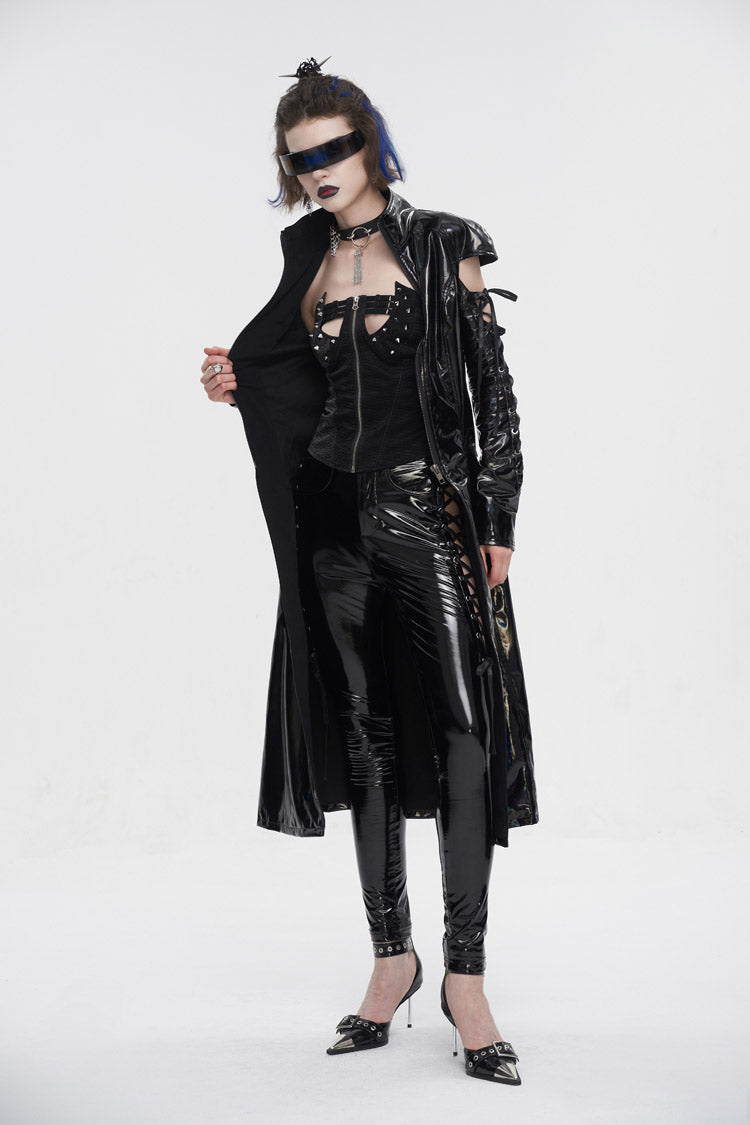 Le manteau punk est fabriqué en tissu de cuir verni et possède un col montant. Les manches sont ajourées et lacées. Fermeture éclair pour mettre et enlever. Silhouette en ligne A.