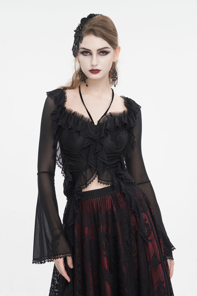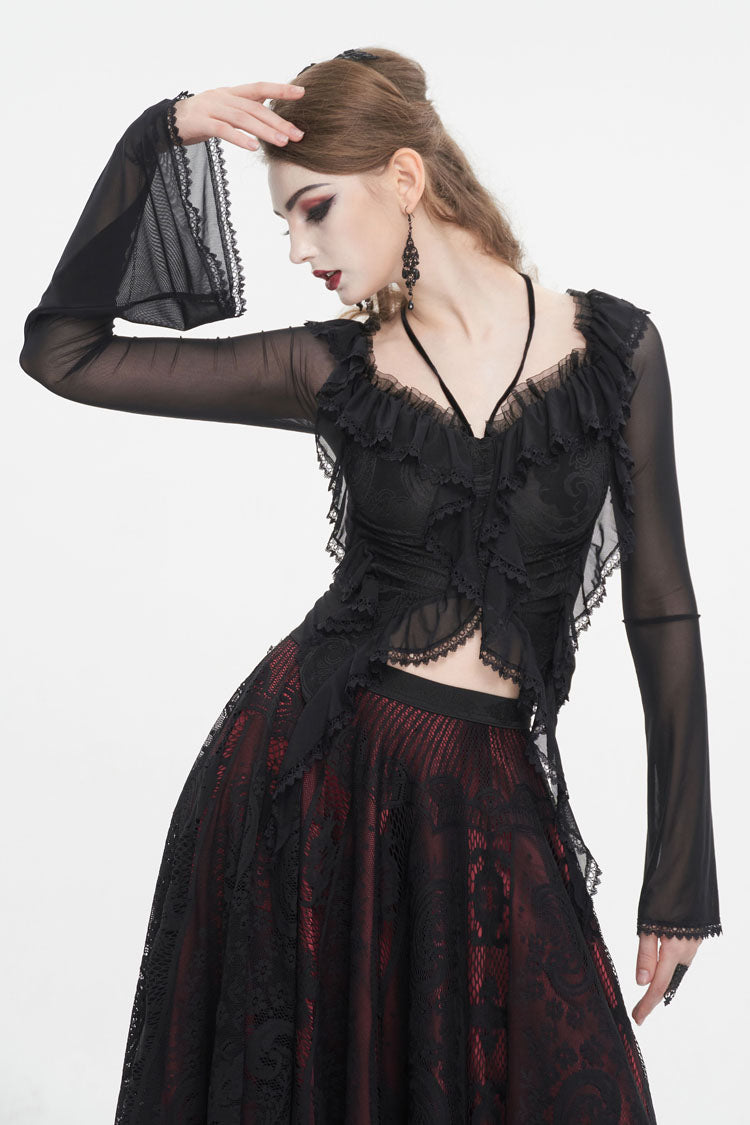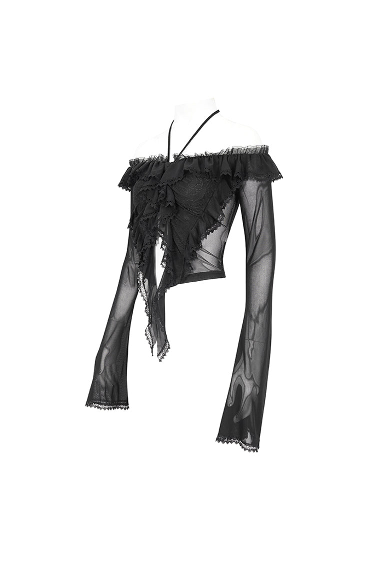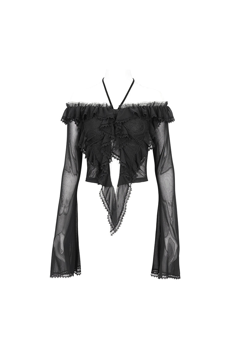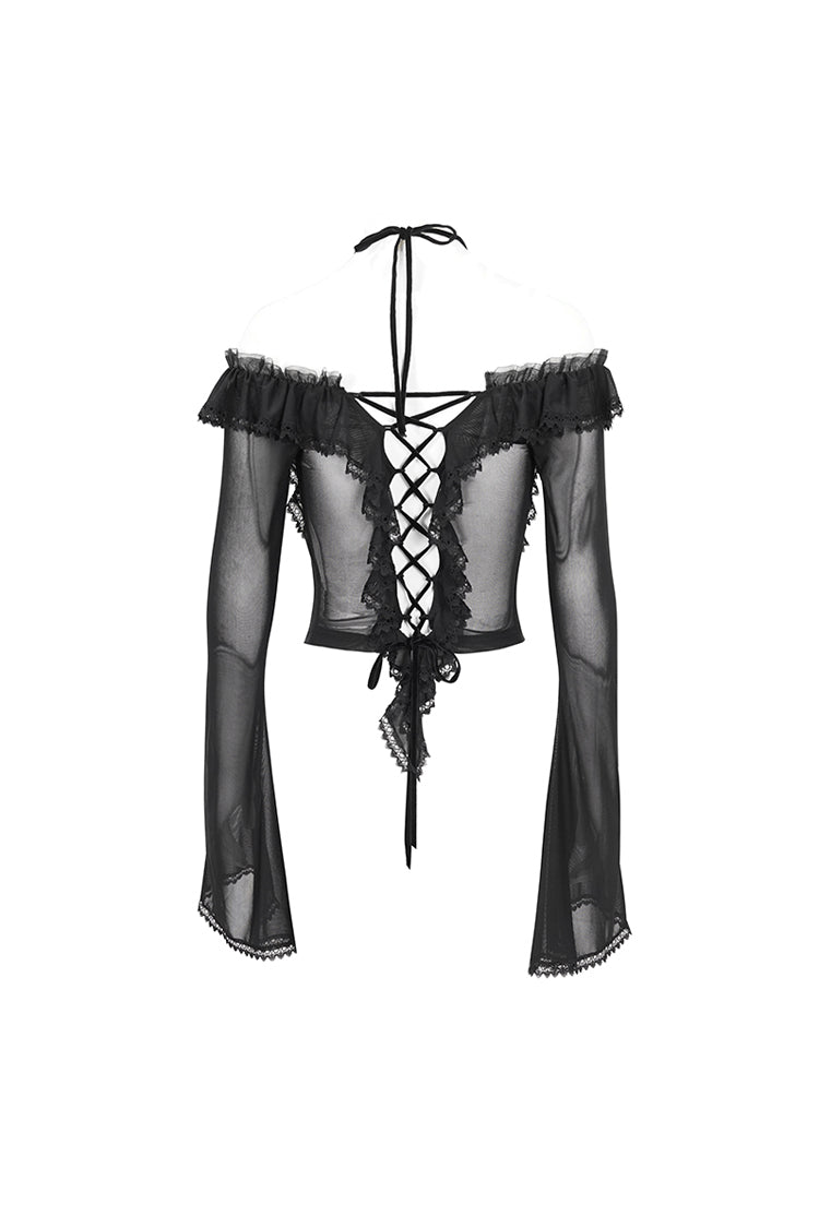 Cette chemise gothique est faite de tissu en maille. Elle a un col à volants, un col halter, un ourlet en dentelle et des manches évasées. Laçage dans le dos pour ajustement. Tissu super élastique et silhouette ajustée.