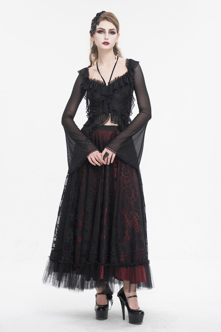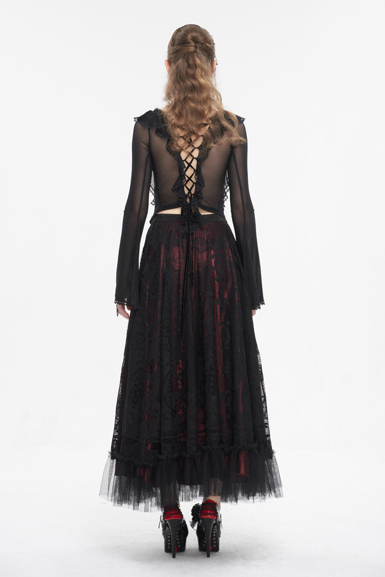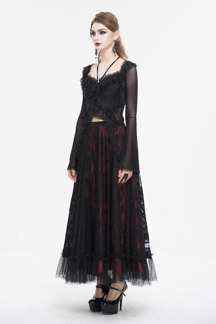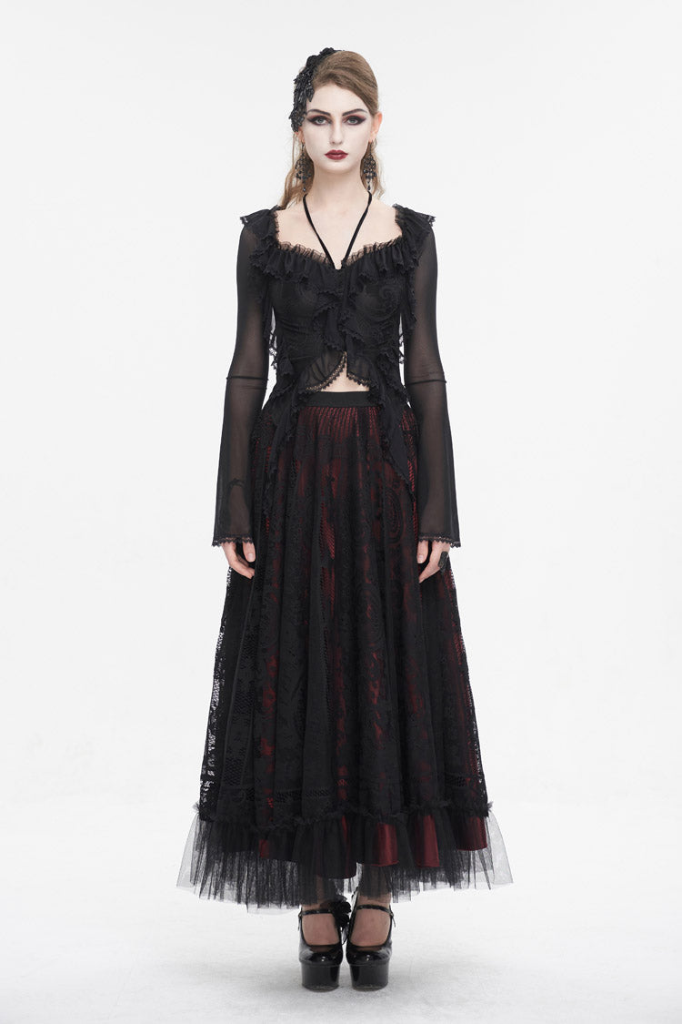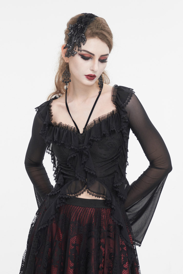 Cette chemise gothique est faite de tissu en maille. Elle a un col à volants, un col halter, un ourlet en dentelle et des manches évasées. Laçage dans le dos pour ajustement. Tissu super élastique et silhouette ajustée.