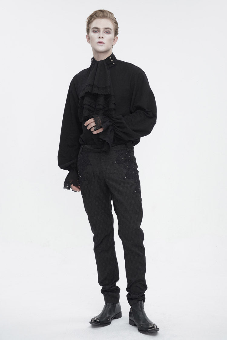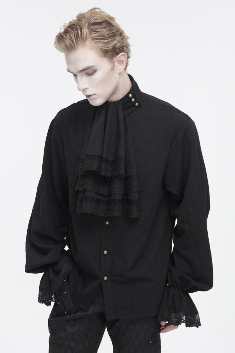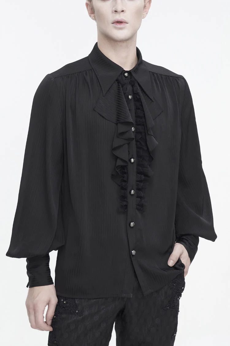 Cette chemise gothique a un col rabattu et des manches bouffantes. Les poignets sont lacés. De la dentelle à volants et du tulle sont décorés à l'avant. Pas de tissu élastique. Disponible en deux couleurs.