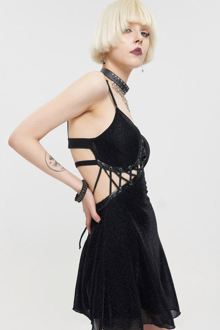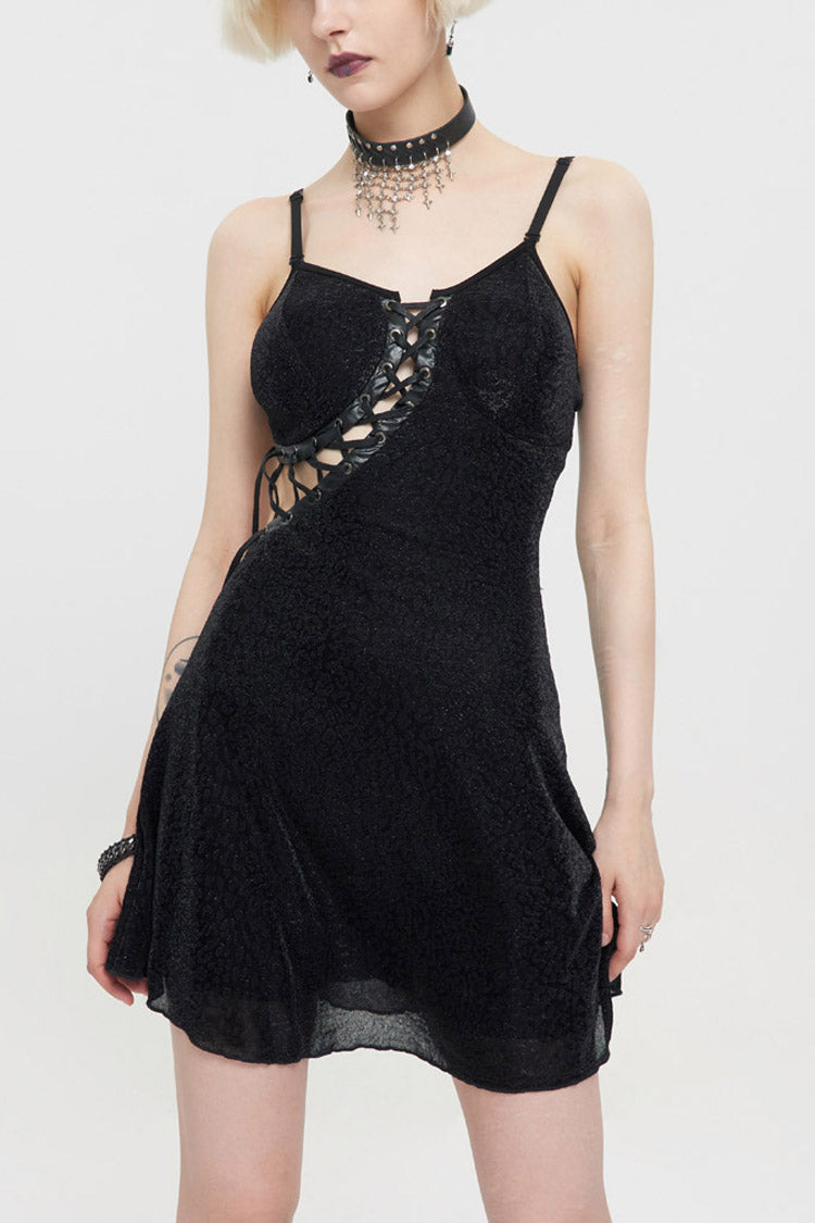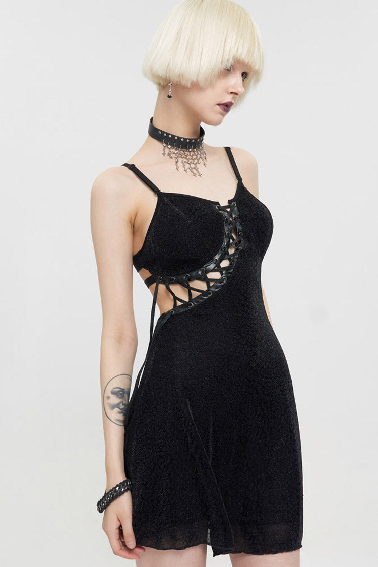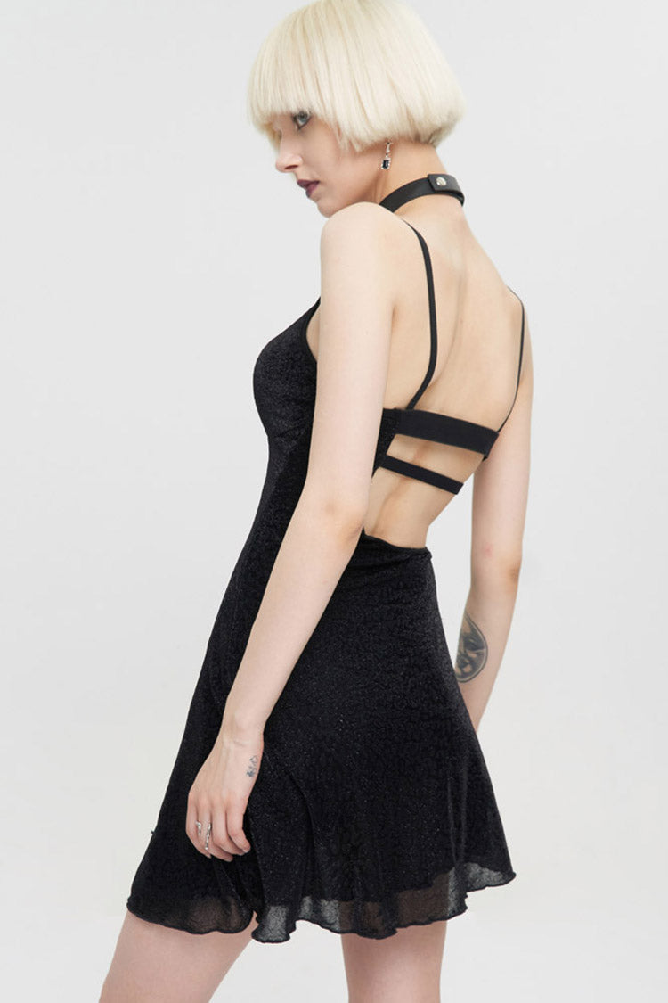 Le matériau principal est un tissu tricoté à imprimé léopard foncé, les ingrédients sont en cuir noir, les côtés gauche et droit sont asymétriques, et le dos est composé d'une bande élastique pour un design de faux sous-vêtements. La corde du milieu avant est ajustable.