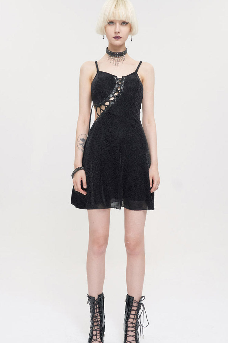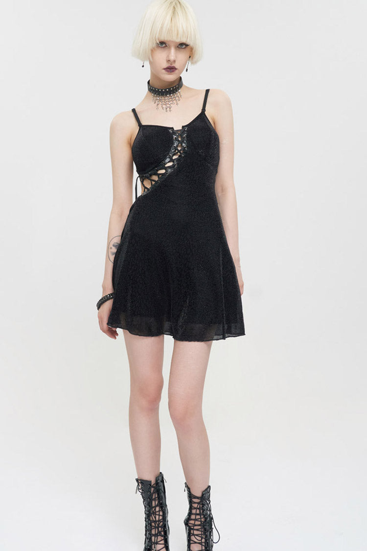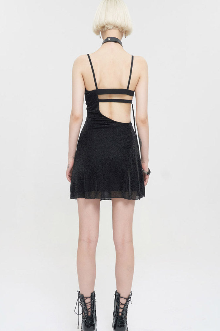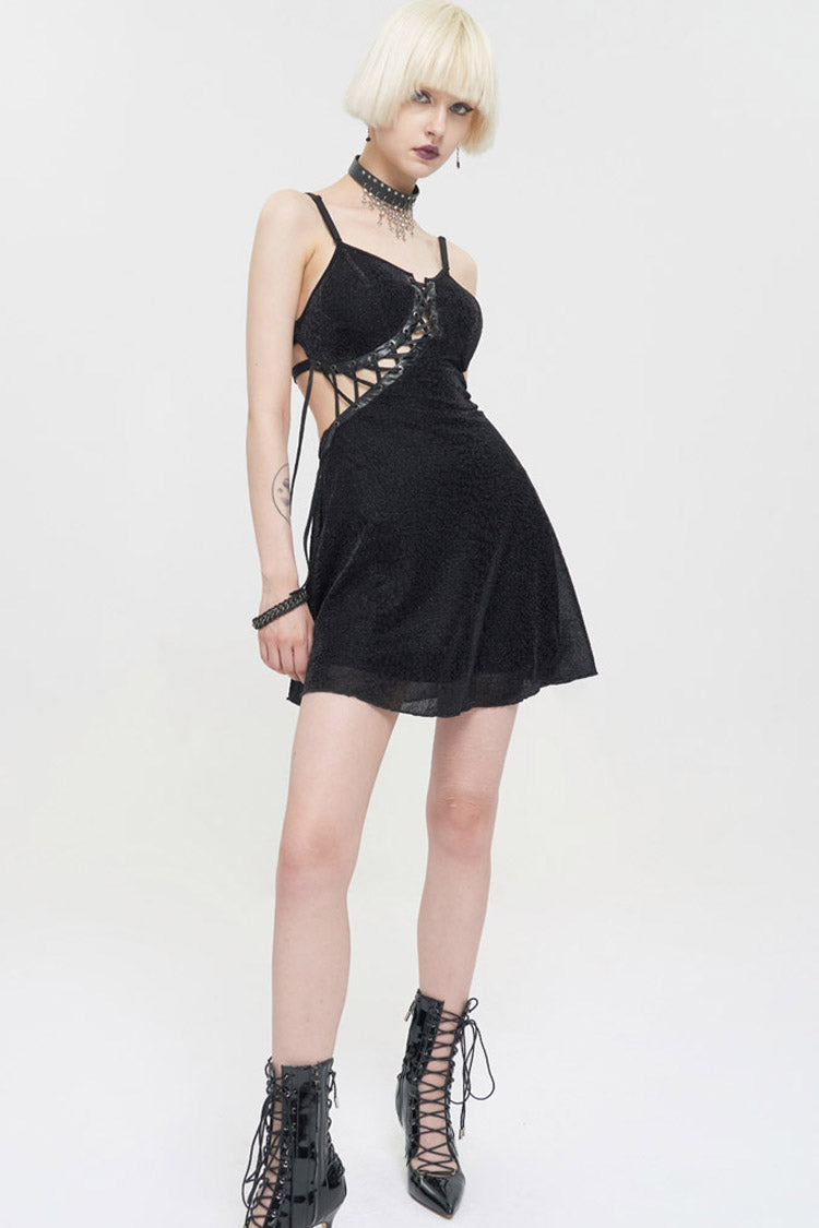 Le matériau principal est un tissu tricoté à imprimé léopard foncé, les ingrédients sont en cuir noir, les côtés gauche et droit sont asymétriques, et le dos est composé d'une bande élastique pour un design de faux sous-vêtements. La corde du milieu avant est ajustable.