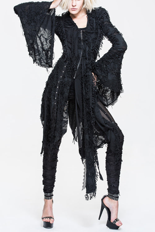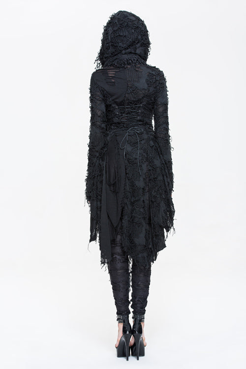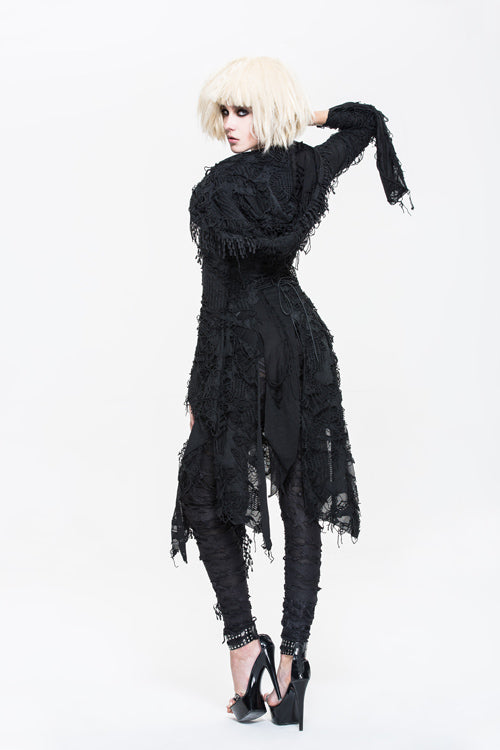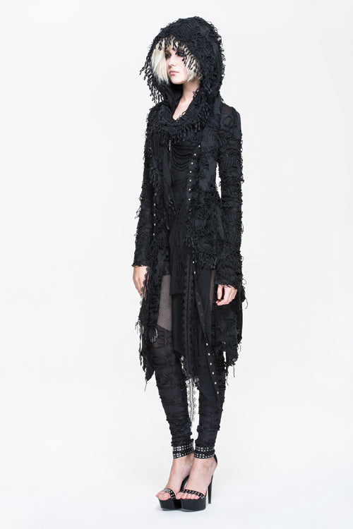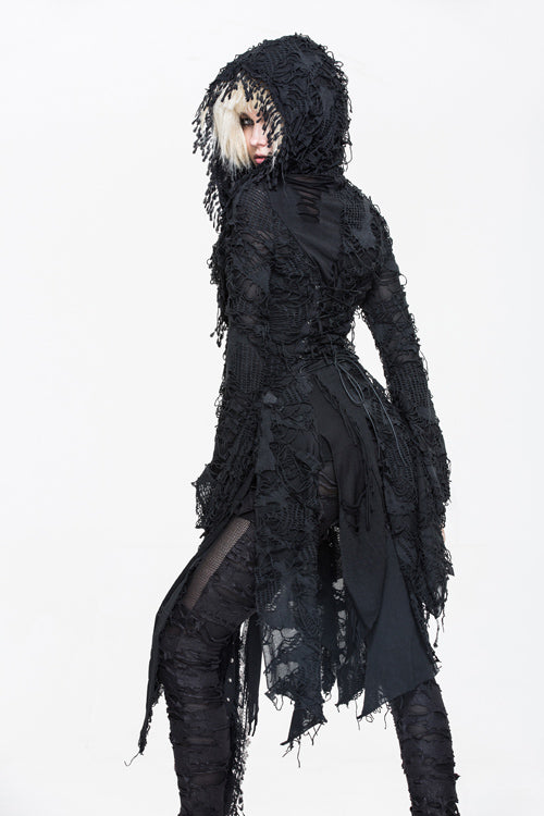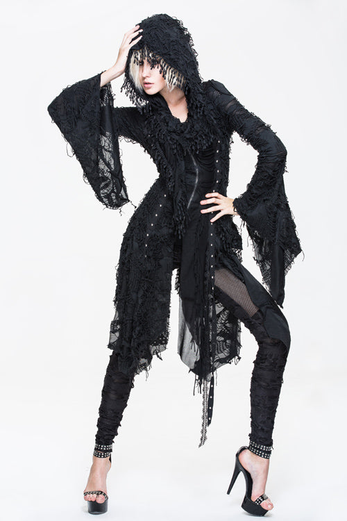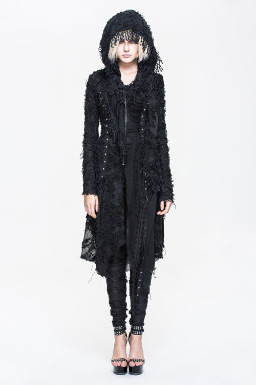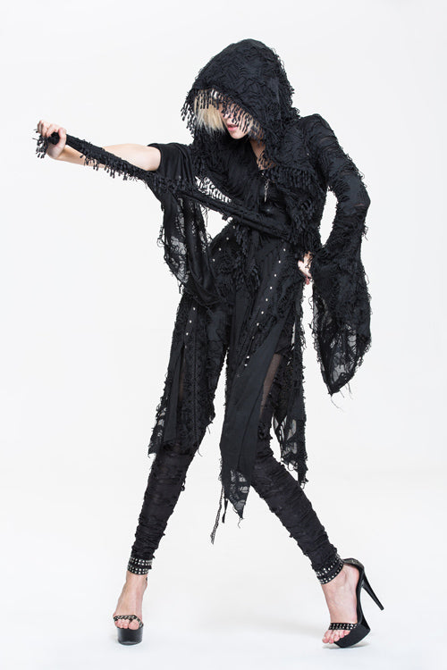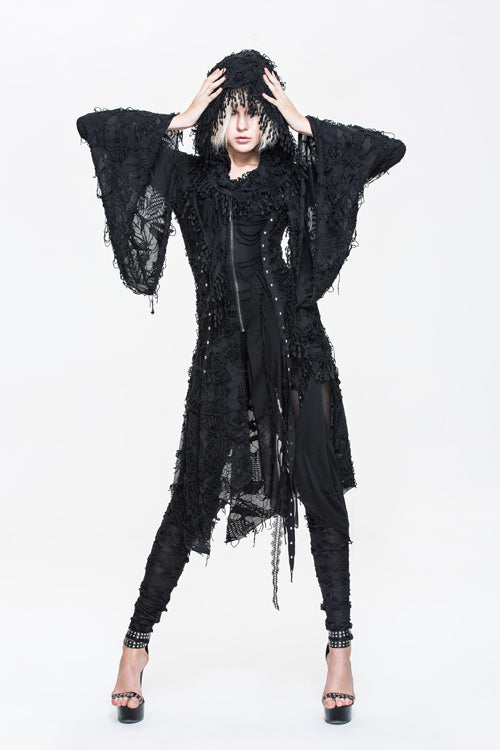 Une variété de tissus tricotés en lambeaux sont assortis, design de manche à corne, ourlet asymétrique, le bord de la capuche est cousu avec de la macramé, ajoutant un sens de mystère lorsque vous mettez la capuche, la poitrine est cousue avec un ruban cloué et de la dentelle, le recouvrement de la poitrine gauche qui est cousu avec des franges peut être autour de votre cou et utilisé comme une écharpe.