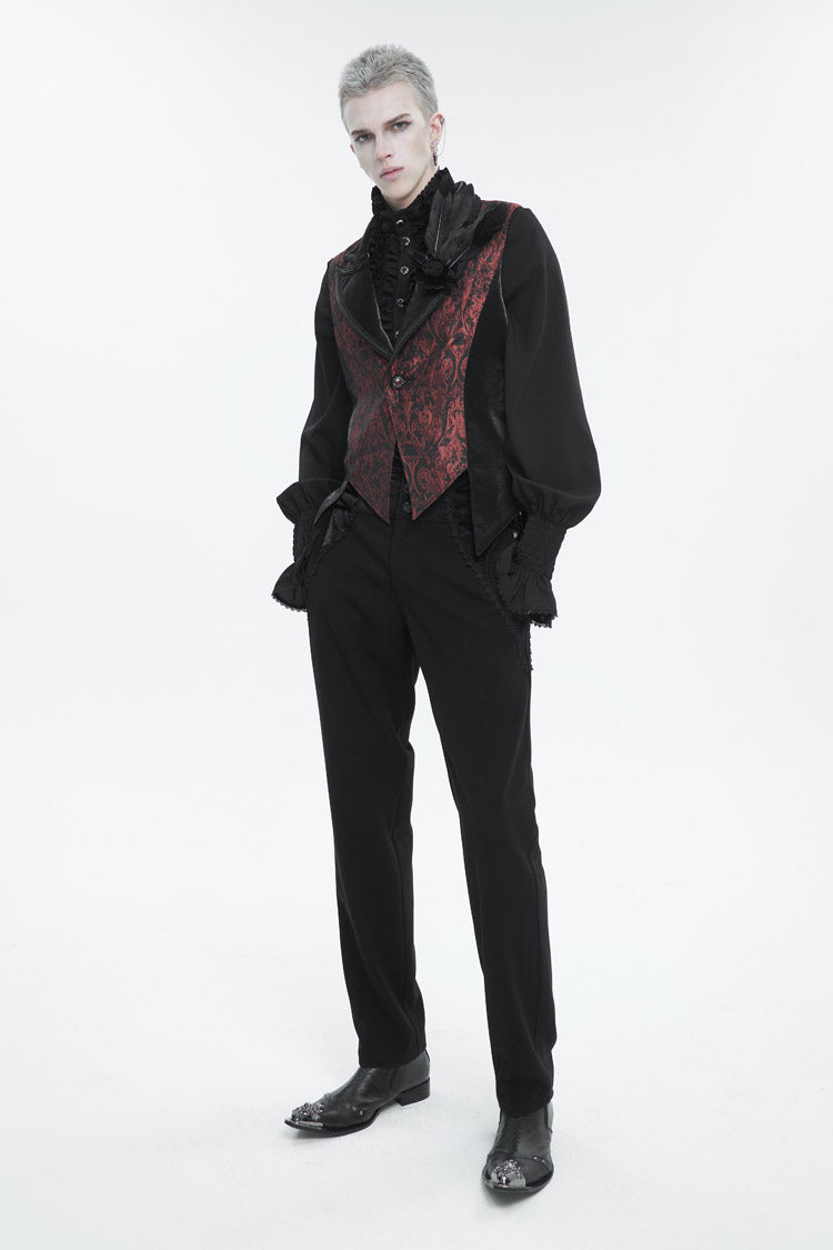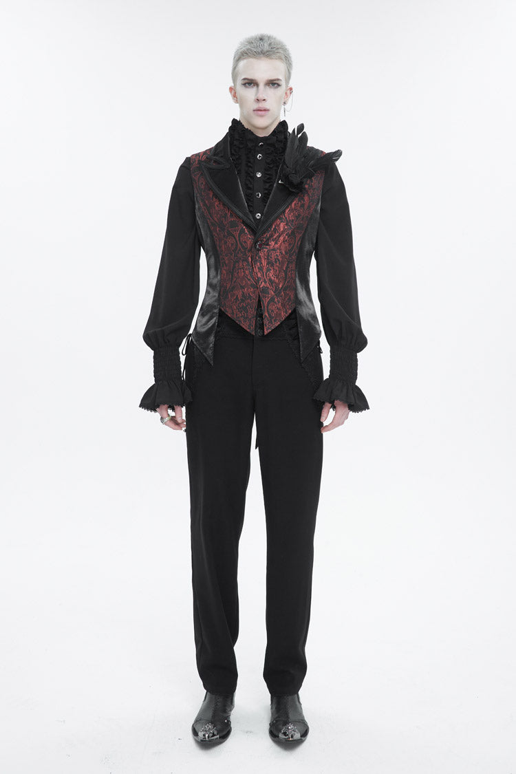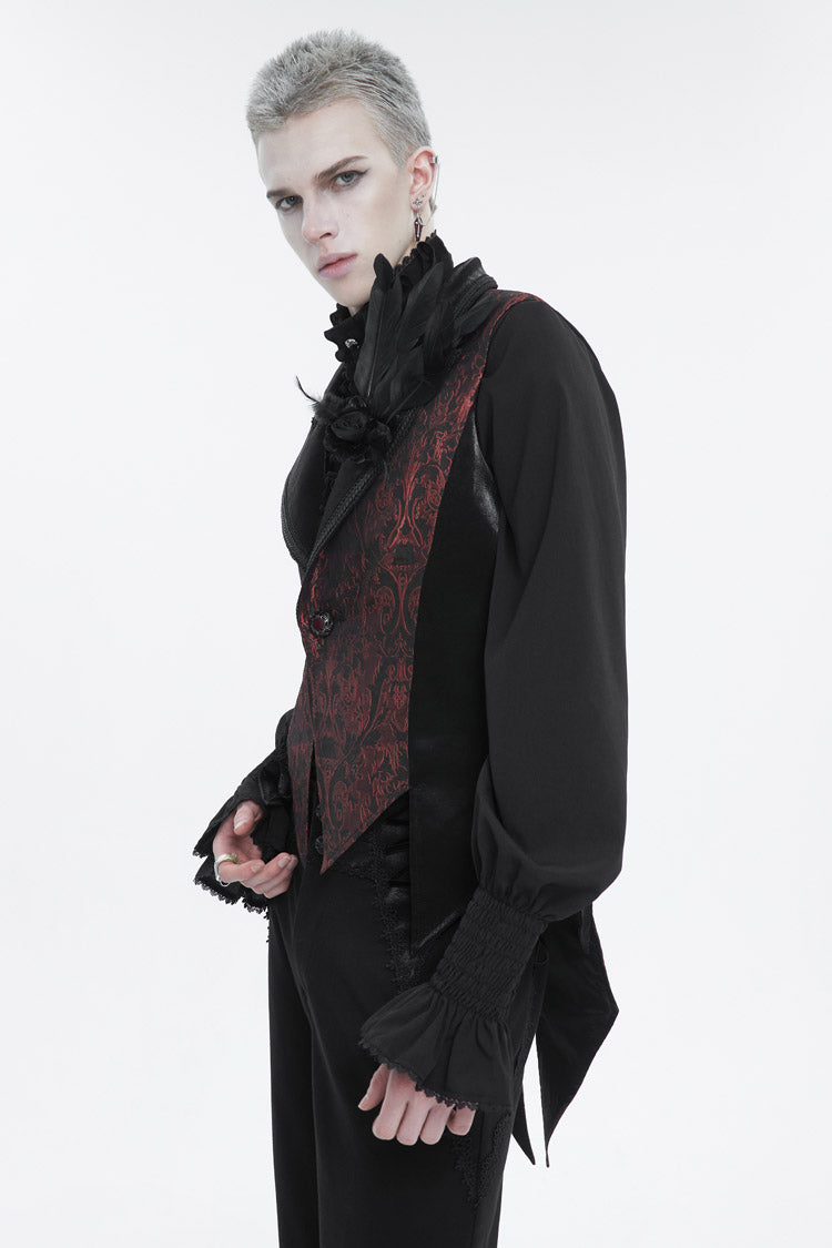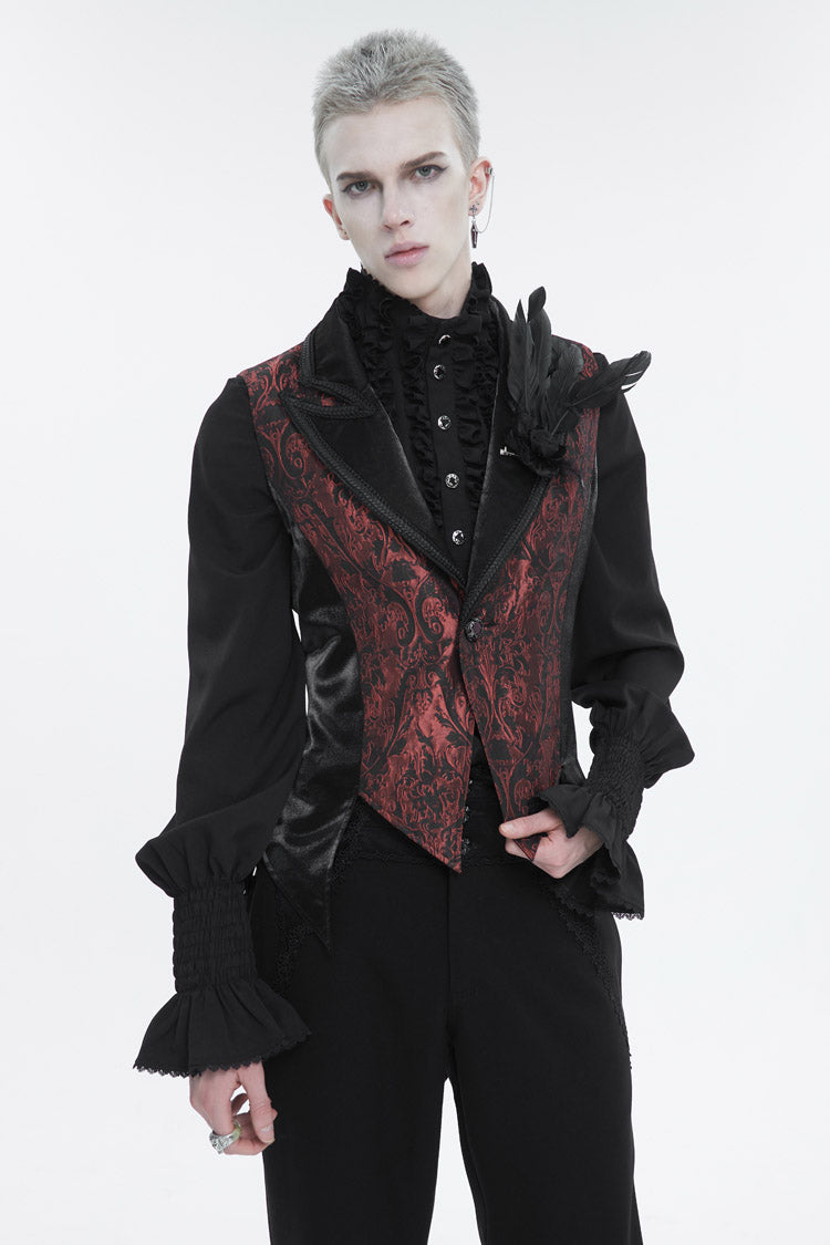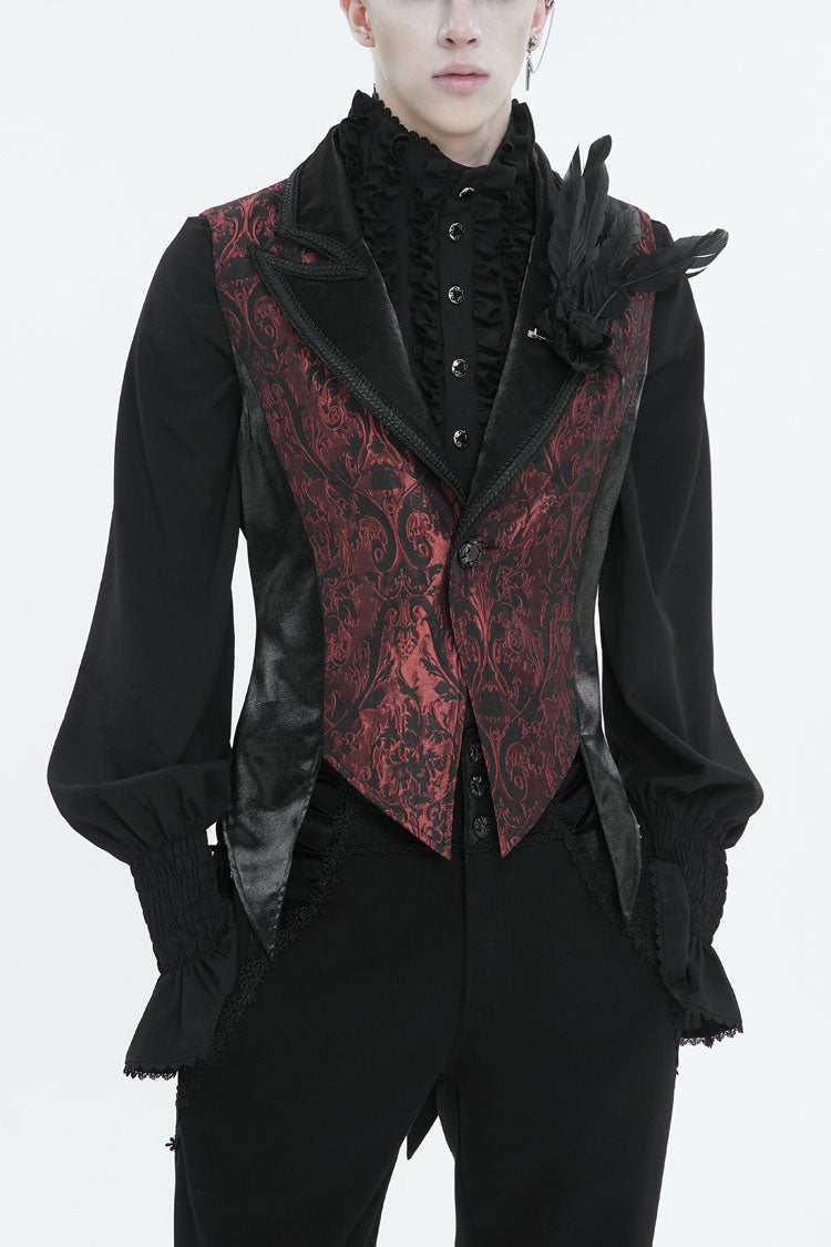 Tissu jacquard fleur sombre noir et rouge épissé avec velours de trame noir, ruban tridimensionnel cousu sur le plastron croisé en triangle inversé, décoré de boucles sculptées en verre de haute qualité, et boutons cachés cousus au bas.