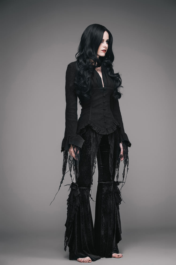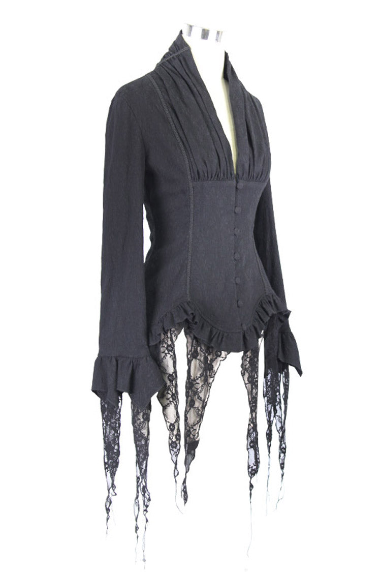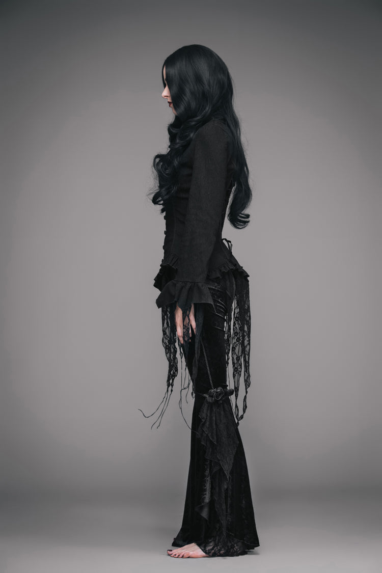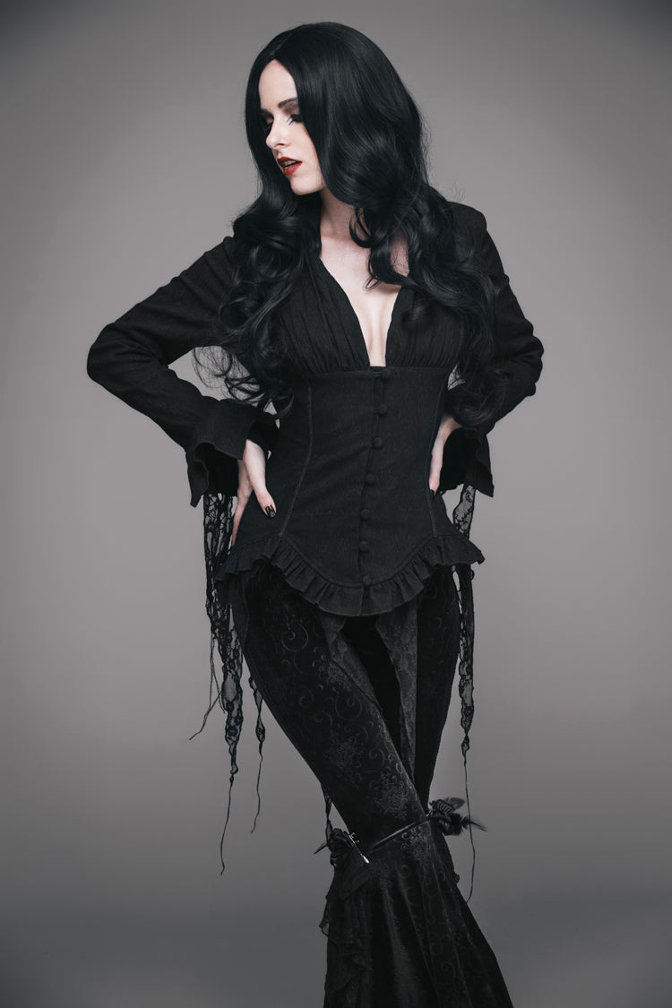 Conçue pour reproduire le style des hauts victoriens vintage, cette blouse présente un ourlet asymétrique bordé d'un petit volant. La blouse est ajustée à la taille et peut être ajustée avec un laçage à l'arrière. Un col froncé et des manches longues avec des garnitures en dentelle complètent le look.
