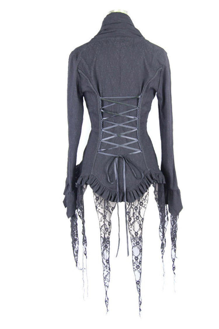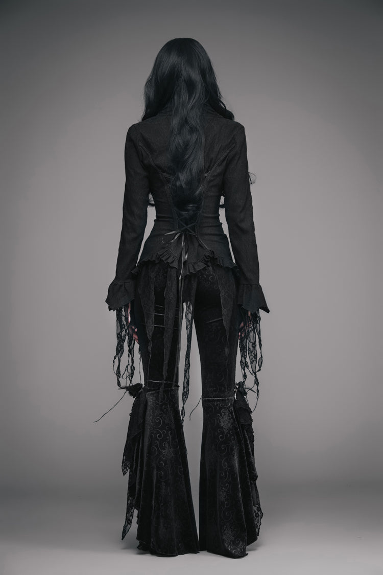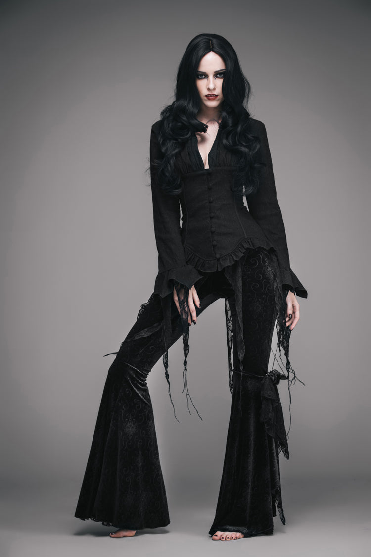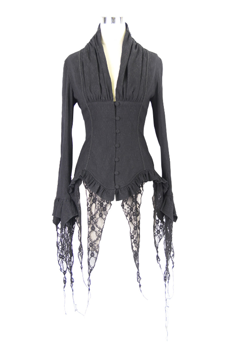 Conçue pour reproduire le style des hauts victoriens vintage, cette blouse présente un ourlet asymétrique bordé d'un petit volant. La blouse est ajustée à la taille et peut être ajustée avec un laçage à l'arrière. Un col froncé et des manches longues avec des garnitures en dentelle complètent le look.