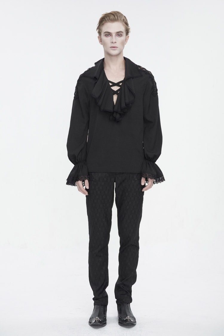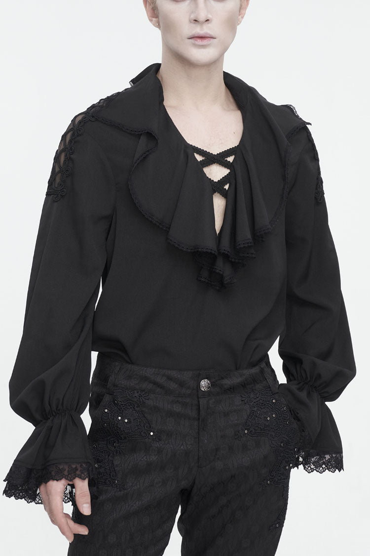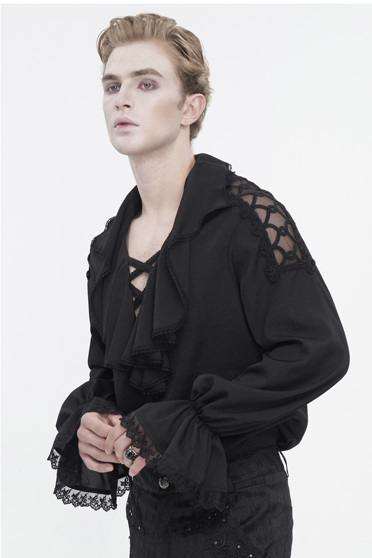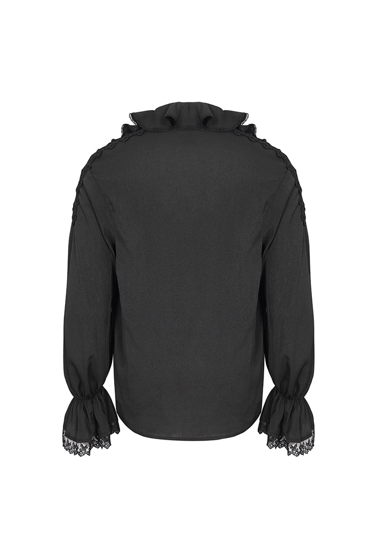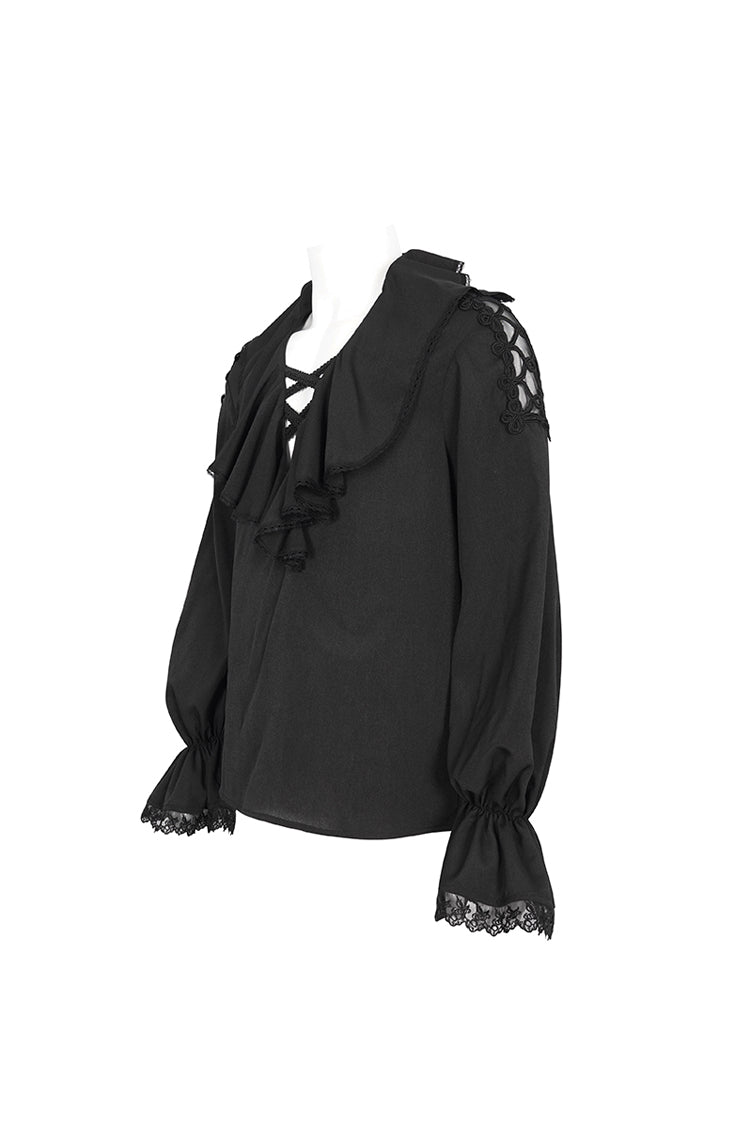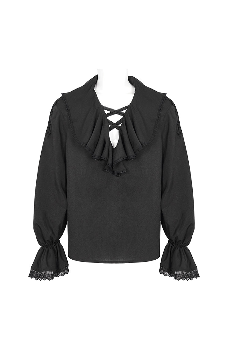 Cette chemise gothique a un col à volants et des manches bouffantes. Poignets évasés et patchwork avec dentelle. Deux bretelles tressées croisées sur le col en V. Patchwork en maille et tressé sur l'épaule. Pas de tissu élastique. Disponible en deux couleurs.