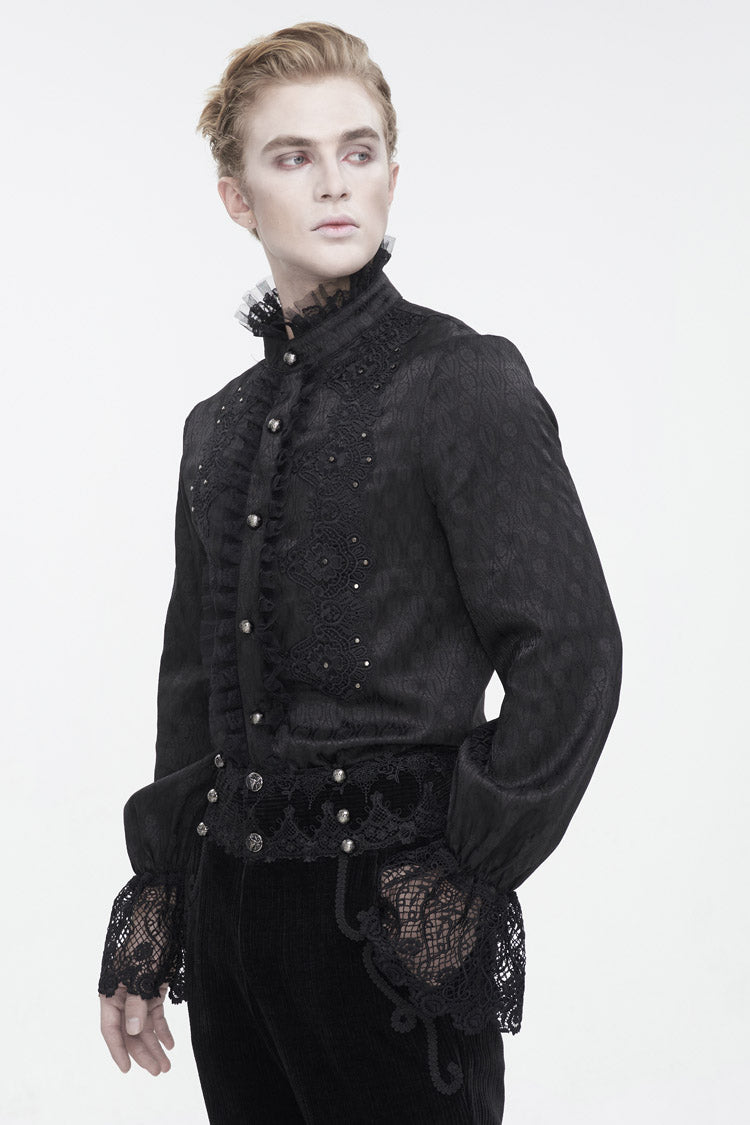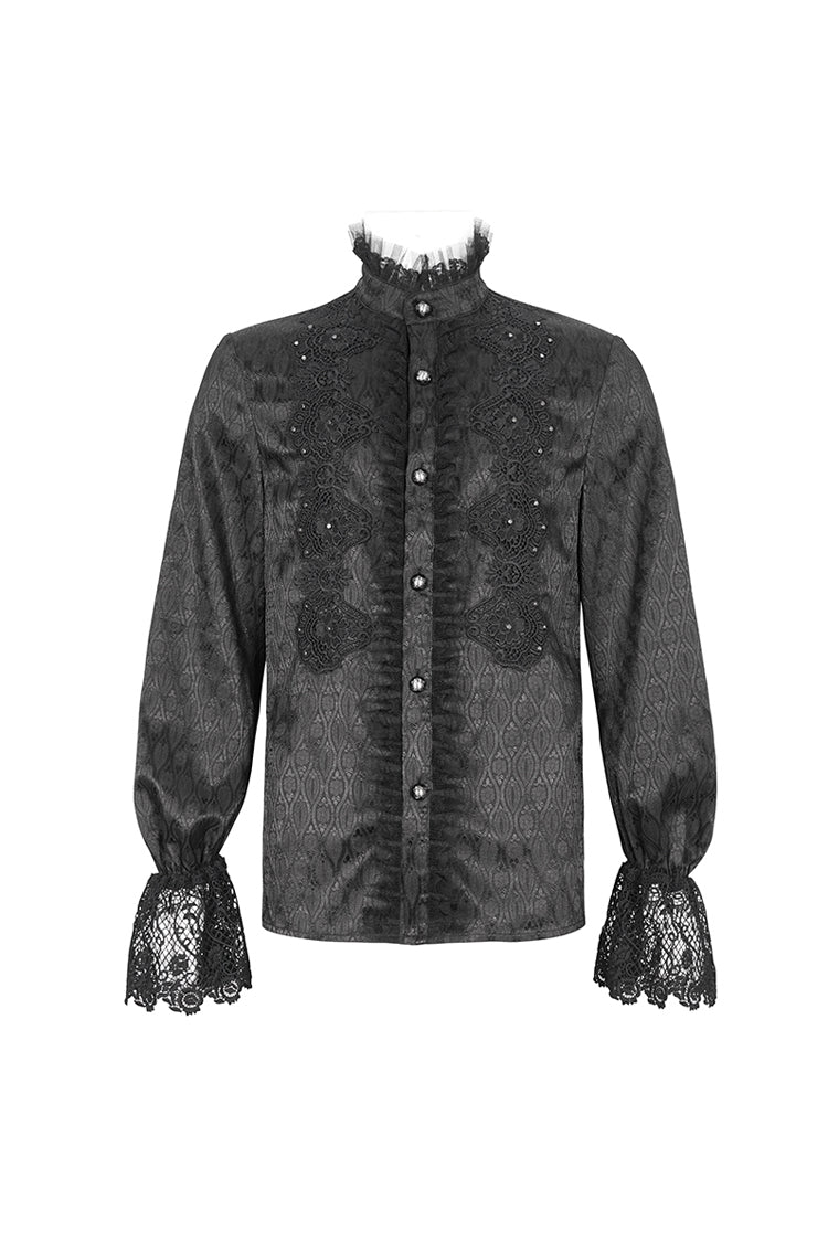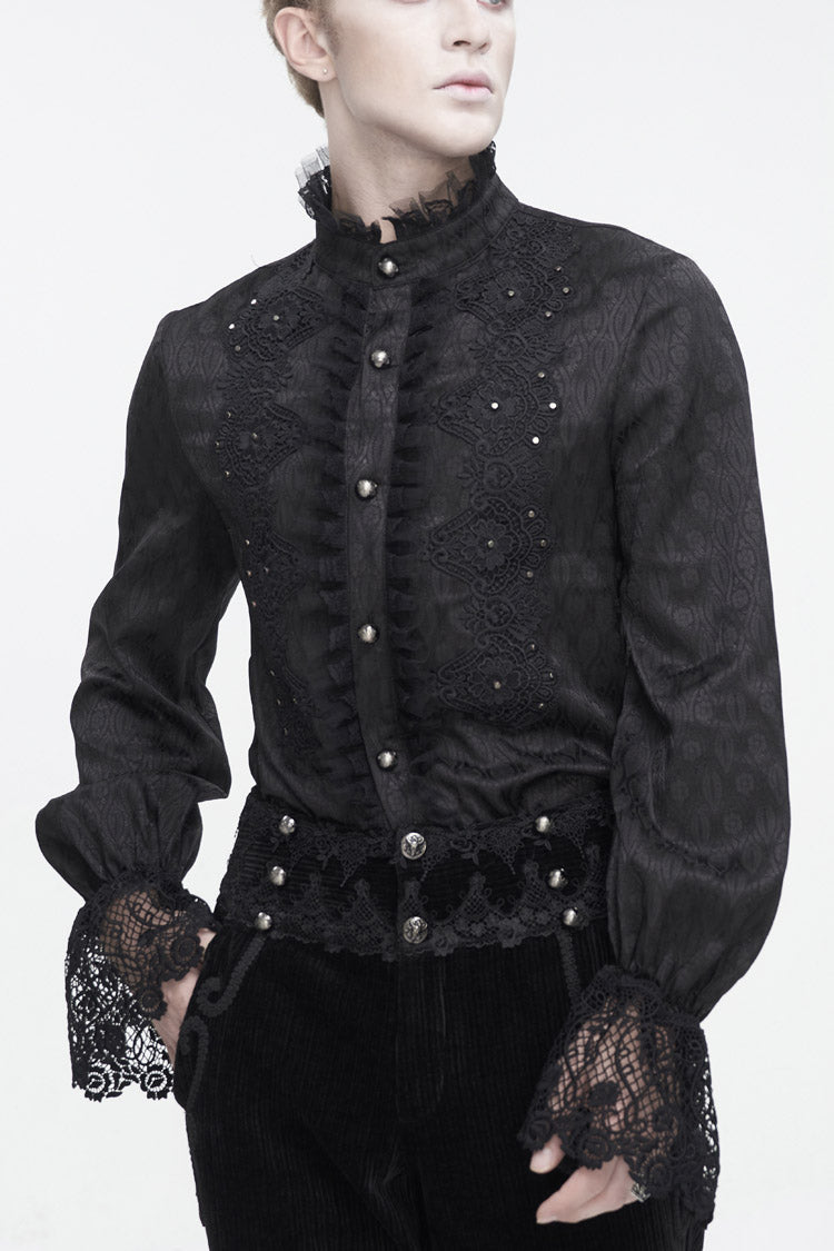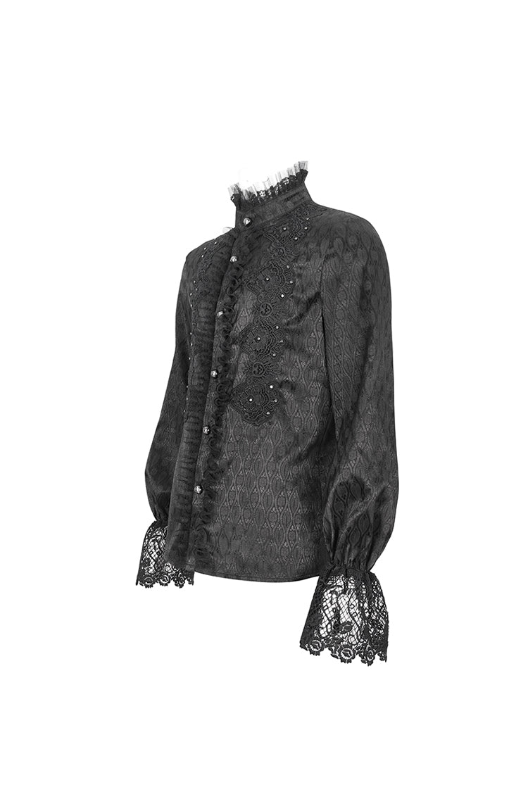 Cette chemise gothique a un col montant et des manches bouffantes. Patchwork en dentelle sur les poignets et le col. Broderie florale sur le devant. Dentelle à volants et filet décorés sur le devant. Pas de tissu élastique.