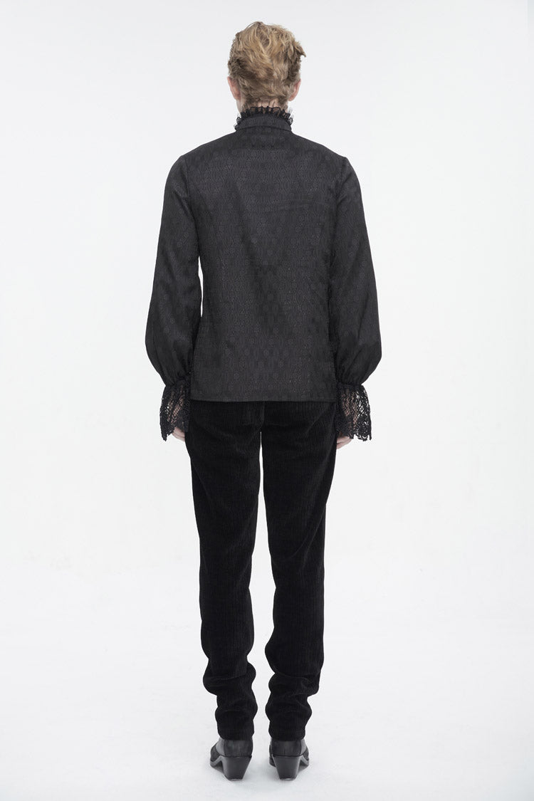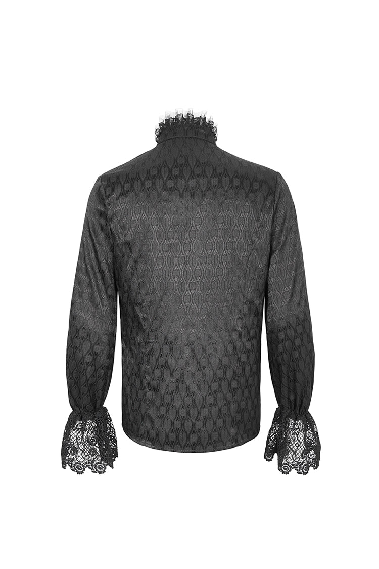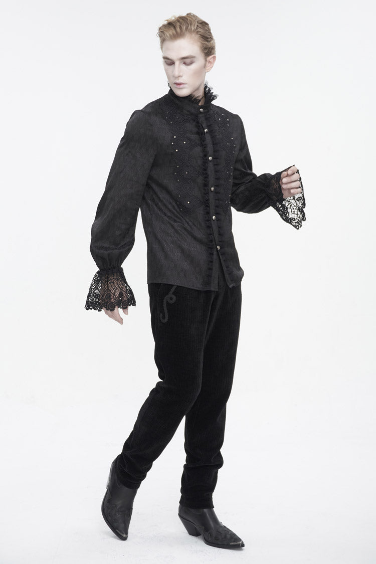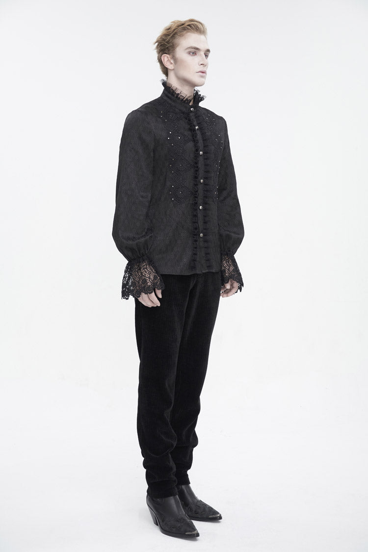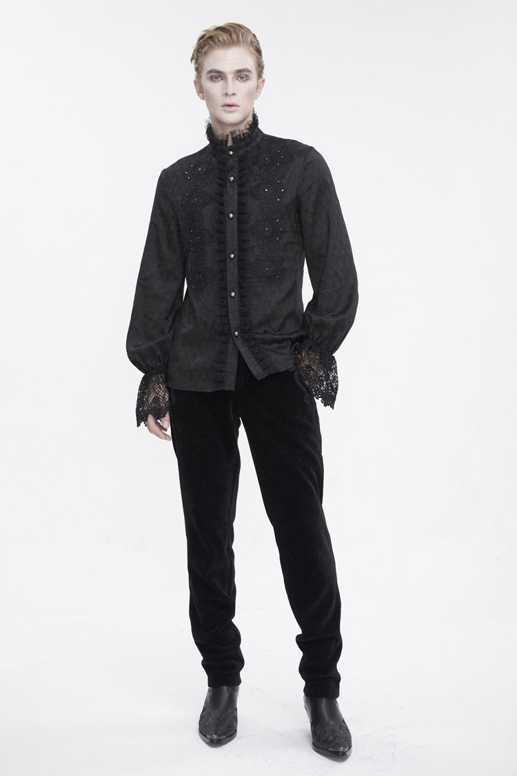 Cette chemise gothique a un col montant et des manches bouffantes. Patchwork en dentelle sur les poignets et le col. Broderie florale sur le devant. Dentelle à volants et filet décorés sur le devant. Pas de tissu élastique.