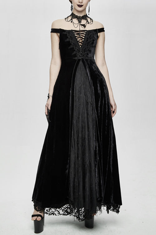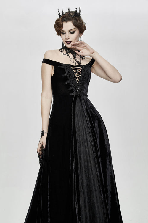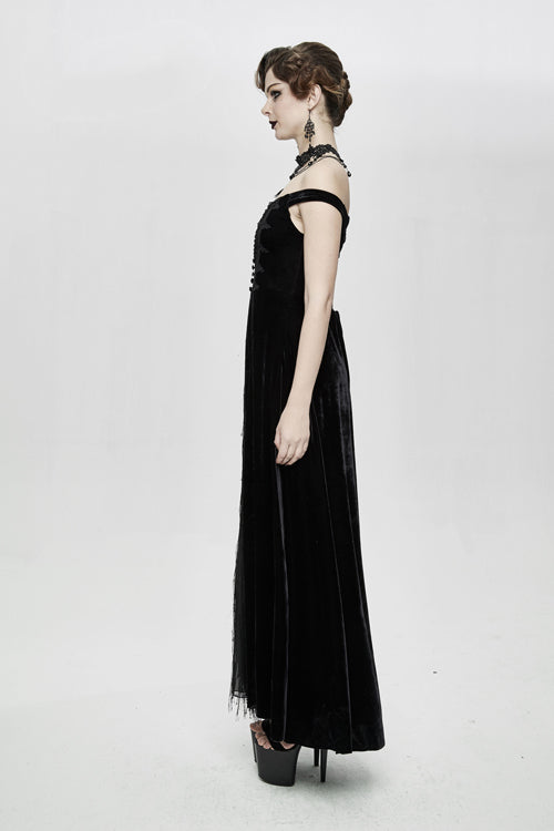 Le tissu principal est composé de velours élastique, assemblé avec du chiffon à franges. Version ajustée, robe longue à épaules plates. Décolleté en V profond, avec perles en dentelle tridimensionnelle et attaché avec une corde. Au centre du dos, le processus de couture smocking avec bande élastique, avec attache avec corde pour ajustement.