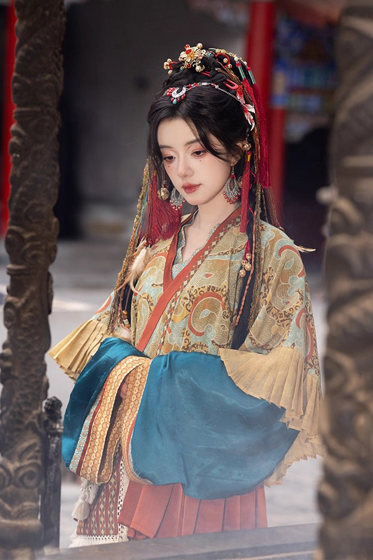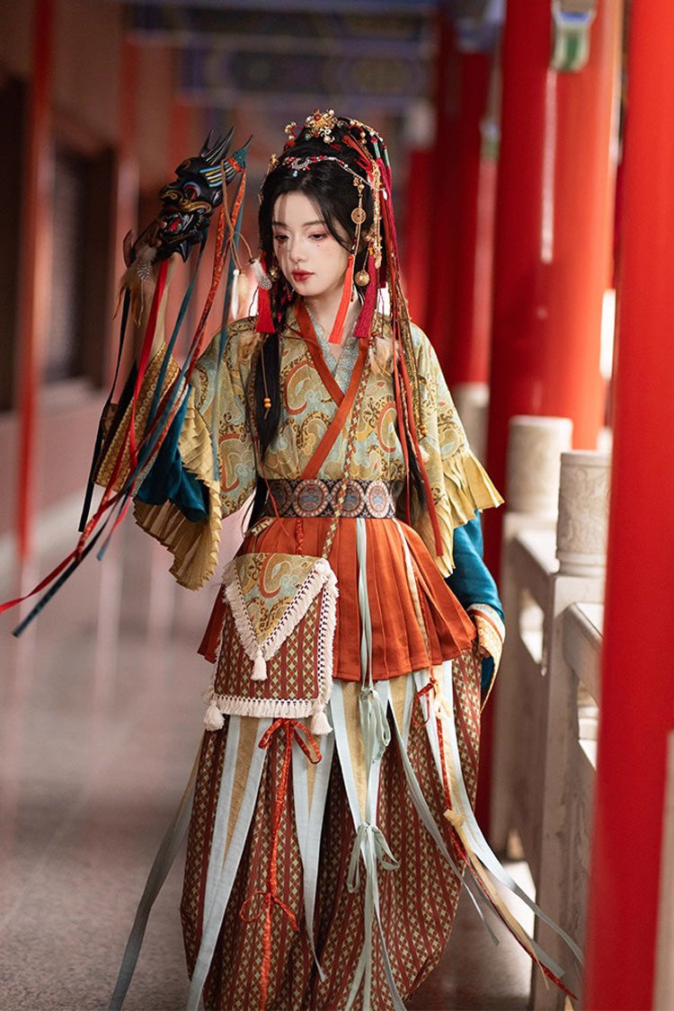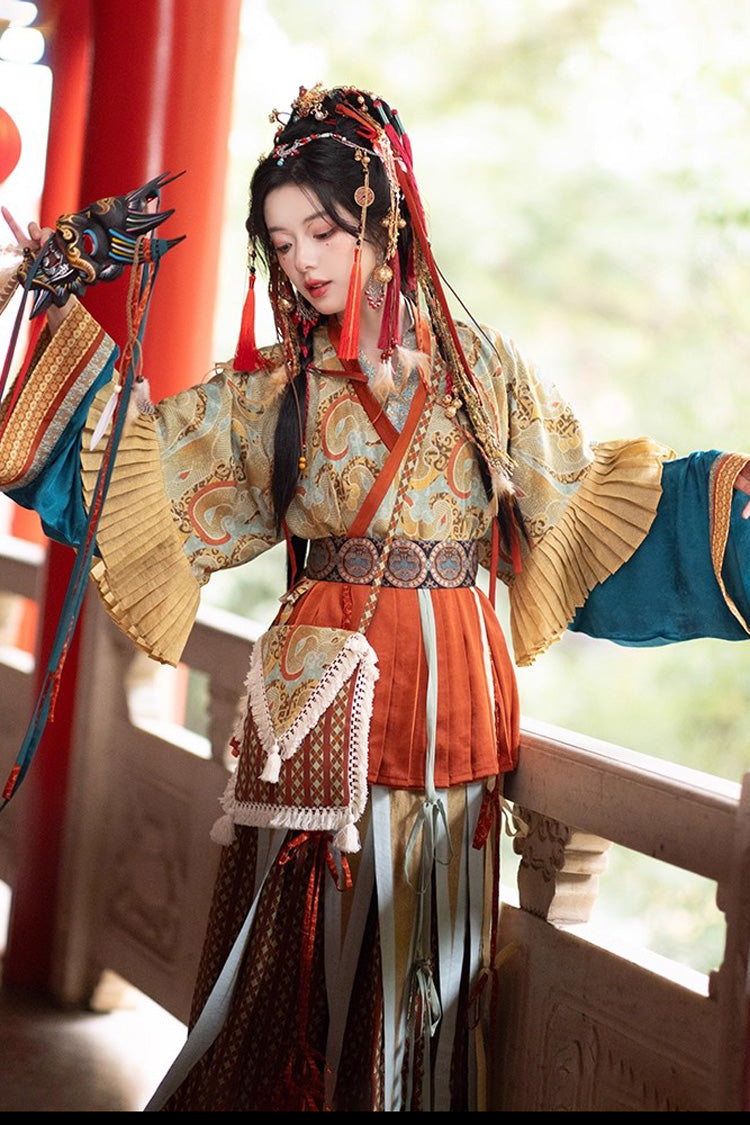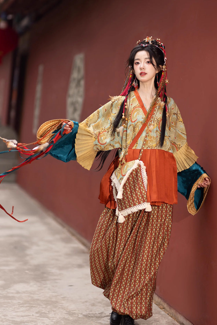 Inclut: Haut à manches courtes à volants + Haut à col croisé + Pantalon lanterne + Ceinture + Sac à main à franges + Couverture de genou (Bijia)