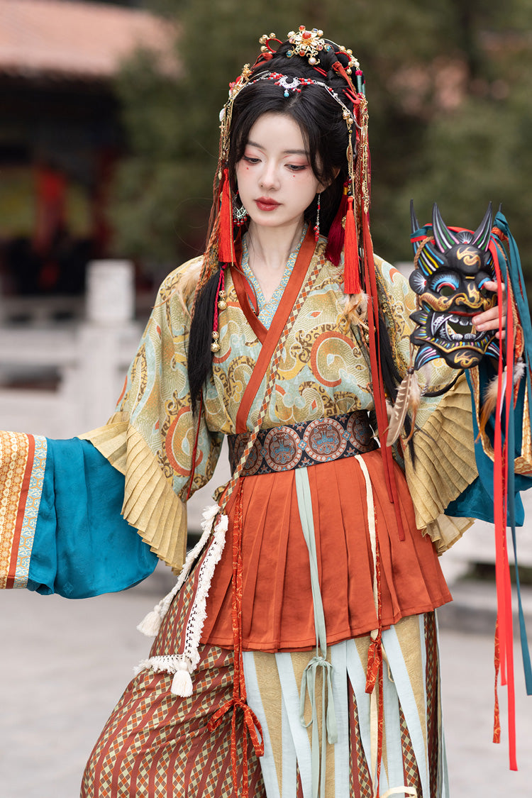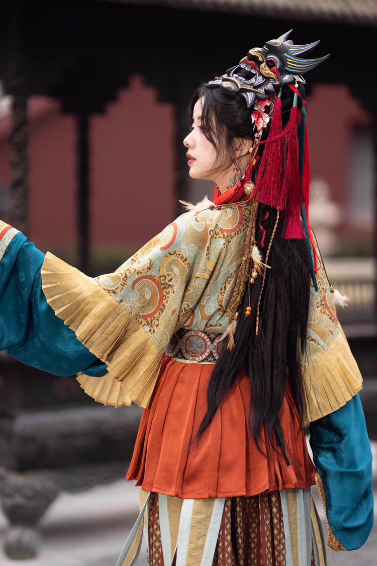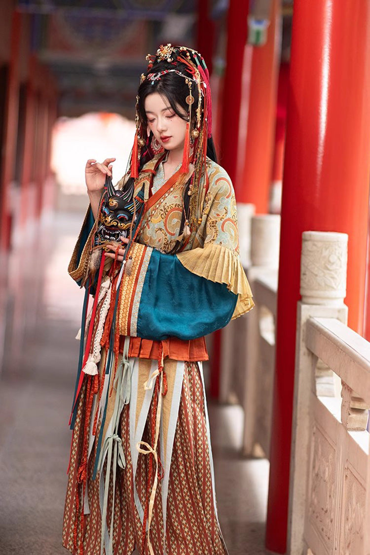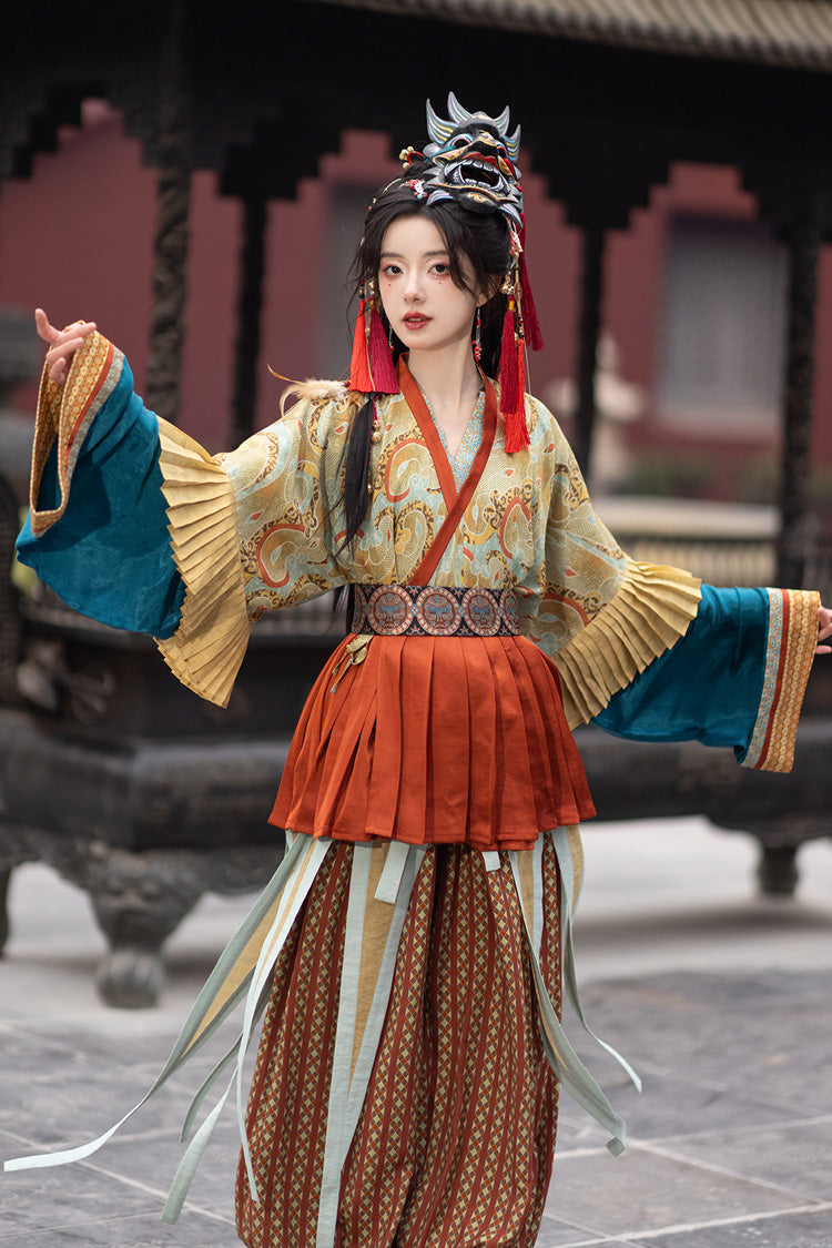 Inclut: Haut à manches courtes à volants + Haut à col croisé + Pantalon lanterne + Ceinture + Sac à main à franges + Couverture de genou (Bijia)