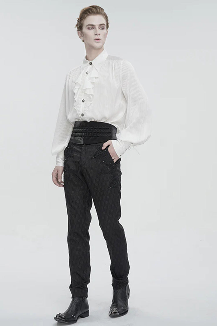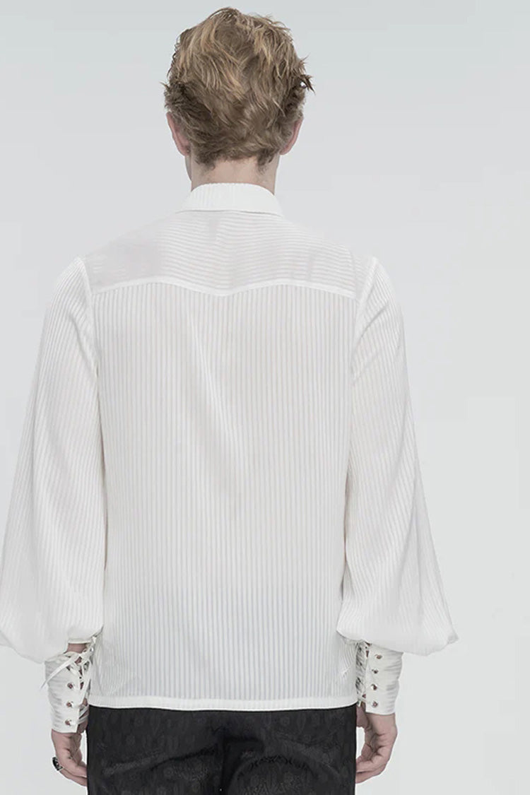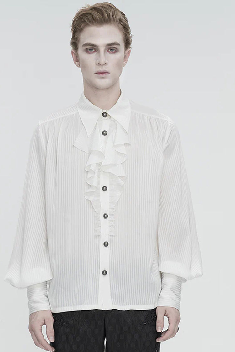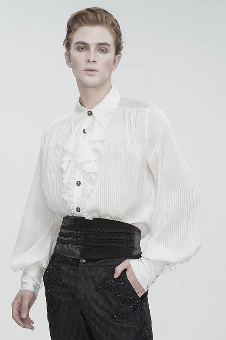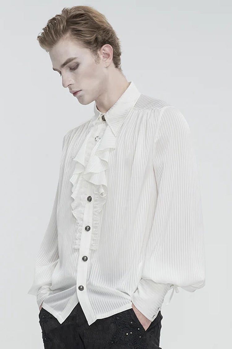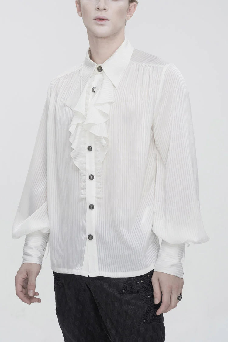 Cette chemise gothique a un col rabattu et des manches bouffantes. Les poignets sont à lacets. De la dentelle à volants et du tulle sont décorés à l'avant. Pas de tissu élastique. Disponible en deux couleurs.