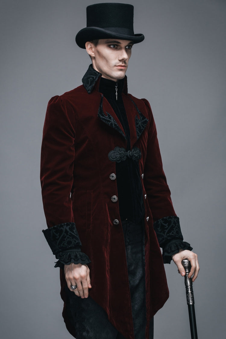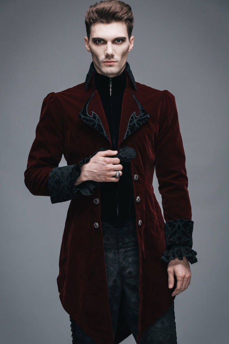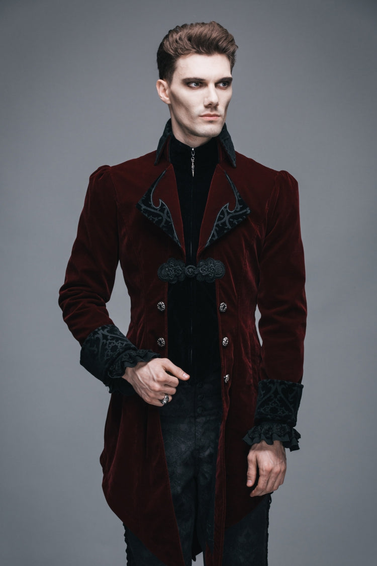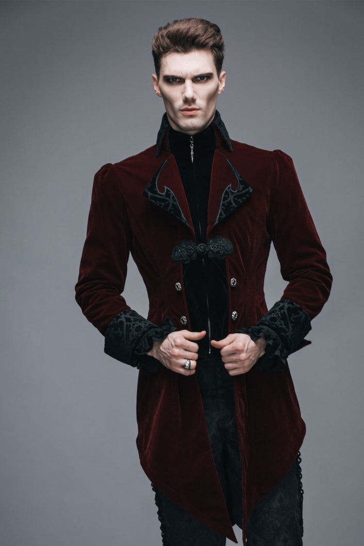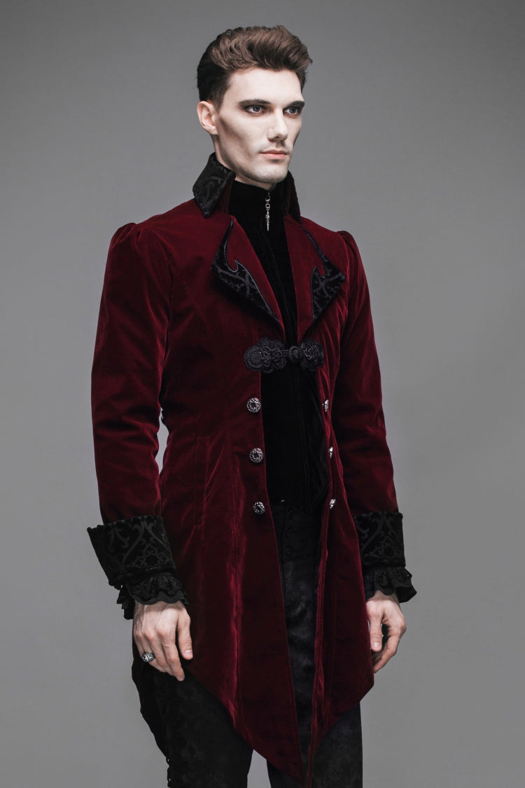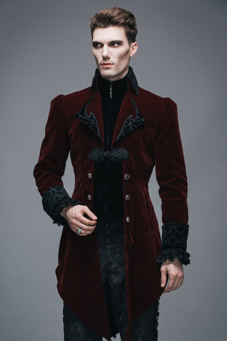 Tissu en velours noir et rouge avec motif de palais noir en tissu dévoré, col avec broderie de col, design de fausse double pièce, grenouille de taille peut être ouverte, utilisant un bouton sculpté gothique.