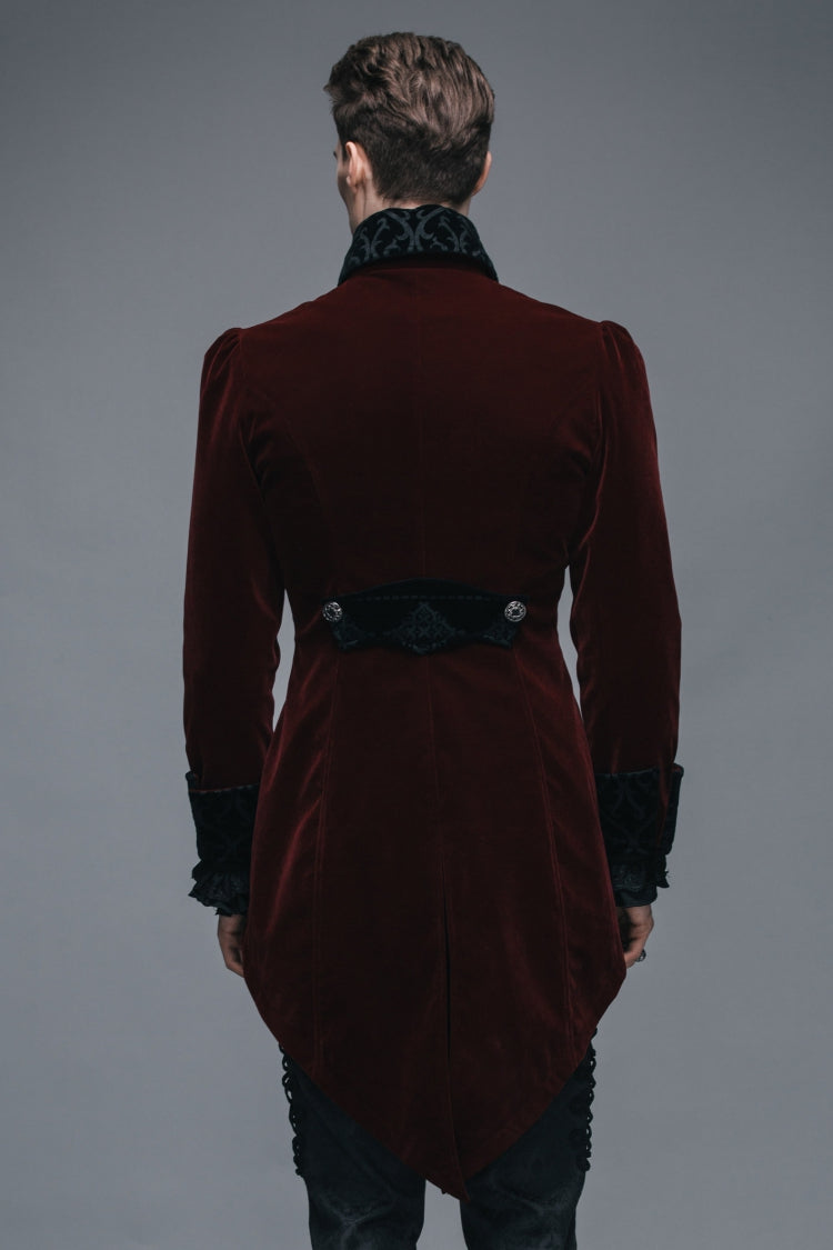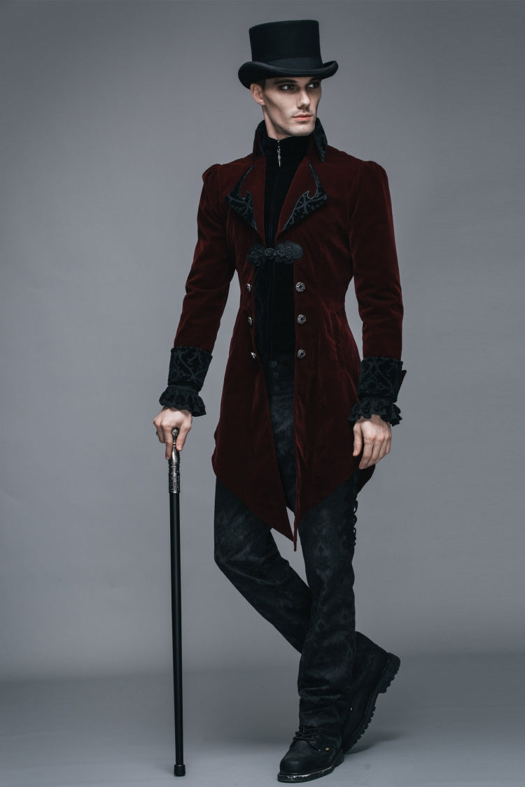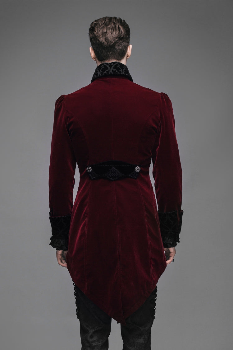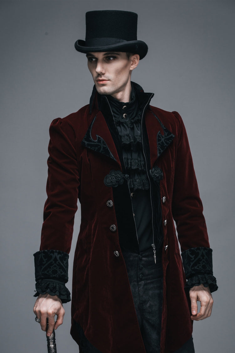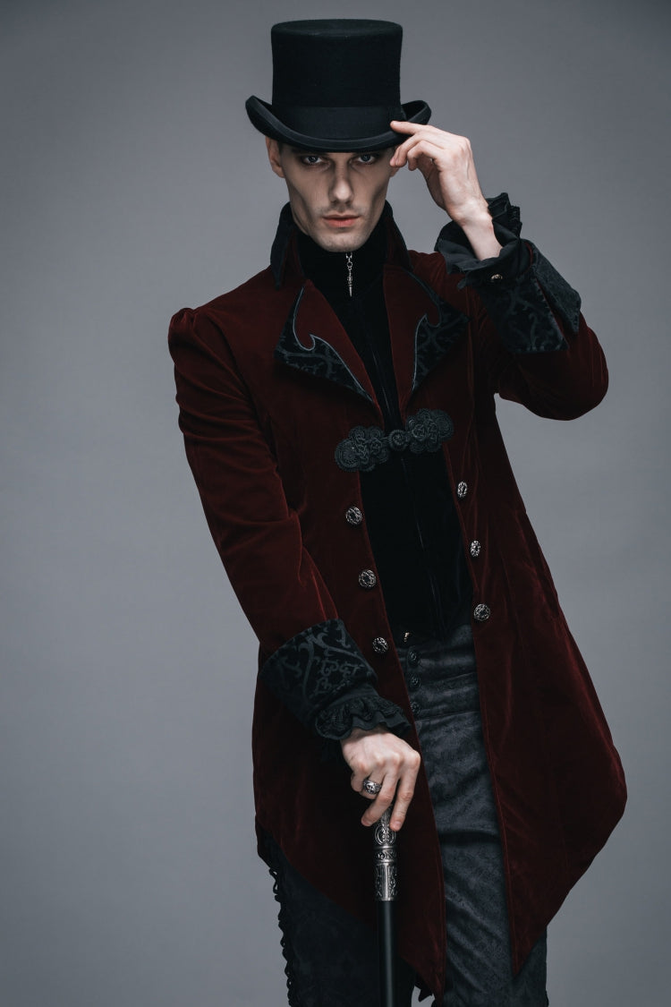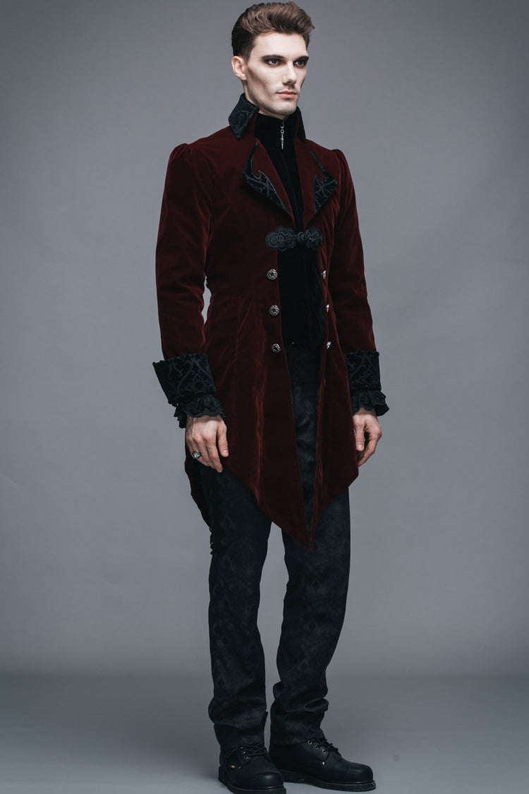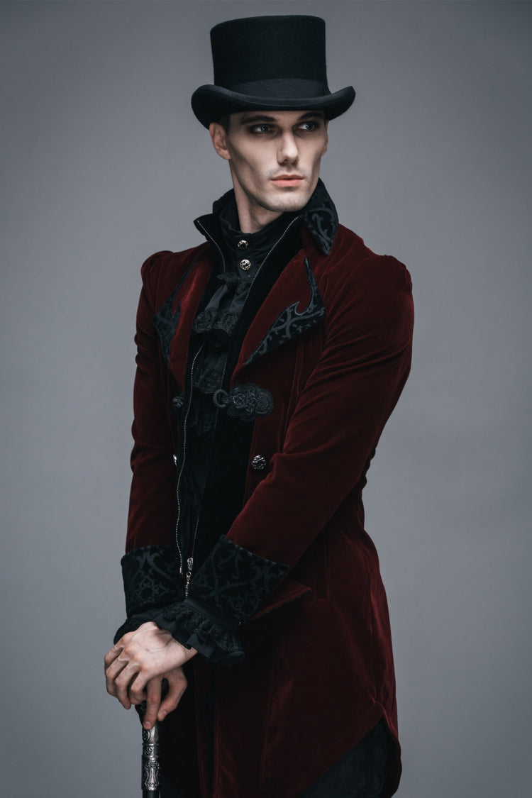 Tissu en velours noir et rouge avec motif de palais noir en tissu dévoré, col avec broderie de col, design de fausse double pièce, grenouille de taille peut être ouverte, utilisant un bouton sculpté gothique.