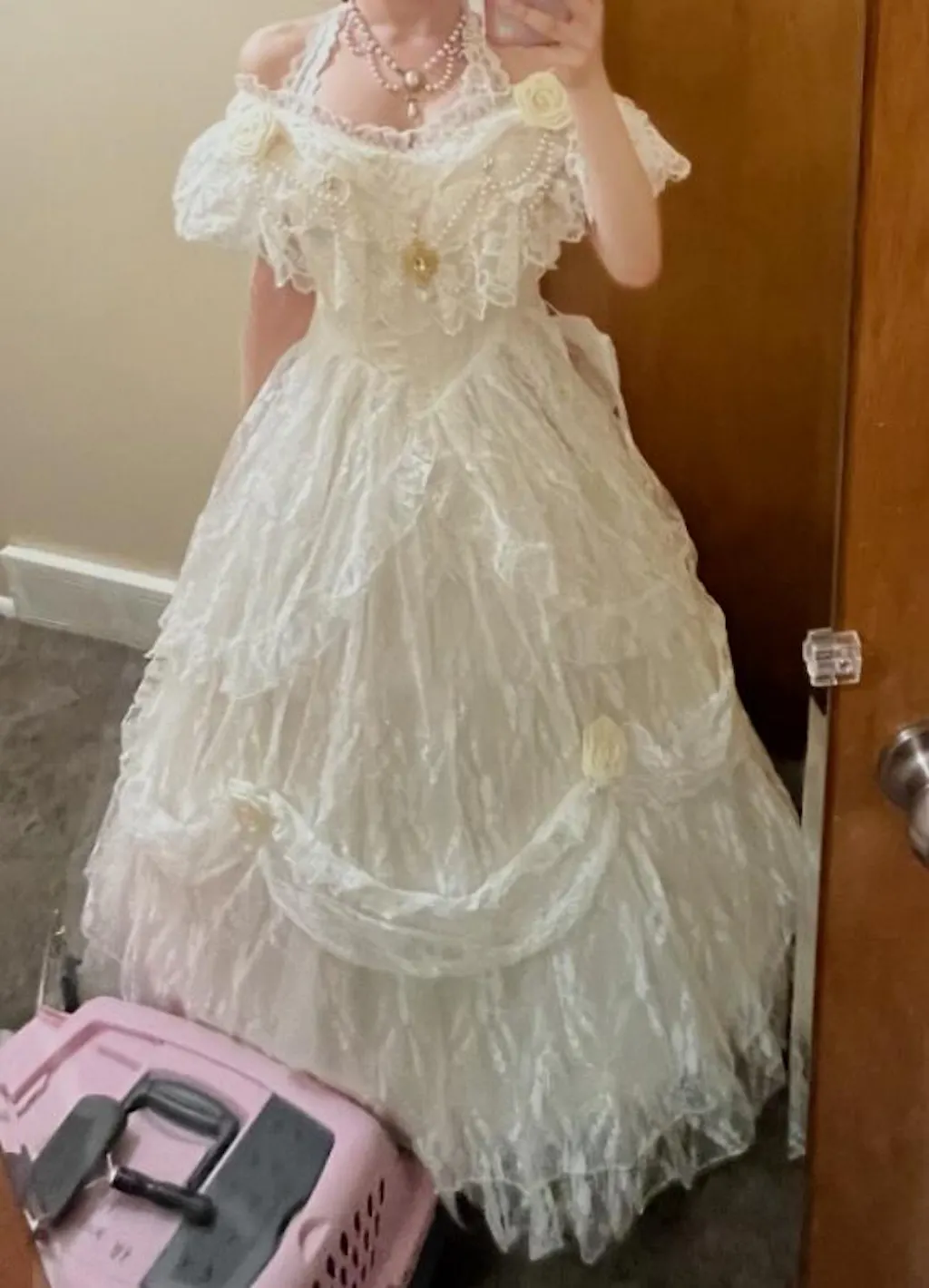 It's absolutely beautiful and the sizings feel accurate to me- i chose a small and it fits like an actual small. Again , its absolutely beautiful and it was also soooo worth it to buy the matching petticoat and trailing. im super happy with it, and the shipping was a little confusing but it didnt take that long at all. also in the picture im wearing a bra which is the straps that are on my shoulders, the dress does not come with those straps its just off the shoulder but its very stable and doesnt slide down