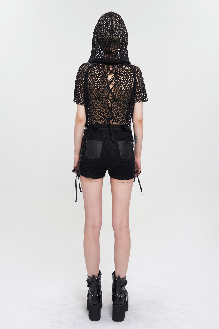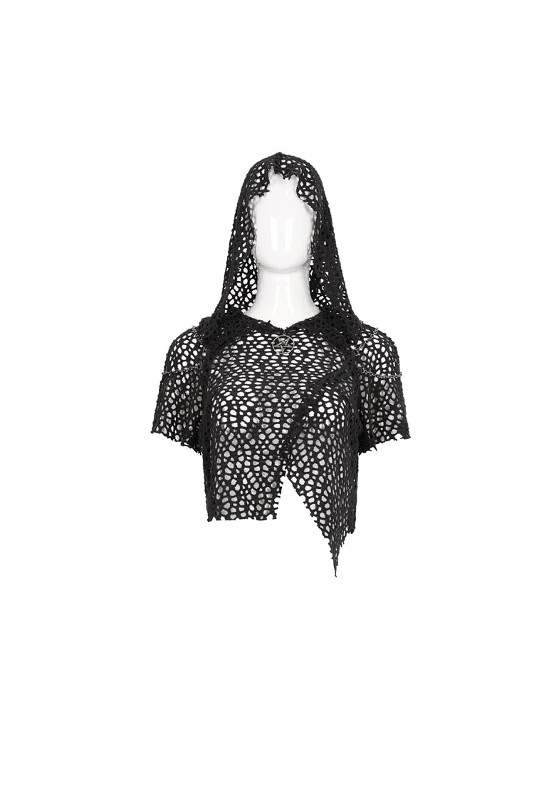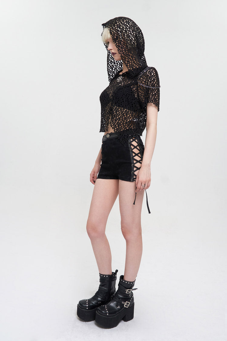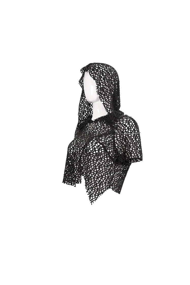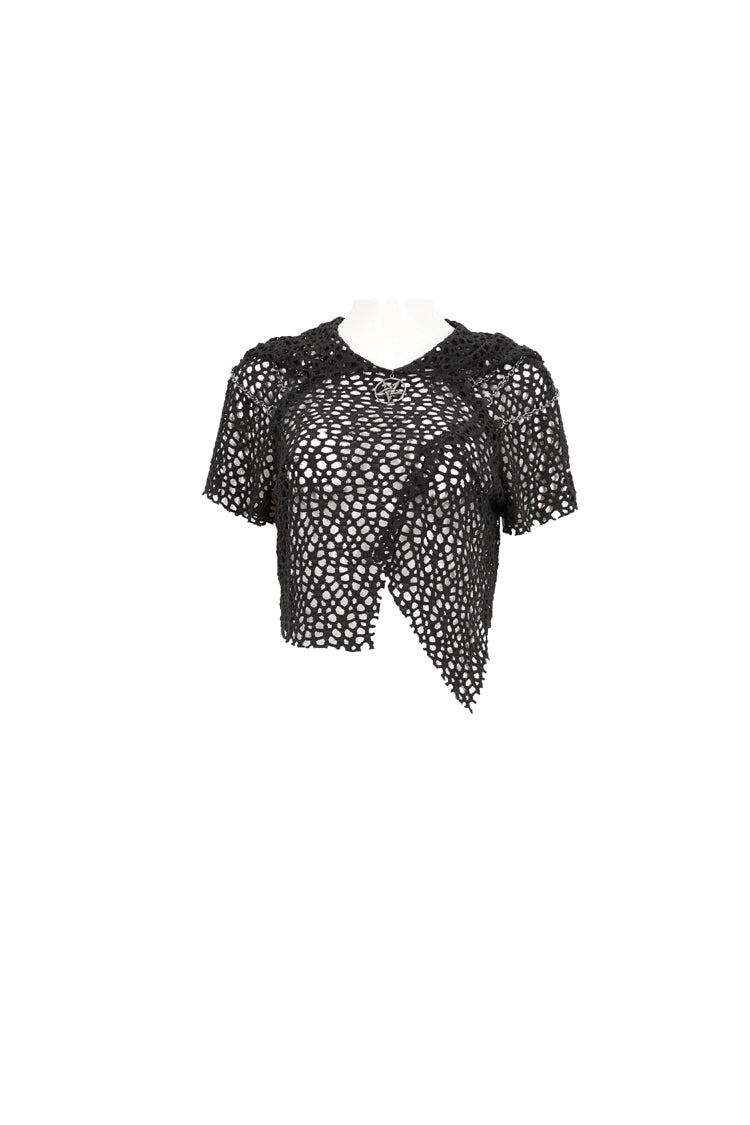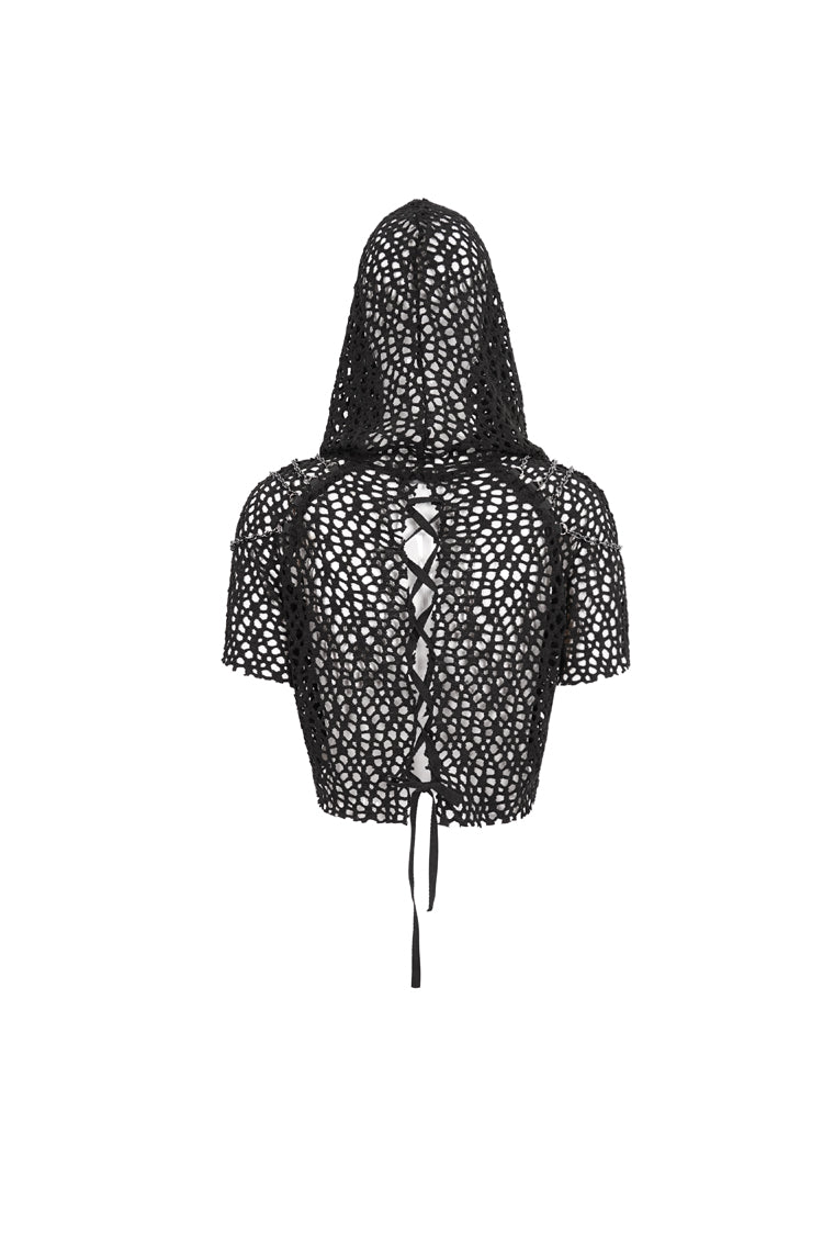 メイン生地には伸縮性に優れたウール素材の凹凸メッシュ生地を使用しています。フード付き半袖イレギュラーヘムフィット。ショルダー部分のアルミチェーン接続はメタリックでありながら重すぎず、不規則なカッティングとステッチが自由なパンクスタイルを際立たせます。