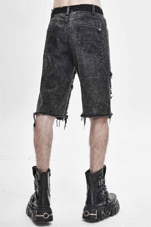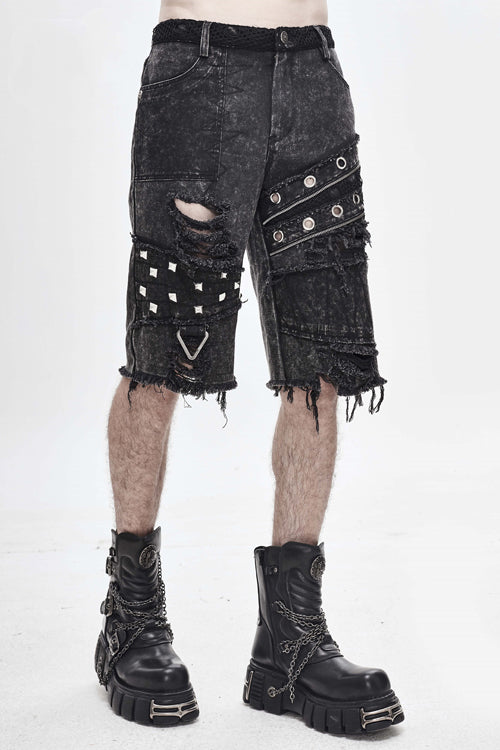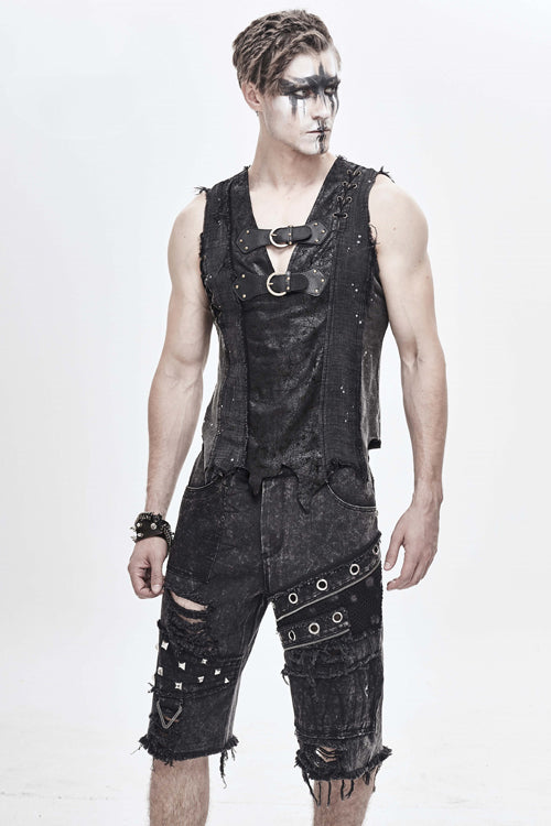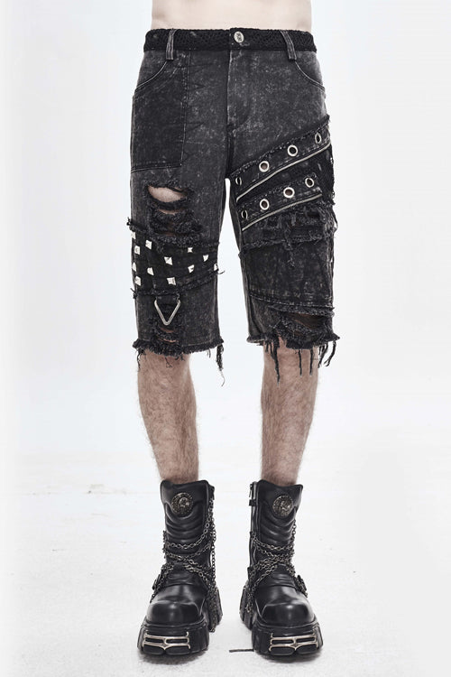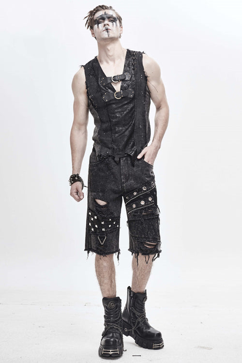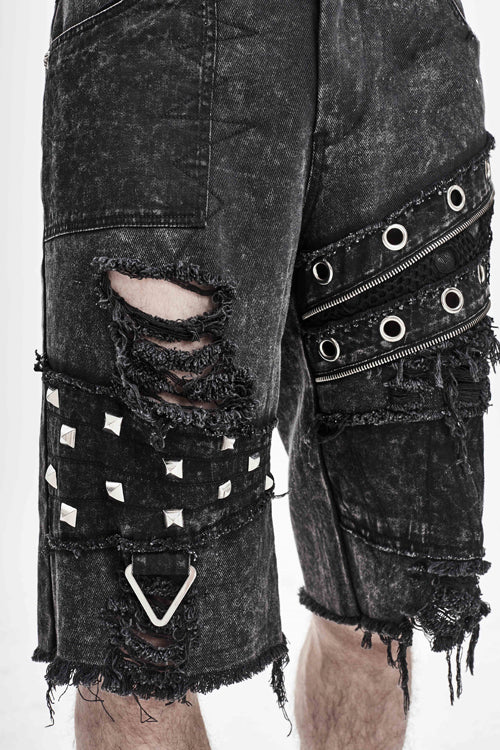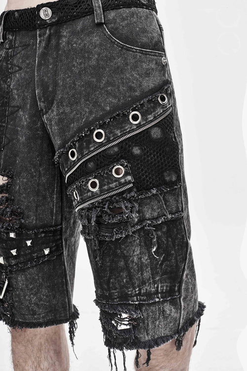 黒のツイルデニム生地を様々な生地でステッチし、水洗いして使い古してグレーホワイト色を作り、引き裂き、ウールウォッシュ、Z字型の飾り糸、釘を打ち込むなどの方法で荒廃感と退廃感を強調しています。 。