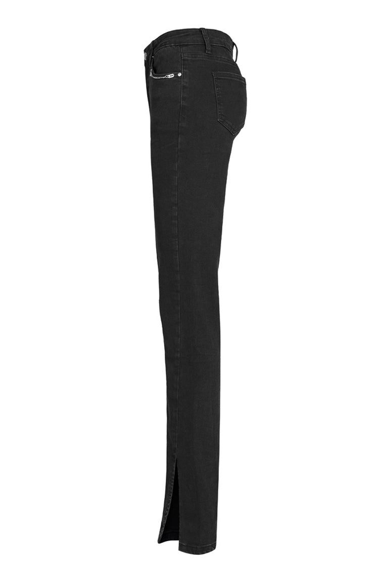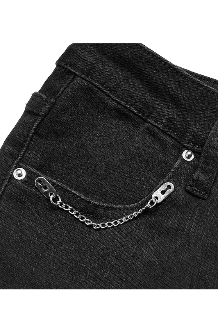 2.ポケットには可動式の飾りチェーンを手縫いで施し、パンクなディテールをプラス。