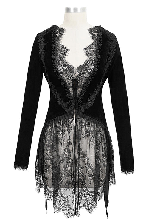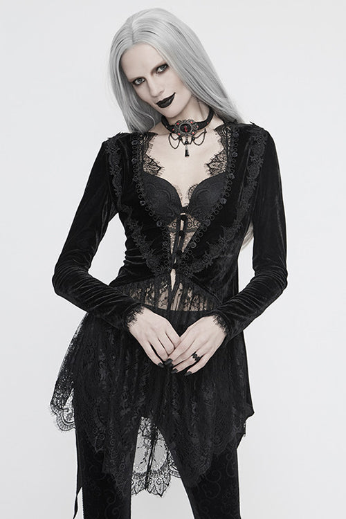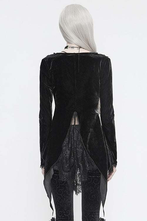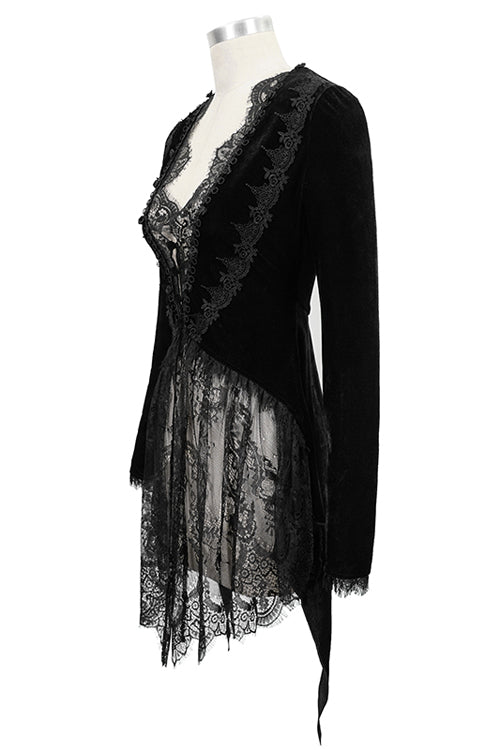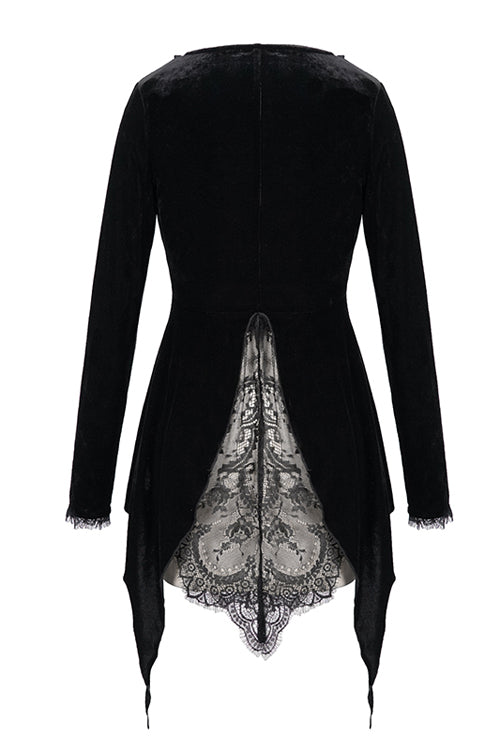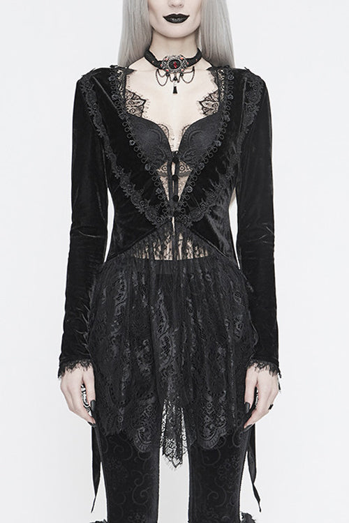 ベルベット生地を花柄のレース生地とつなぎ合わせてニットジャケットにし、後ろのダブテールにレースの裾を付けています。