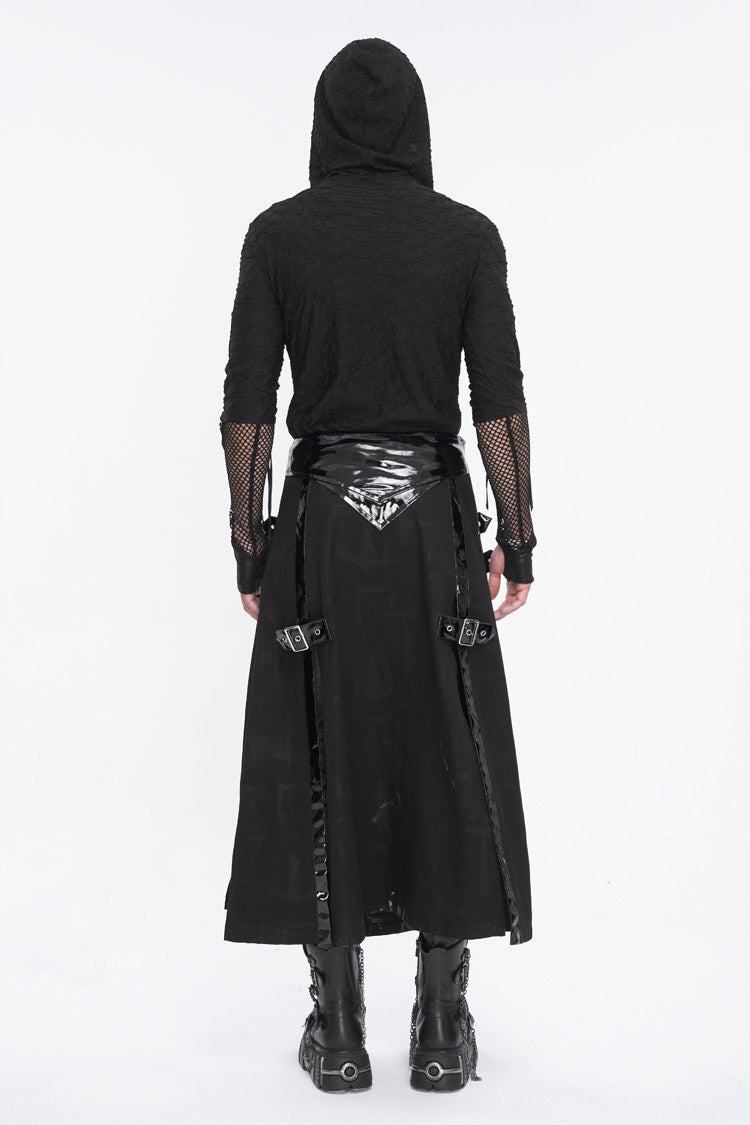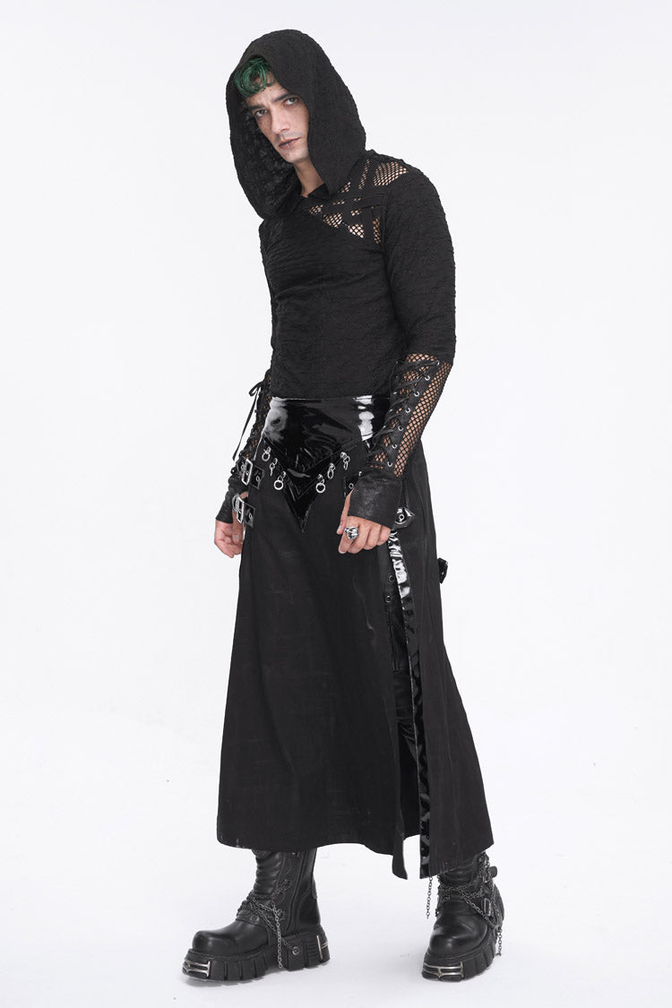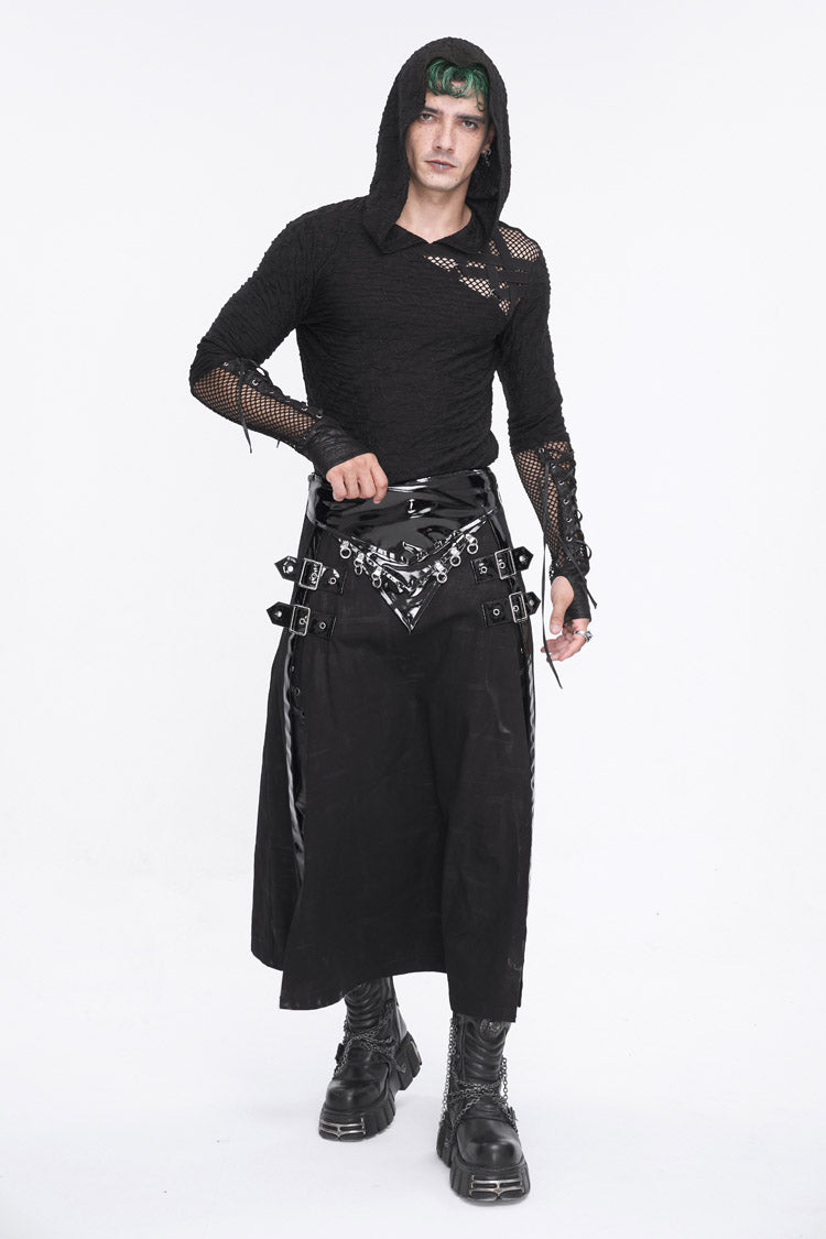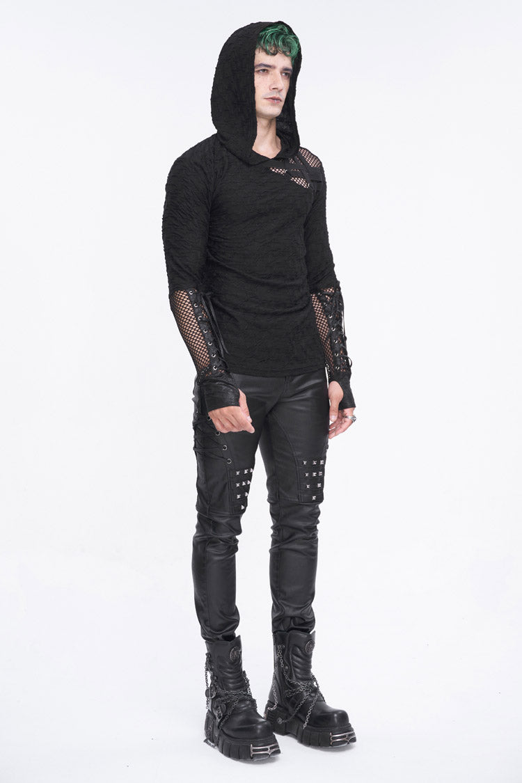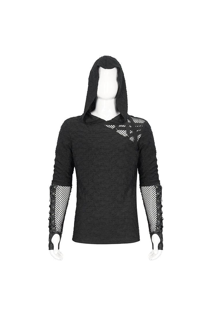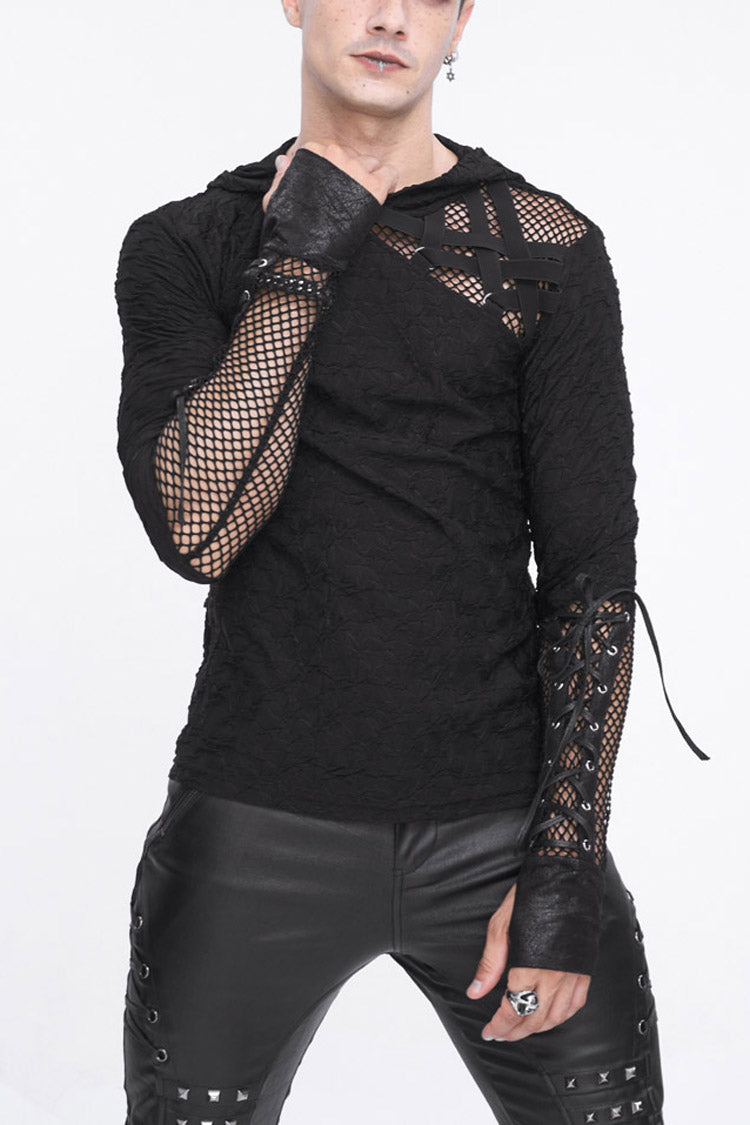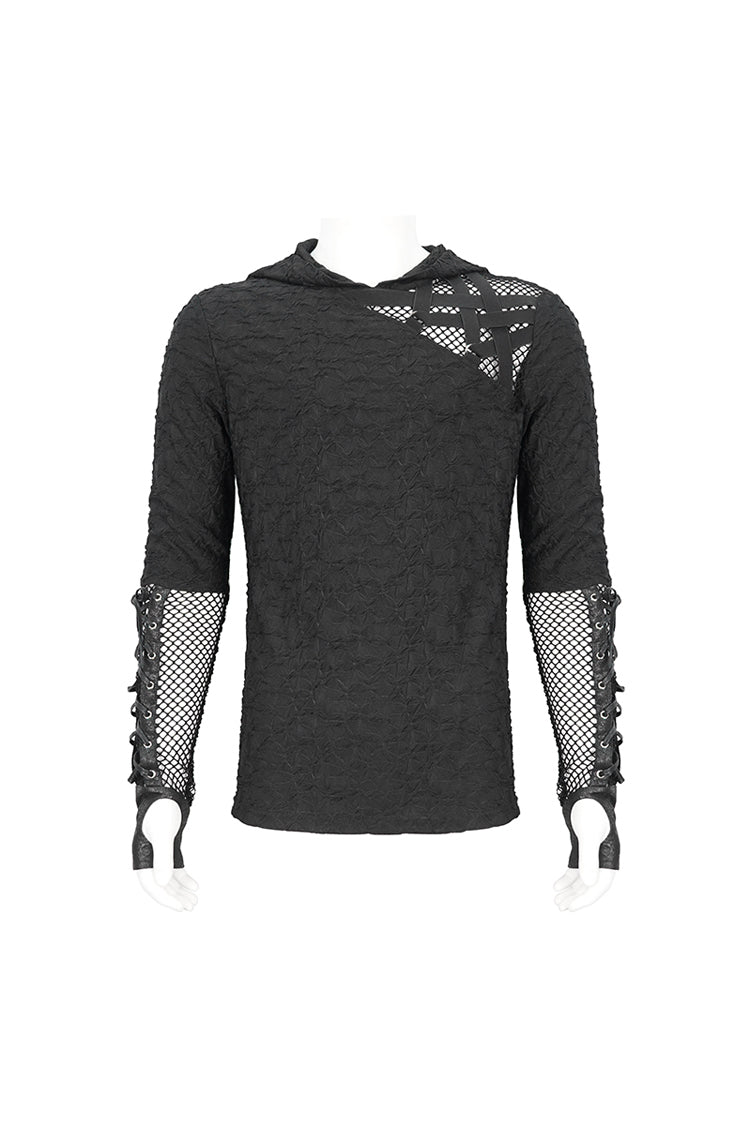 袖にメッシュをパッチワークしたパンクパーカーです。左肩に複数のゴムバンドとメッシュのパッチワーク。袖にはレースアップとくり抜きが施されています。伸縮性の良い生地。