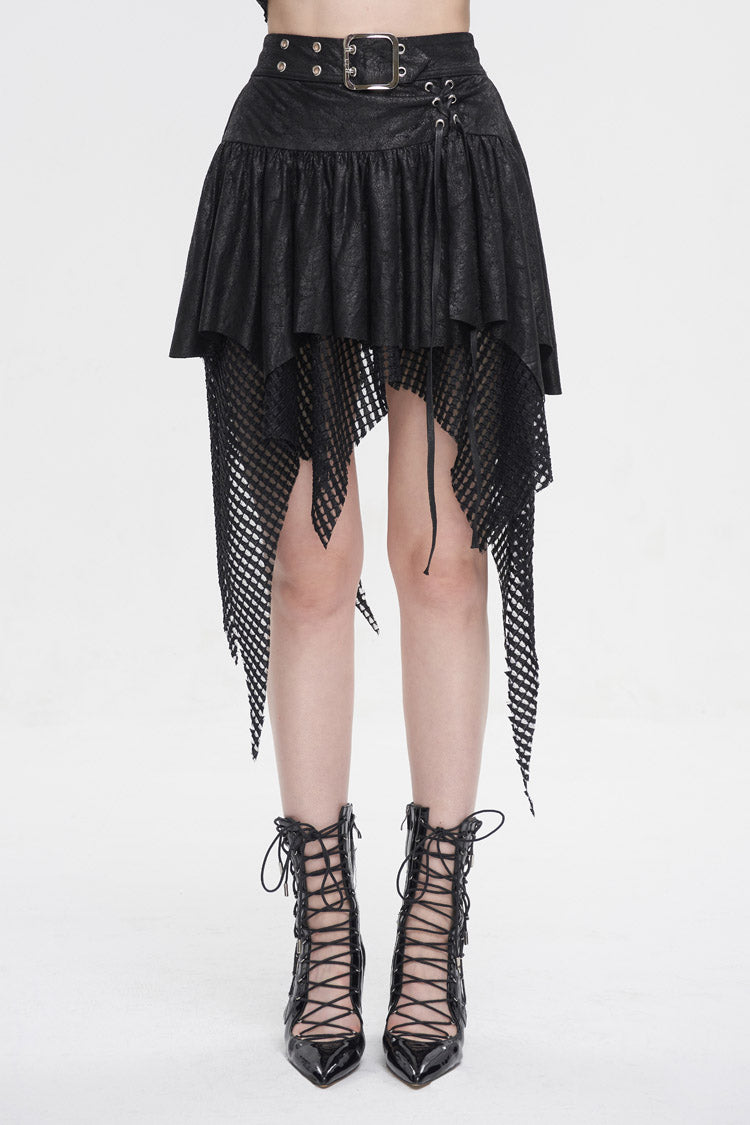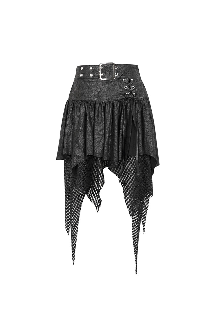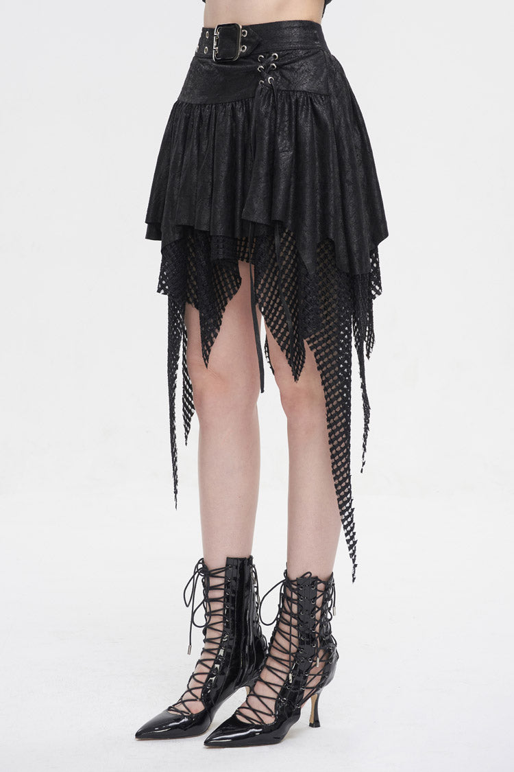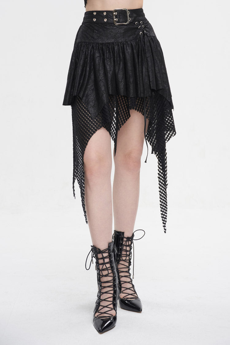 パチパチ生地とメッシュのパッチワークを組み合わせたイレギュラーゴシックスカート。ウエストには調整用の大きなバックルとゴムバンドが付いています。左側はレースアップ、裾はドレープになっています。 2色ご用意しております。