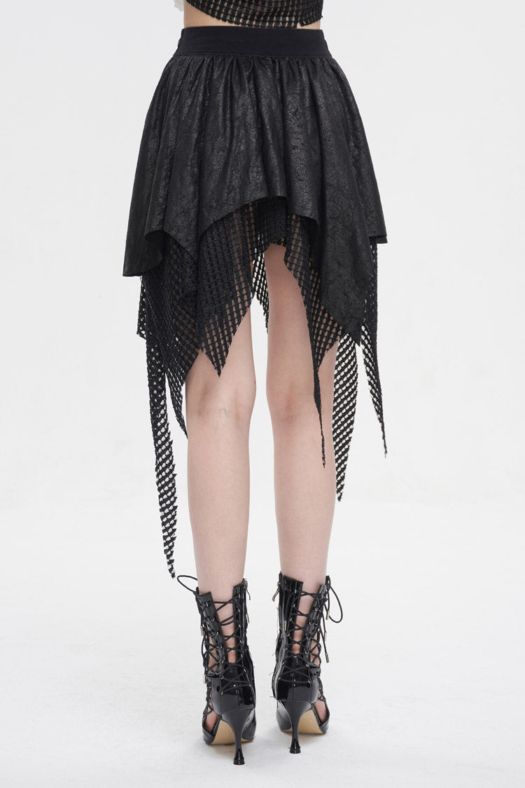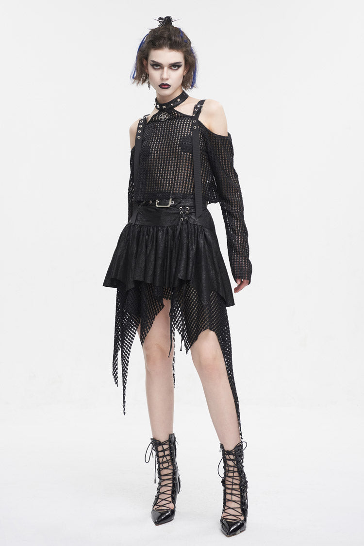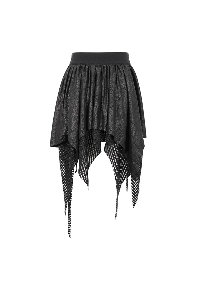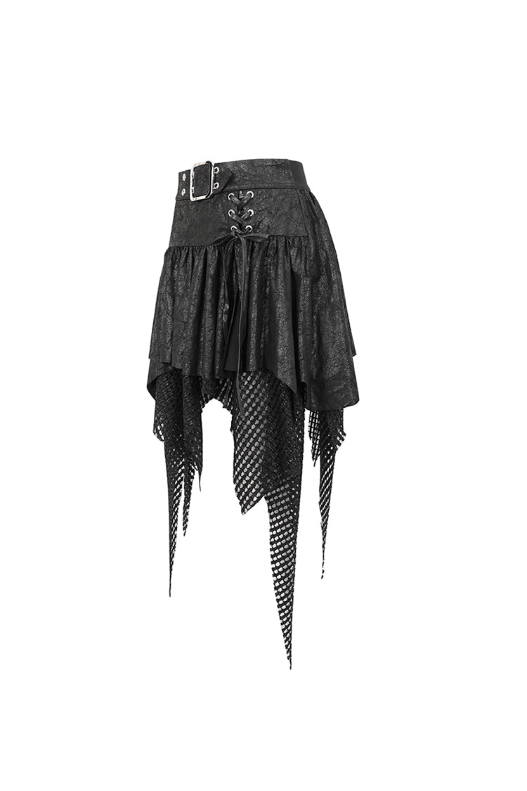 パチパチ生地とメッシュのパッチワークを組み合わせたイレギュラーゴシックスカート。ウエストには調整用の大きなバックルとゴムバンドが付いています。左側はレースアップ、裾はドレープになっています。 2色ご用意しております。
