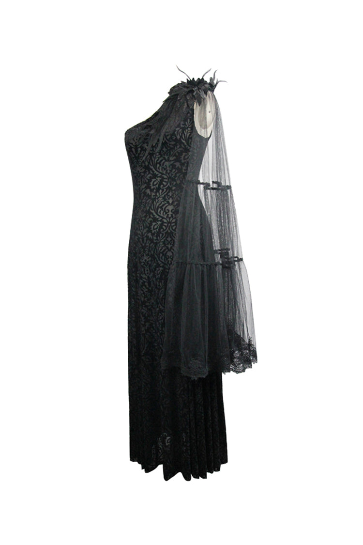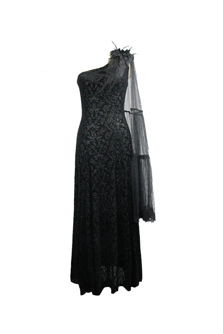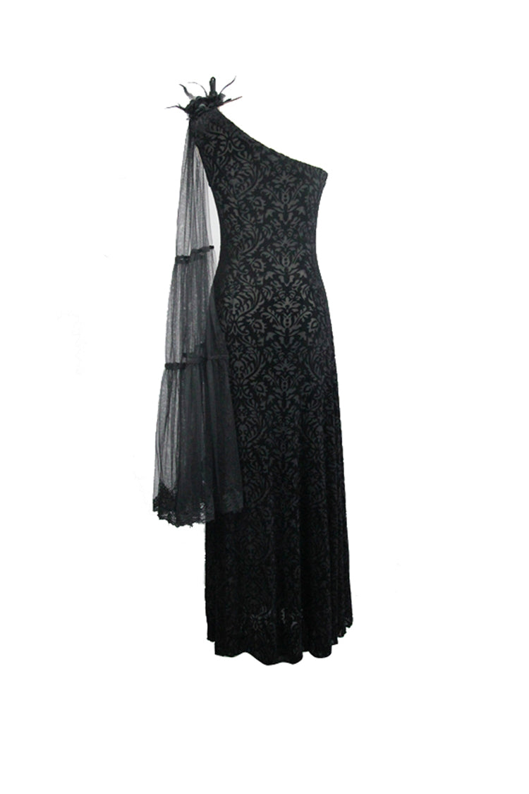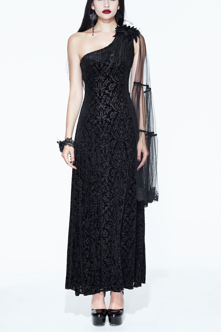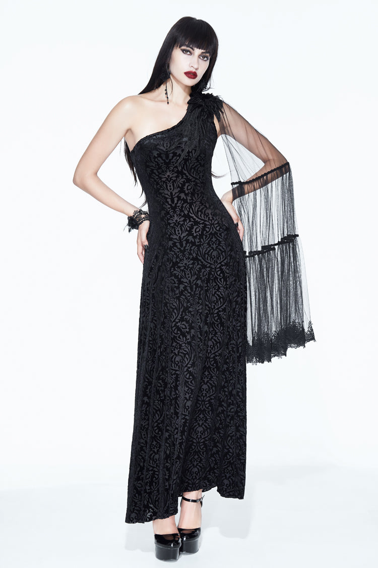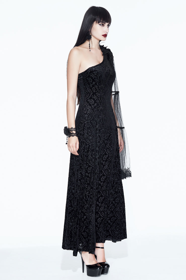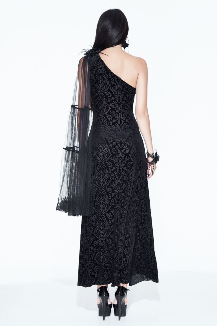 伸縮性のあるダークパターンのベルベット生地をワンショルダーのロングドレスとしてデザインしました。
