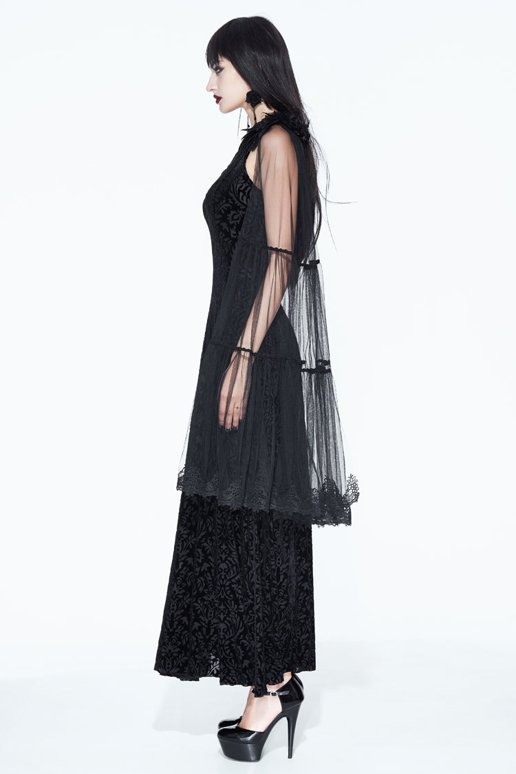 ワンショルダーのケープはメッシュ素材を使用し、肩部分には立体的なフェザーレースとお花を飾りました。