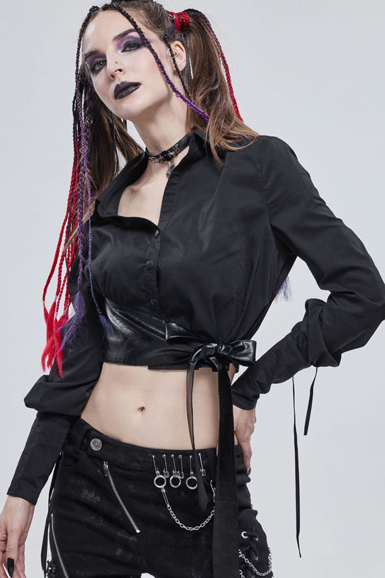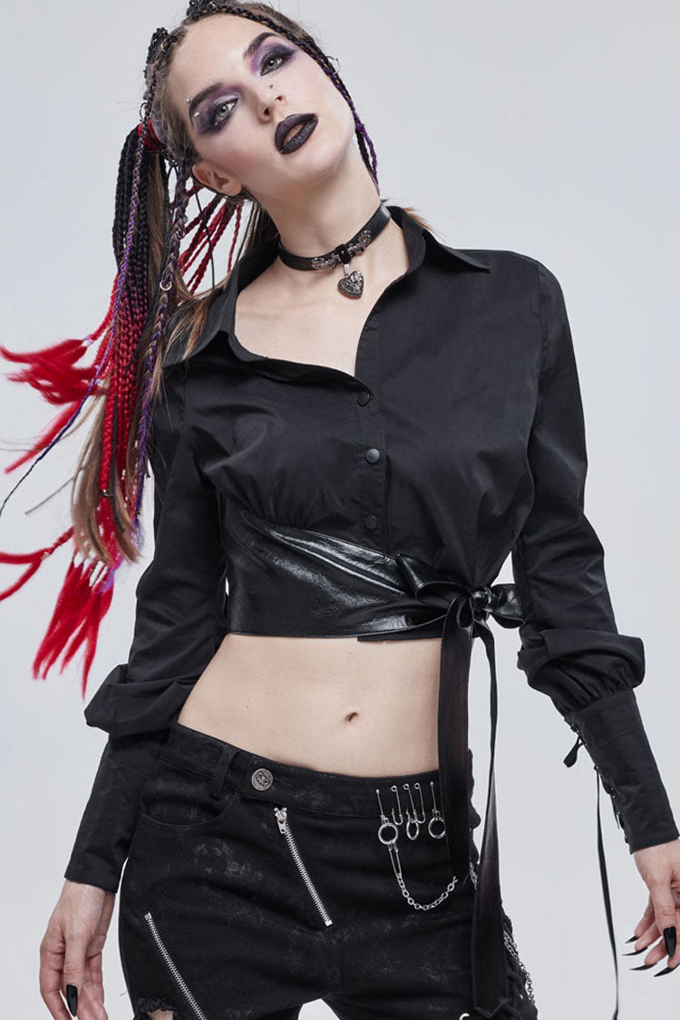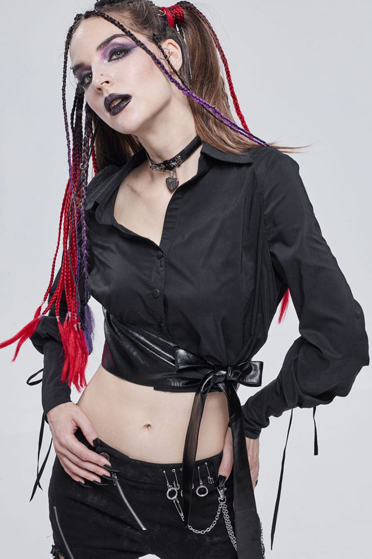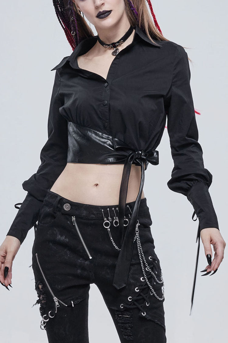 非対称の襟、小さなバルーンスリーブ、コード付きの袖口。フロントの裾はサイドの結び目までレザーでパネル化されています。