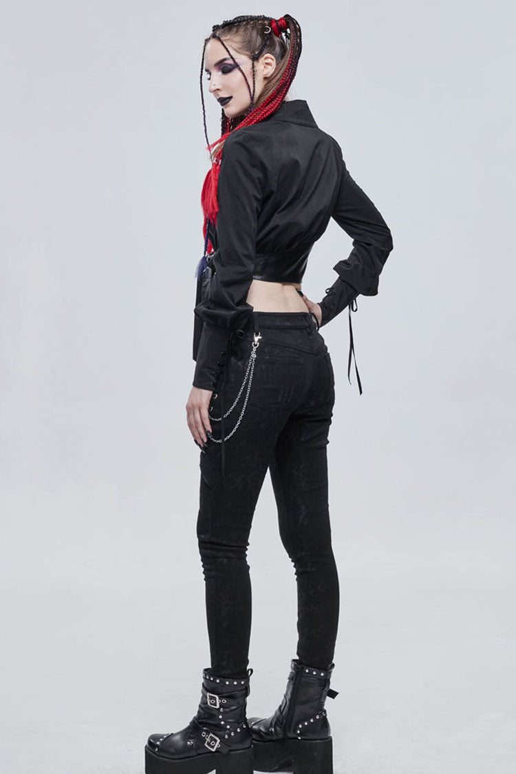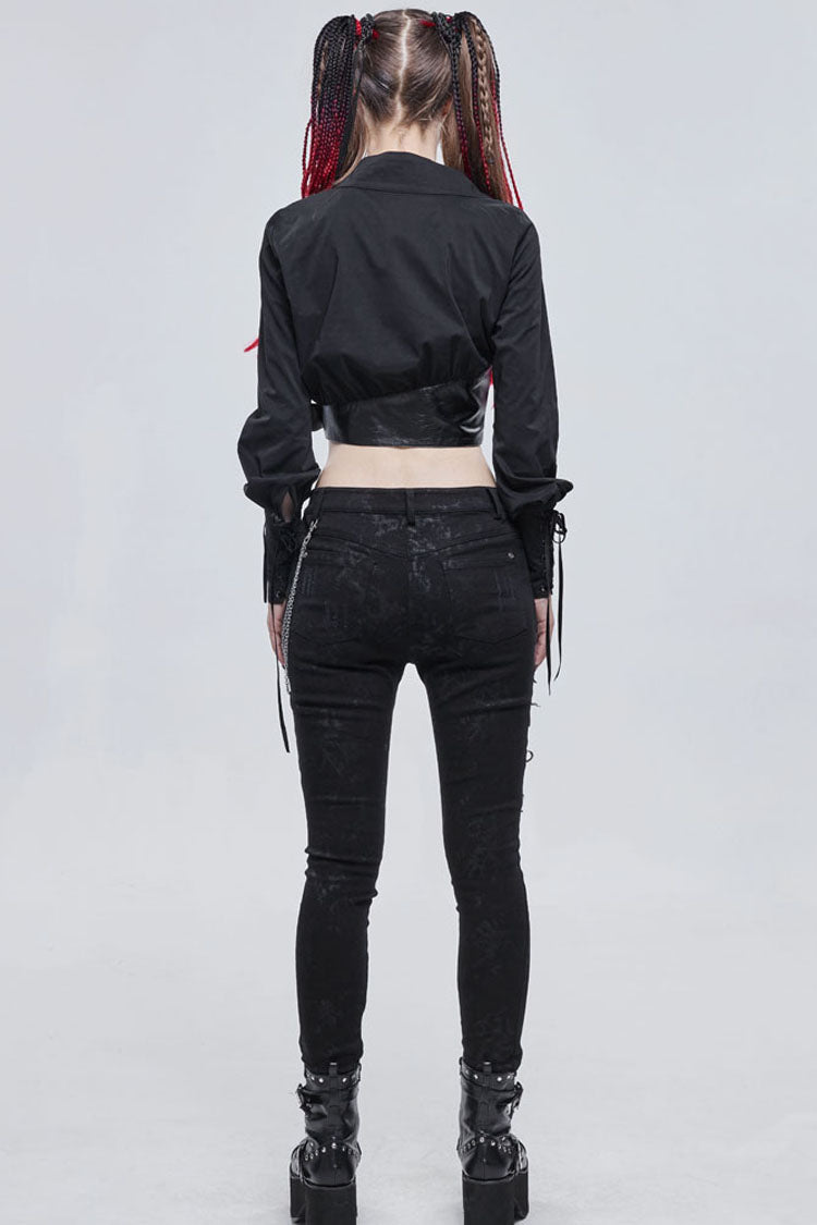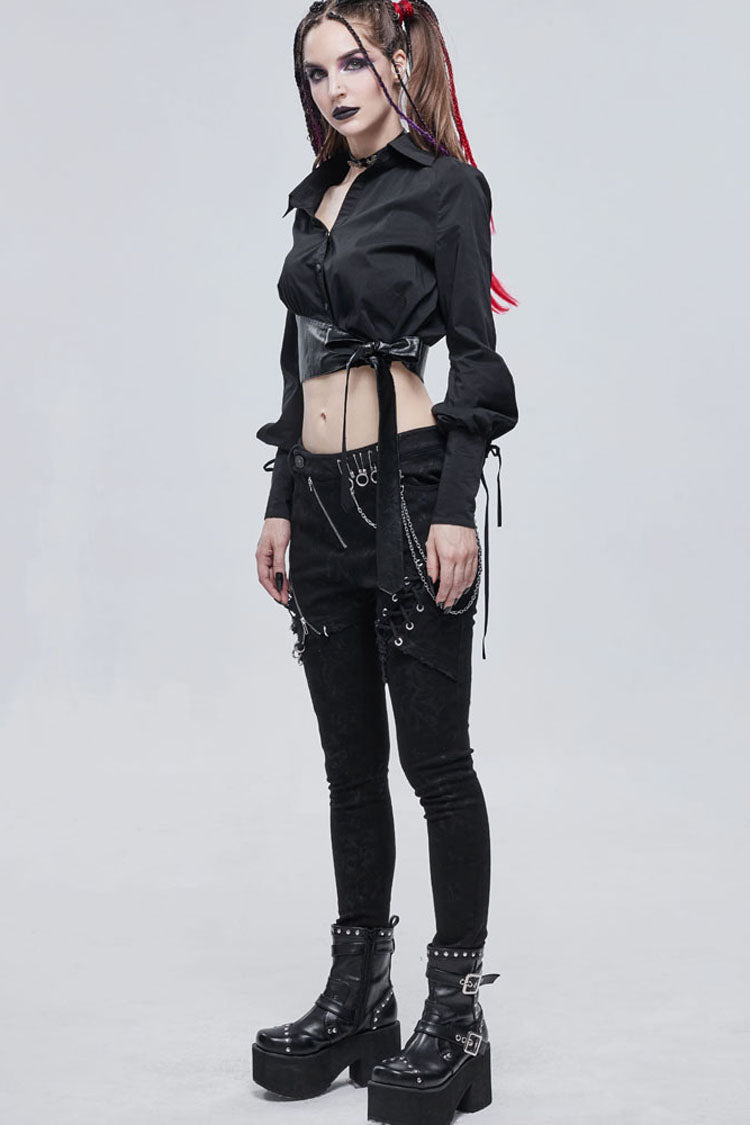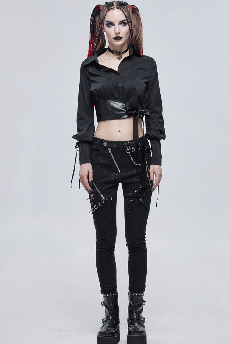 非対称の襟、小さなバルーンスリーブ、コード付きの袖口。フロントの裾はサイドの結び目までレザーでパネル化されています。