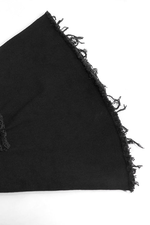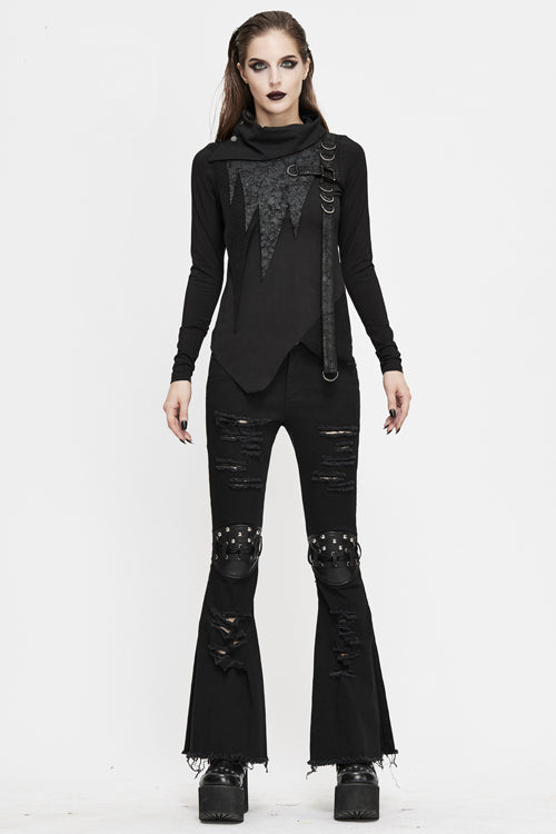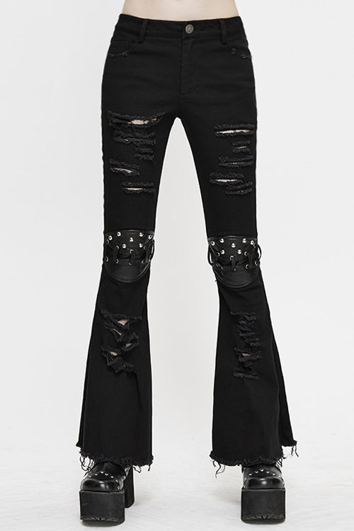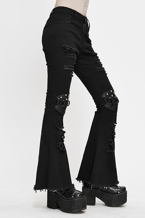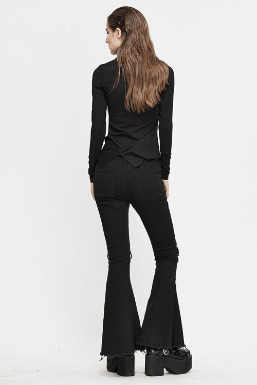 メイン素材には伸縮性のあるツイル素材を使用し、パンツ全体は着古したような左右非対称のカッティングを施し、膝部分にロープで結ぶデザイン、膝部分にネイル装飾を施し、ベルボトムには粗いセルビッジを施しています。