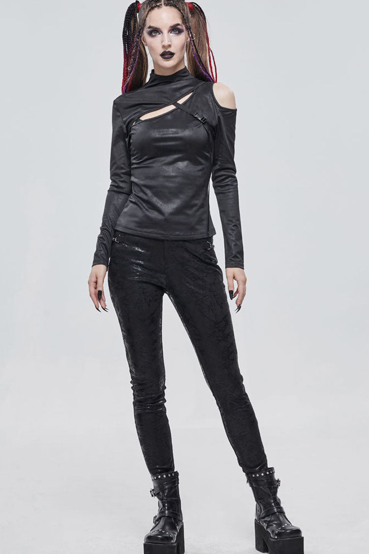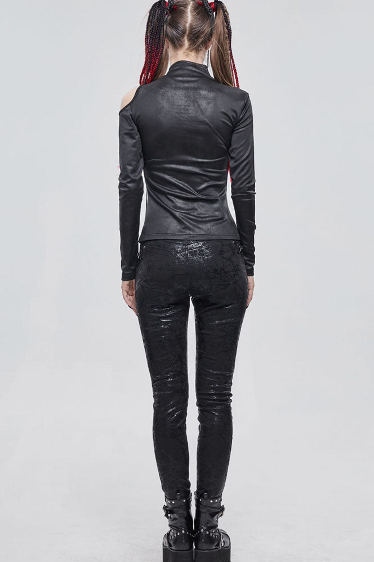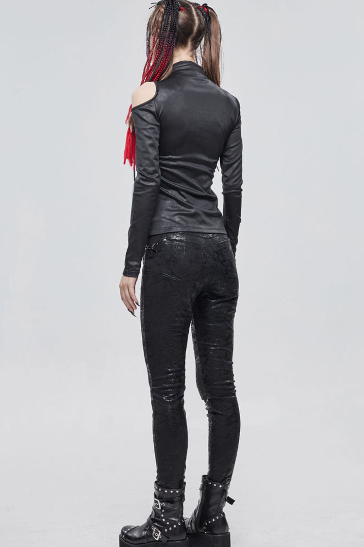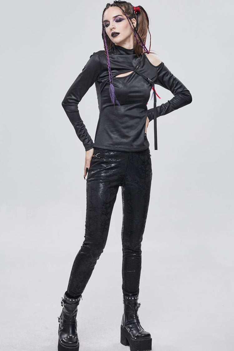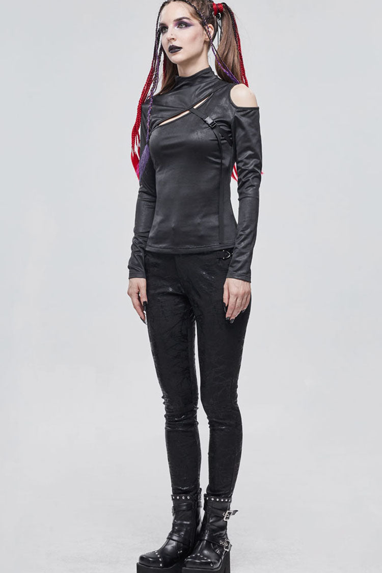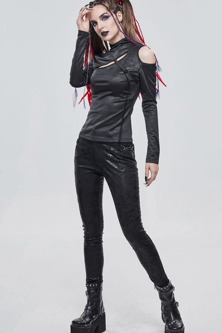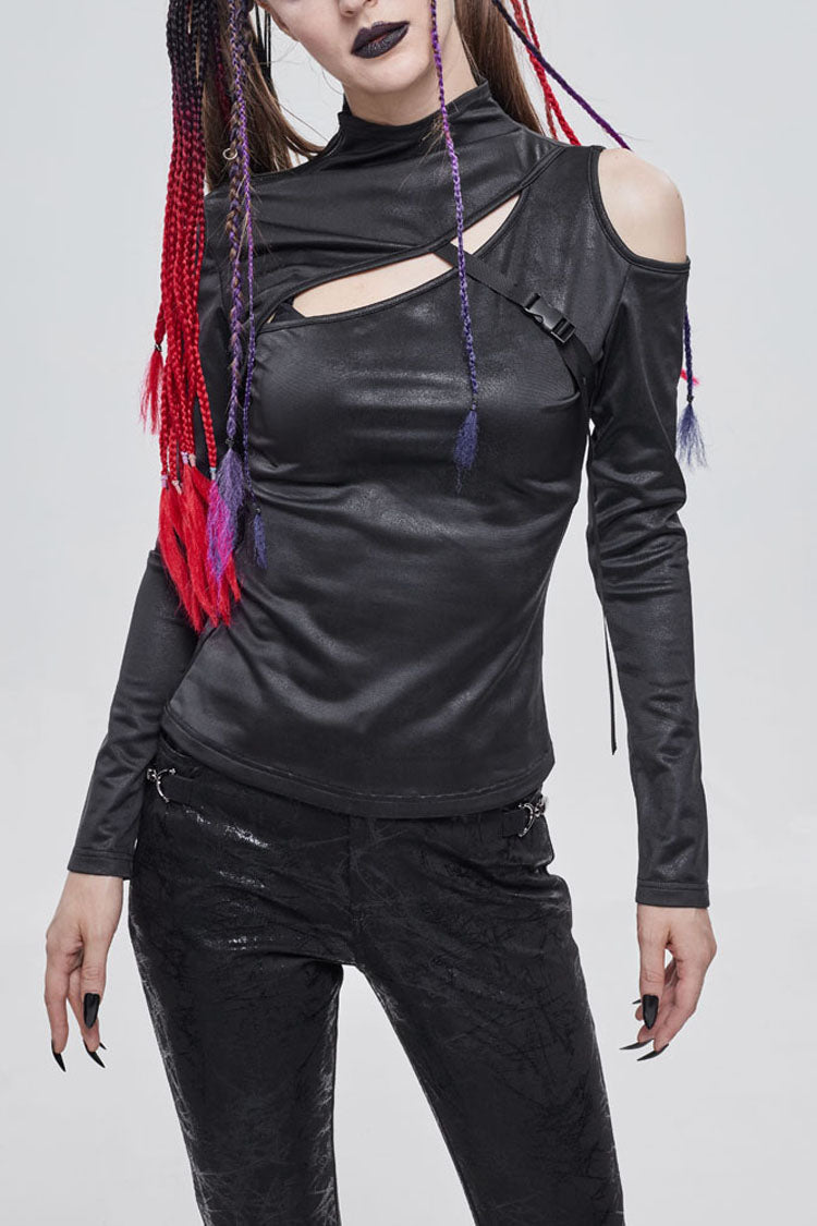 メイン生地はひび割れ伸縮性のあるニット素材を使用し、前胸部は半分露出した胸部に分割され、斜めに挿入されたバックルベルトが装飾され、腕は半分露出された肩に分割されています。ハイネックのサイドにはジッパーが付いています。