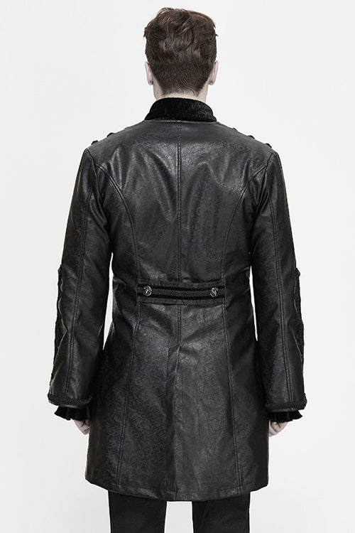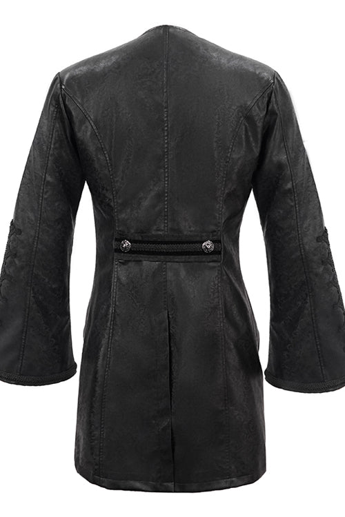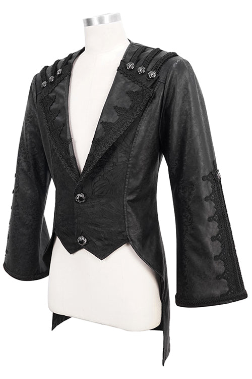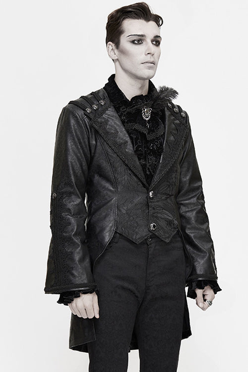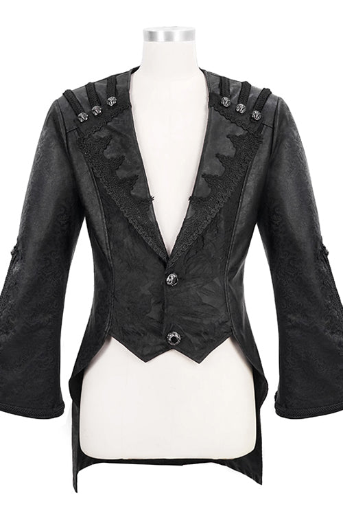 メインファブリックにはダークグレインレザーを使用し、立体感のあるジャガード素材を貼り合わせています。前が短く後ろが長く、袖が広い、フィットしたバージョンです。立体的に編み上げたリボンの肩と衿を金属模様の装飾バックルで繋ぎ、衿面と袖にはアップリケレース飾りを施しております。内ポケットも付いています。