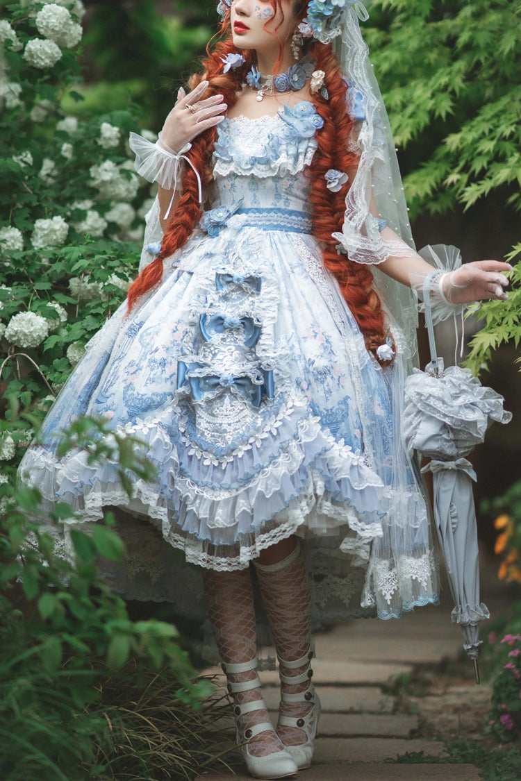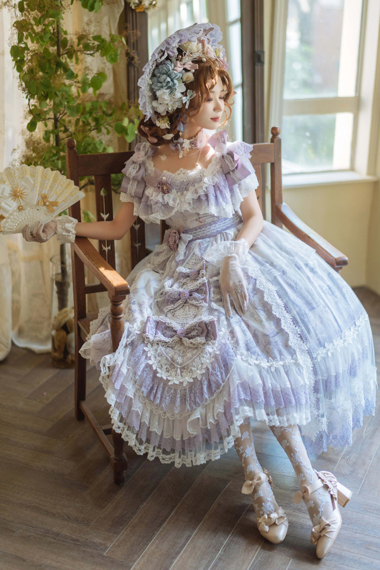 内容:ドレス + 肩の取り外し可能な蝶結び + 花柄のブローチ + ウエストに花柄の蝶結び + フロントスカートの 3 本のリボン + ワイドサッシュ + ボンネット + チョーカー + ベール。