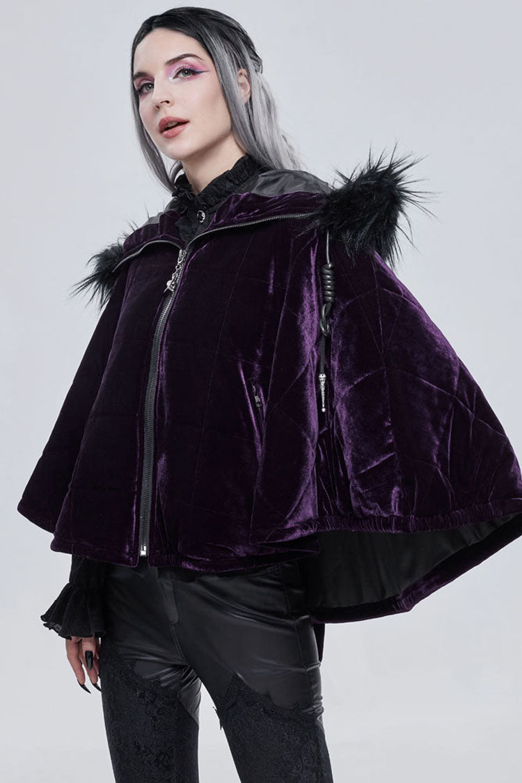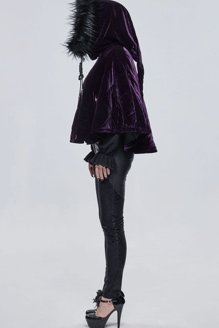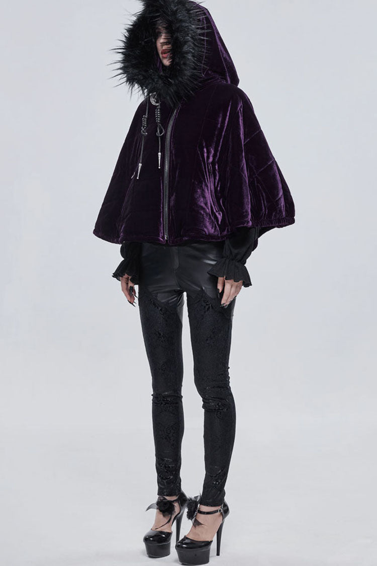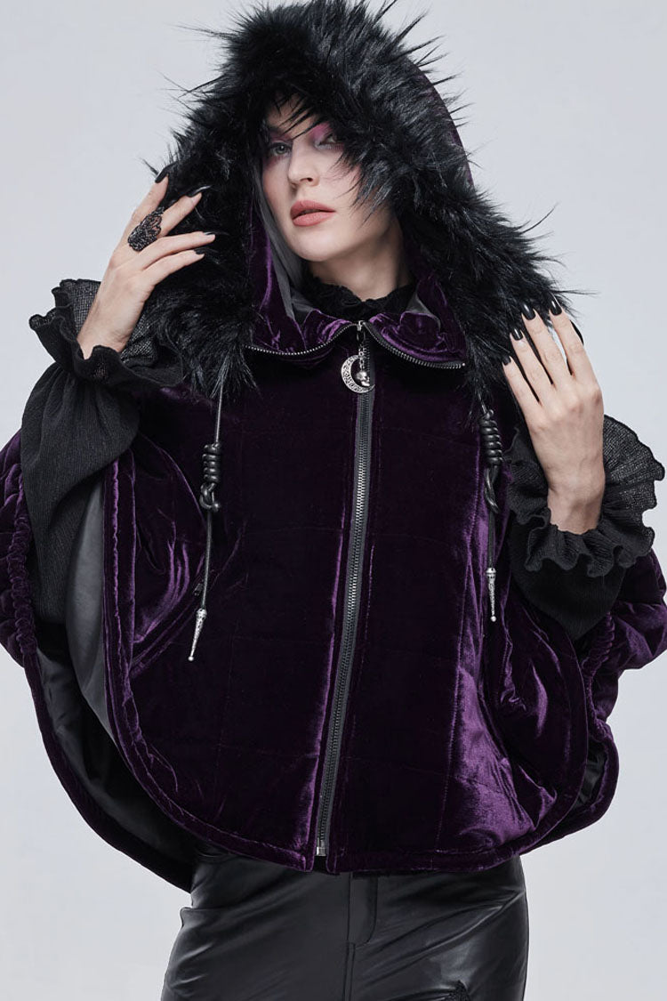 全体は紫色のベルベット生地で作られており、内側に綿格子が織り込まれており、保温性を高めています。誇張された襟の形状で、顎を覆うようにジッパーを引くことができ、帽子のロープは特別な結び方を使用し、プルタブは月と幽霊の形をした金属で作られています。