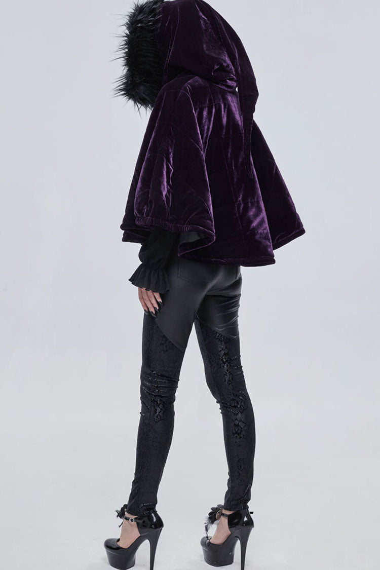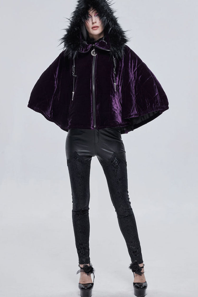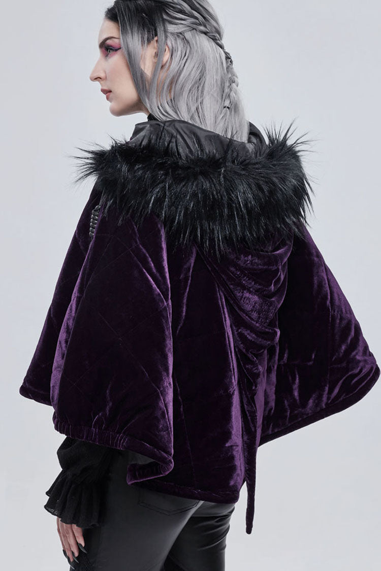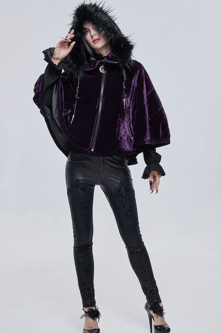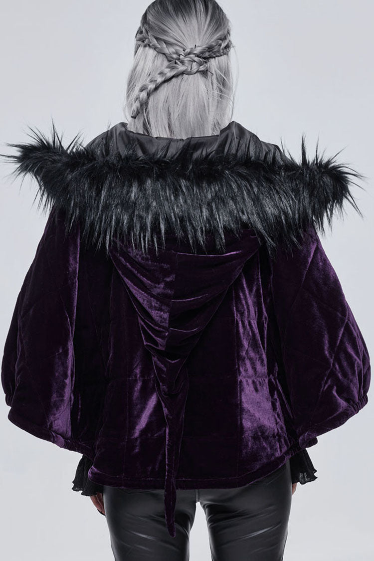 全体は紫色のベルベット生地で作られており、内側に綿格子が織り込まれており、保温性を高めています。誇張された襟の形状で、顎を覆うようにジッパーを引くことができ、帽子のロープは特別な結び方を使用し、プルタブは月と幽霊の形をした金属で作られています。