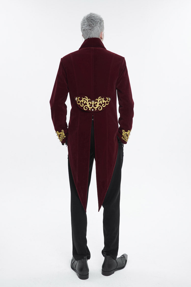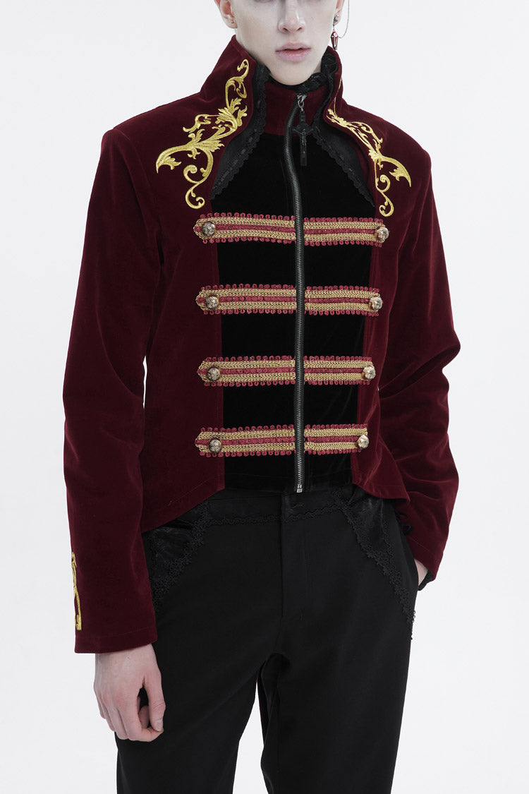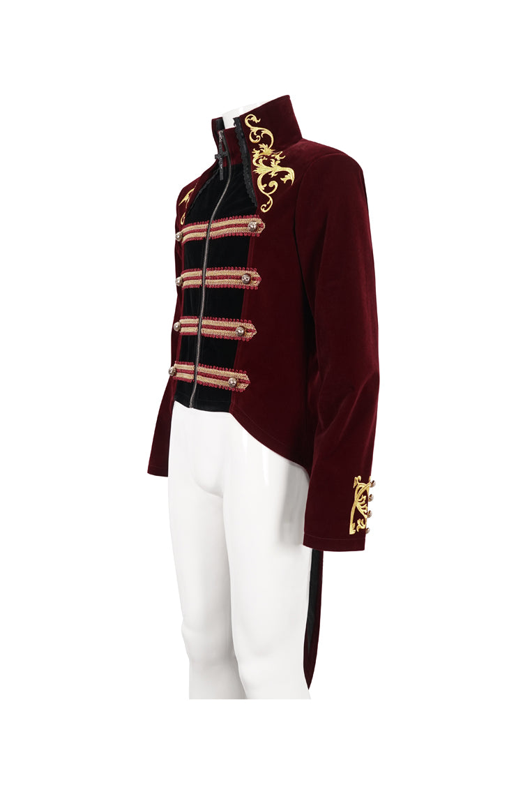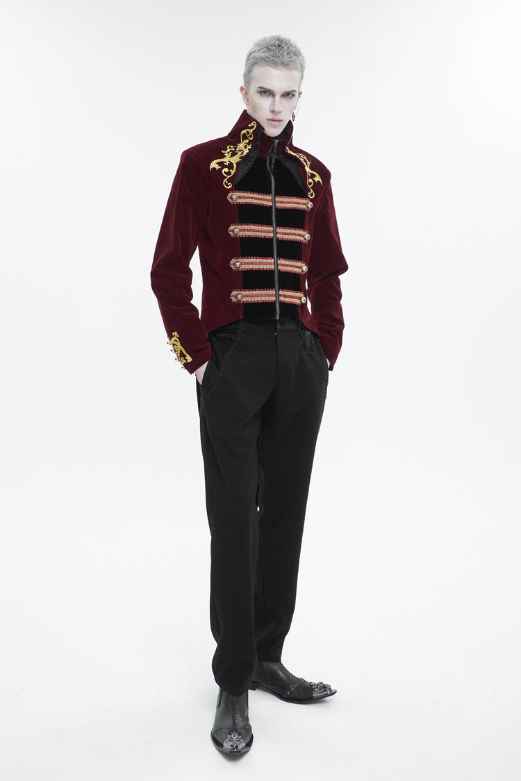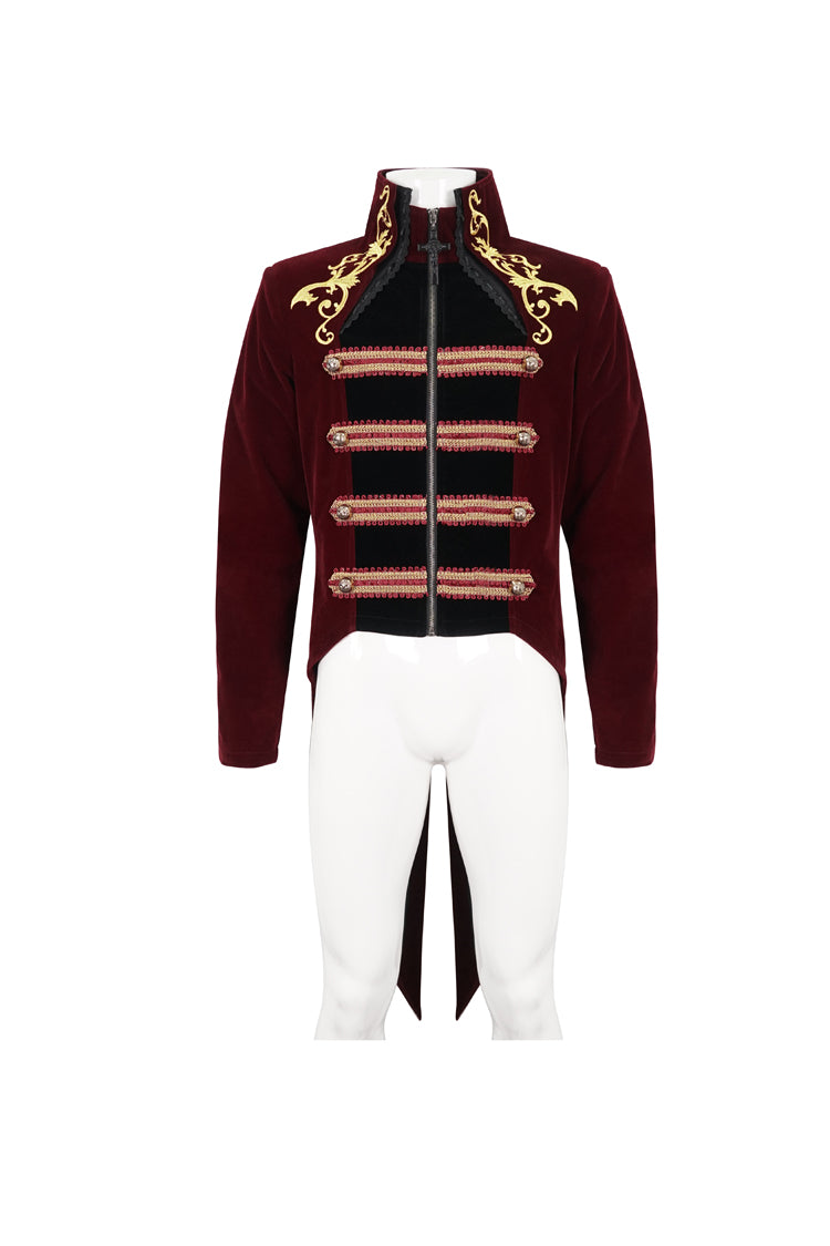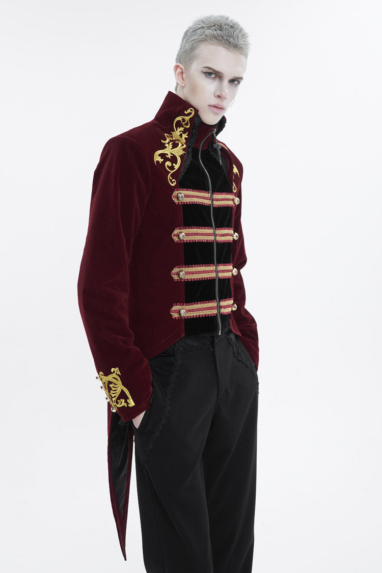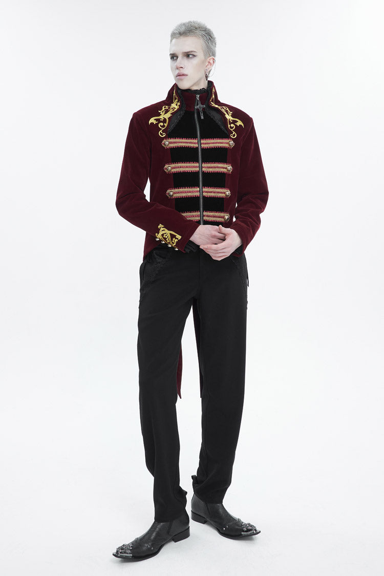 スタンドカラーとコントラストカラーがポイントのゴシックコート。肩、袖口、背中にトーテム刺繍が施されています。開閉用のクロスジッパー。細部までこだわった飾りボタン。背中のスワローテールとスリムフィットのシルエット。