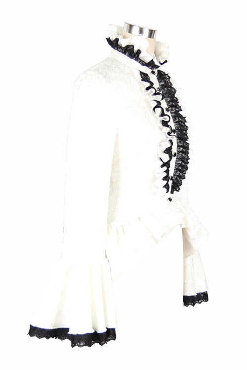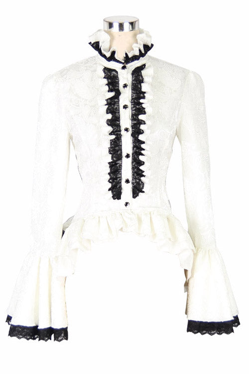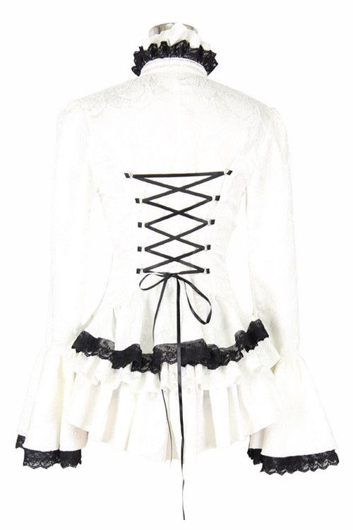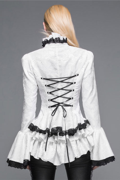 全体にホワイトのペイズリージャガード生地を使用しています。前が短くて後ろが長いです。バックは多層のフラウンスと黒のレースで裾を作り、フレアカフ、フロントセンターには黒とシルバーのゴシックパターンのバックルを使用しました。