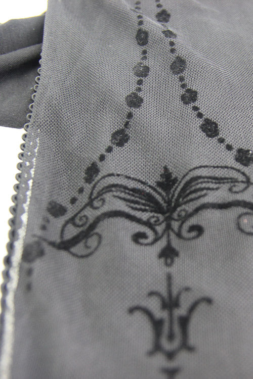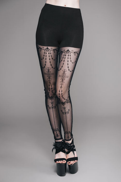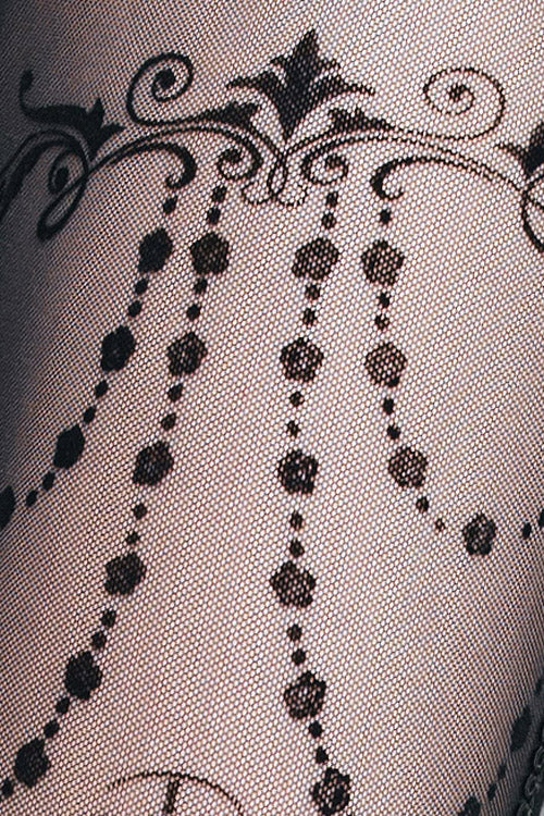 Front thighs transparent stretchy net with flocking printed bead chain pattern, the rest part is made of the stretchy pure cotton knitted fabric, waistband rubber band with diamond pattern jacquard.