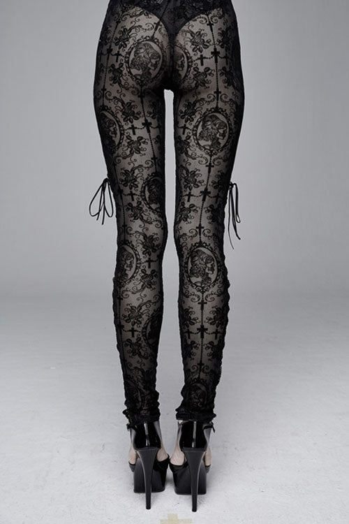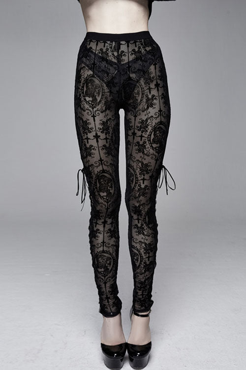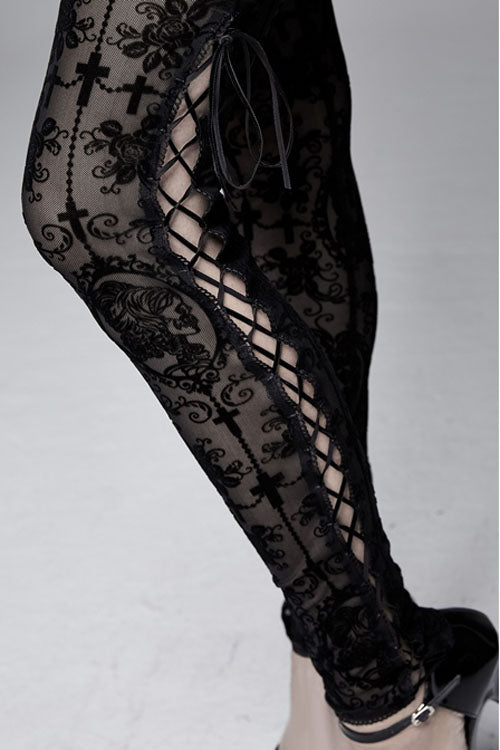Black net printed with black queen flocking pattern, side slits and tied the rope can adjust the circumference.The waist with elastic rubber string waistband.