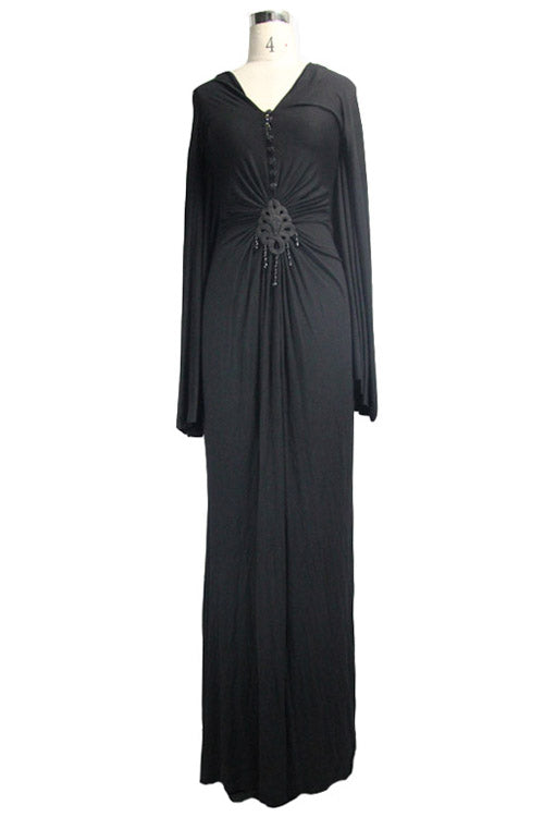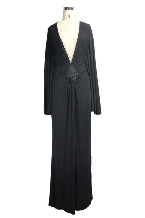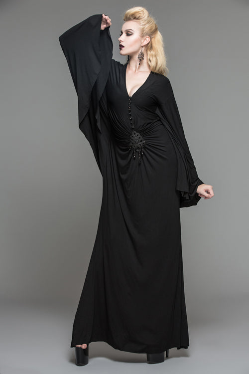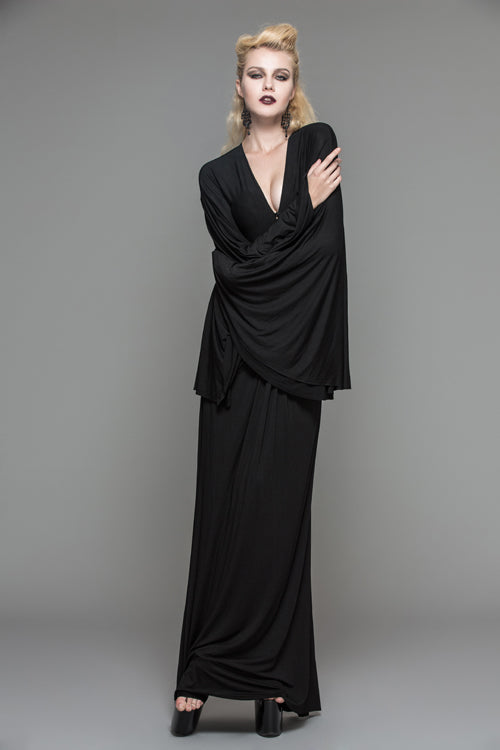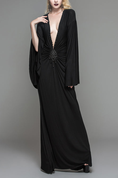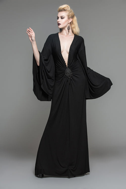 The whole dress is made of 40 Modal fabric and is designed into a long-sleeved dress with deep V neck and bat sleeves. The neckline has a rose button, which can adjust the height and size of the neckline by yourself. The waist is decorated with a frog button.