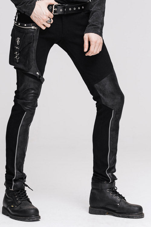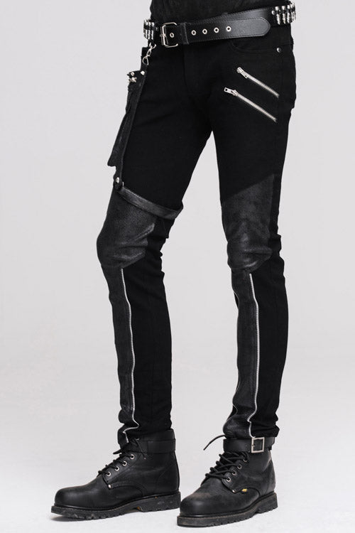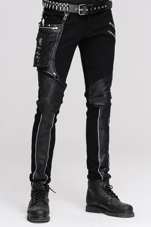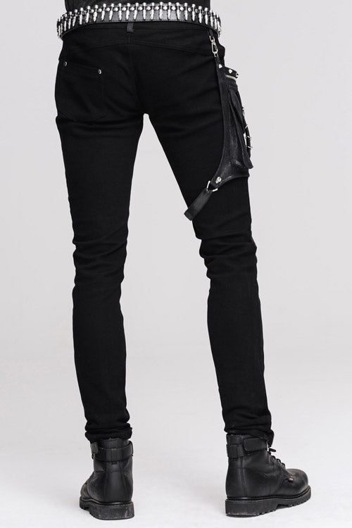 The main fabric is made of black elastic twill fabric. The leg bag and the front leg are stitched with black ironing glued fabric. The leg bag is decorated with intersection and metal rings,which is detachable.Suitable for everyday and party wear.