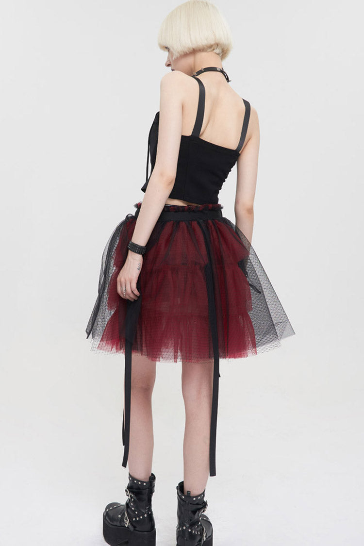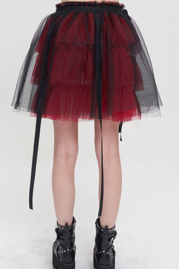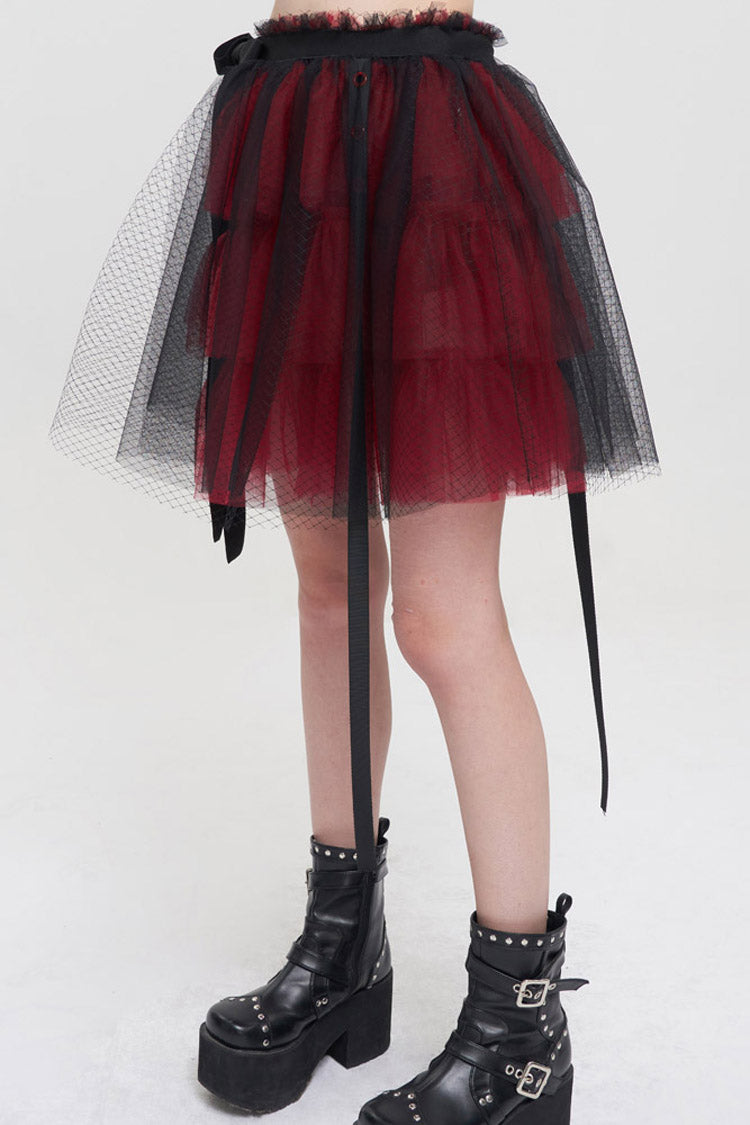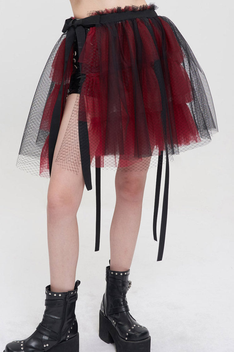 The main fabric is made of red ruffled mesh material with black mesh material. Elastic waistband, one-piece fit, worn over shorts.